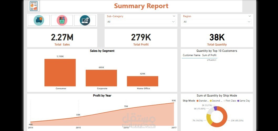ملخص تنفيذي يعرض أهم مؤشرات الأداء (المبيعات، الربح، الكميات).