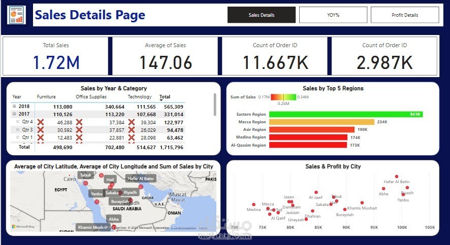 تم تصميم لوحة معلومات تفاعلية باستخدام Power BI لتحليل بيانات مبيعات شركة تجزئة تعمل في عدة مناطق داخل السعودية.