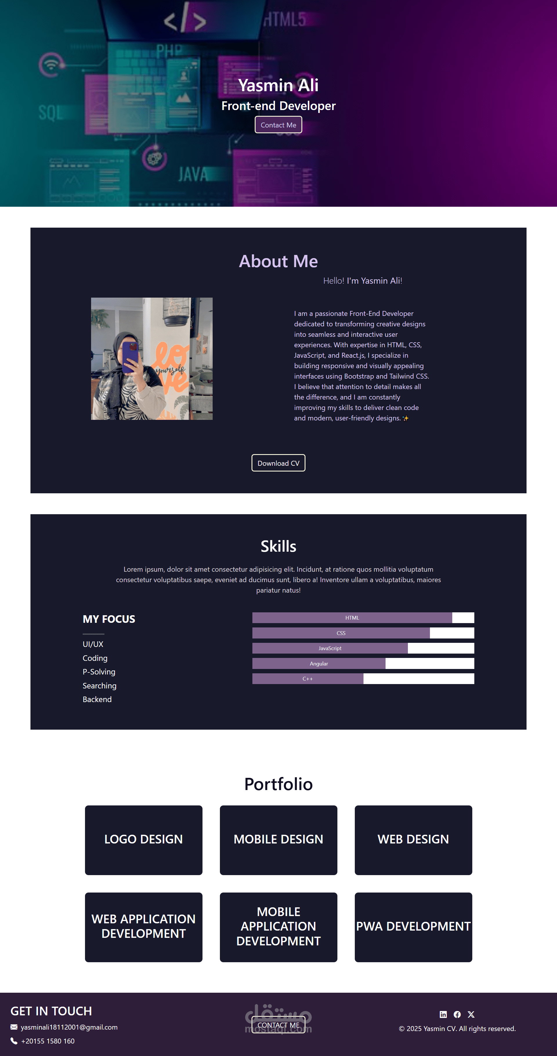 قمت بتطوير موقع بورتفوليو شخصي يعكس هويتي كمطوّرة واجهات أمامية باستخدام مكتبة React. الموقع يتميز بتصميم عصري وتناسق في الألوان والعناصر، ويعرض أعمالي ومهاراتي بشكل منظم وسهل التصفح.