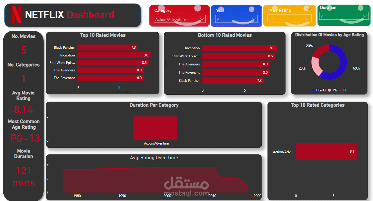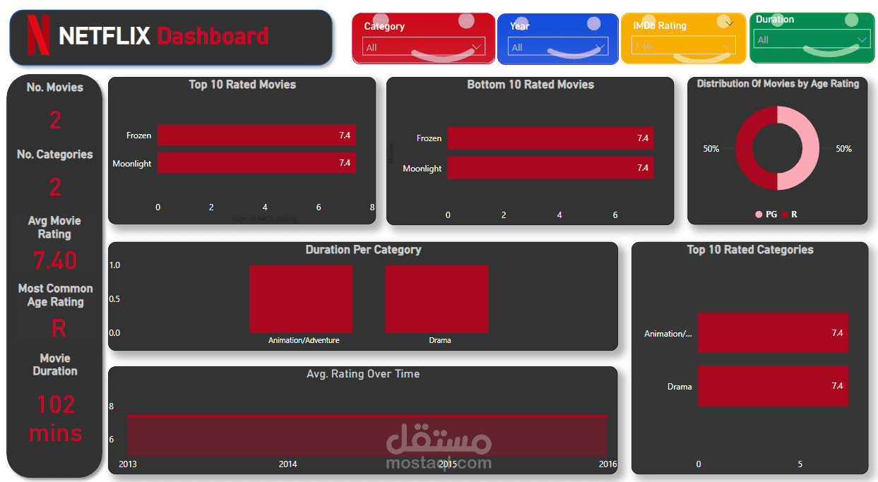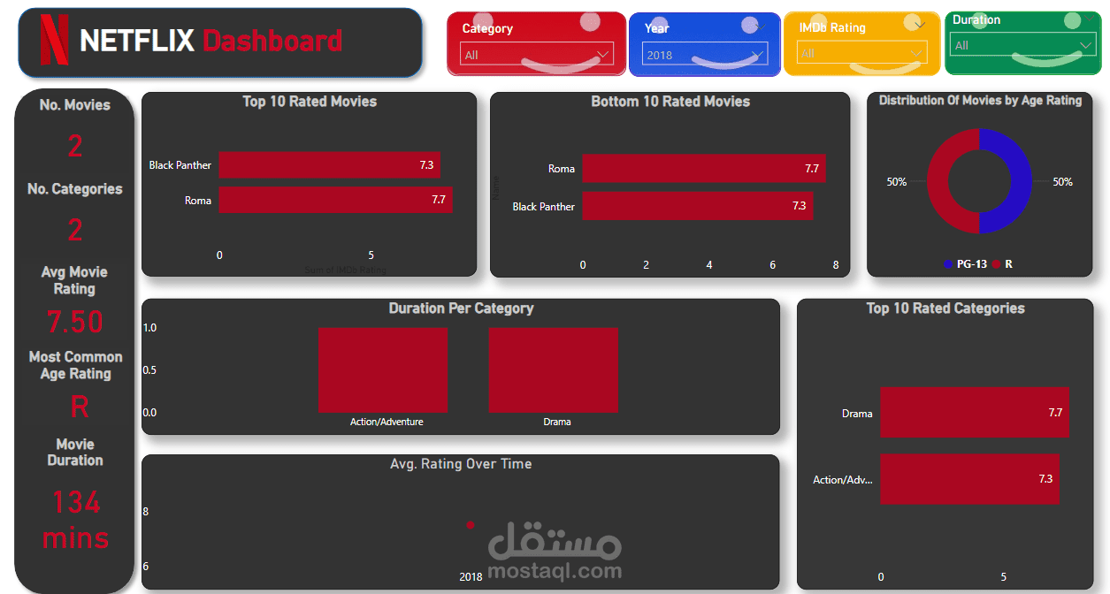 This project is a dynamic Power BI dashboard built to analyze a dataset of 50 Netflix movies. It aims to provide deep insights into movie ratings, durations, categories, and audience age restrictions.