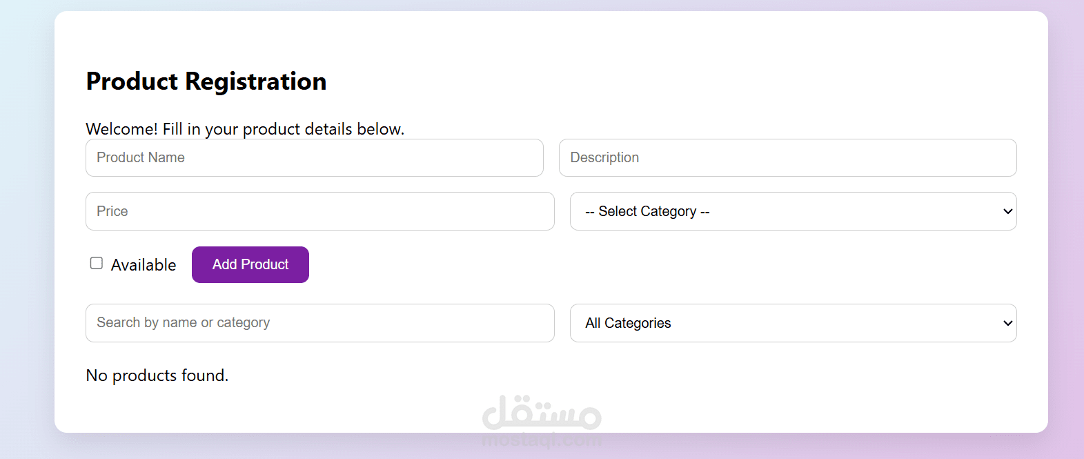 dynamic single-page application built with Angular, designed to manage products efficiently. The interface includes a responsive data table that displays products with their name, description, and availability status. Users can add new products using a form, edit existing entries, or delete them instantly — all changes are reflected in real time thanks to Angular’s two-way data binding. The design follows a component-based architecture and utilizes Angular directives and reactive forms for a smooth and interactive user experience