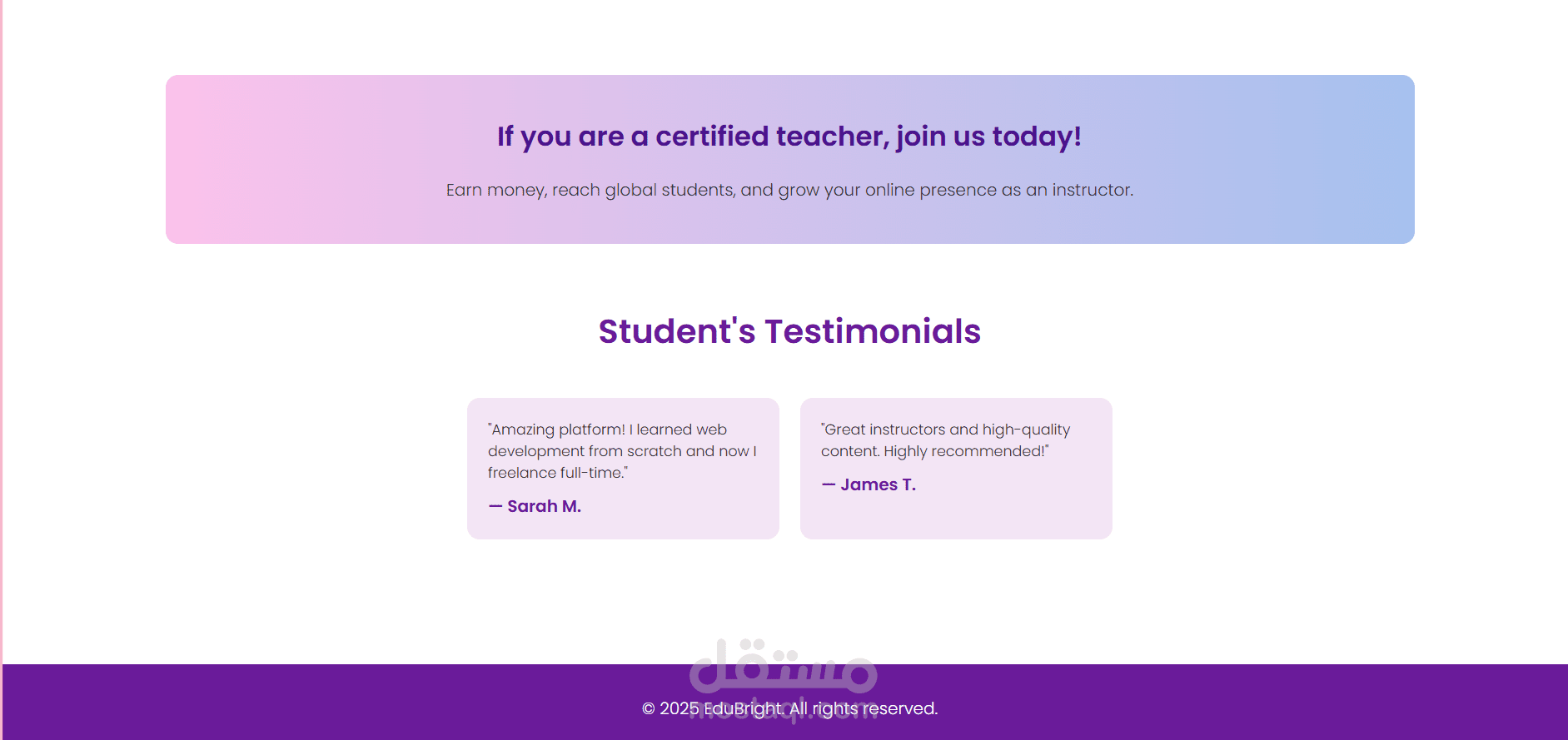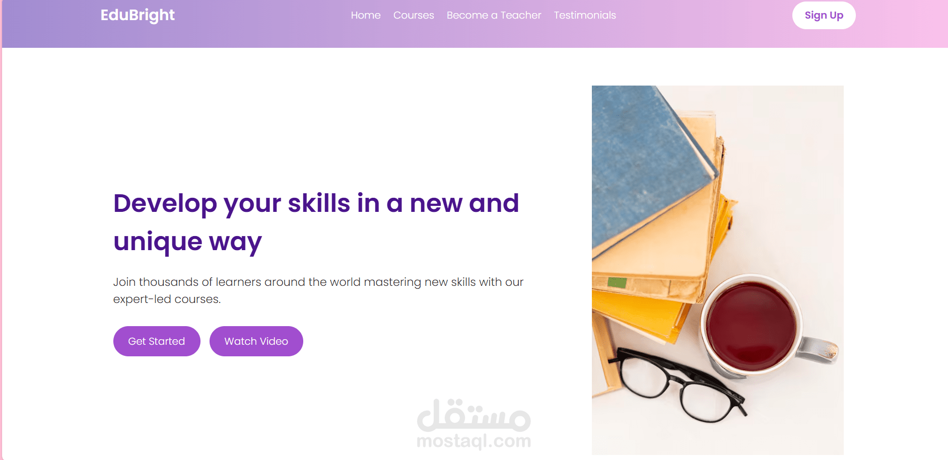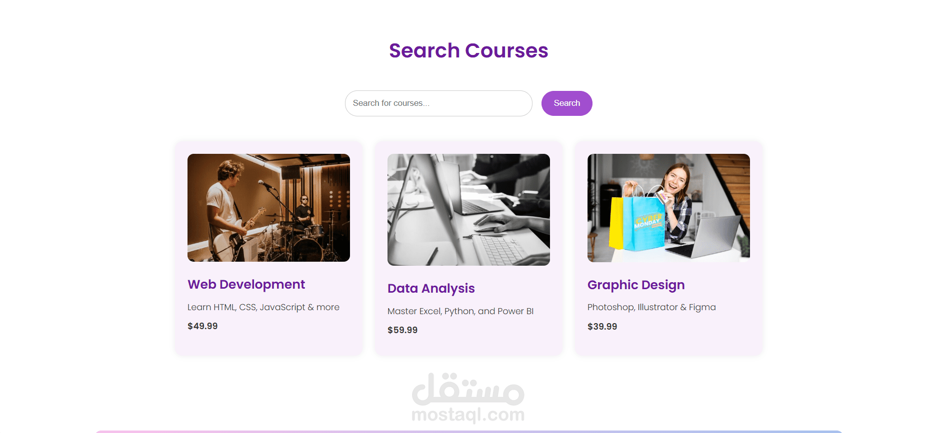 قمت بتصميم واجهة لموقع إلكتروني تعليمي يقدم دورات في مجالات متنوعة مثل البرمجة، تحليل البيانات، والتصميم الجرافيكي. تم تنفيذ التصميم باستخدام HTML وCSS و JS بألوان مريحة وتنسيق عصري متجاوب مع مختلف الشاشات.