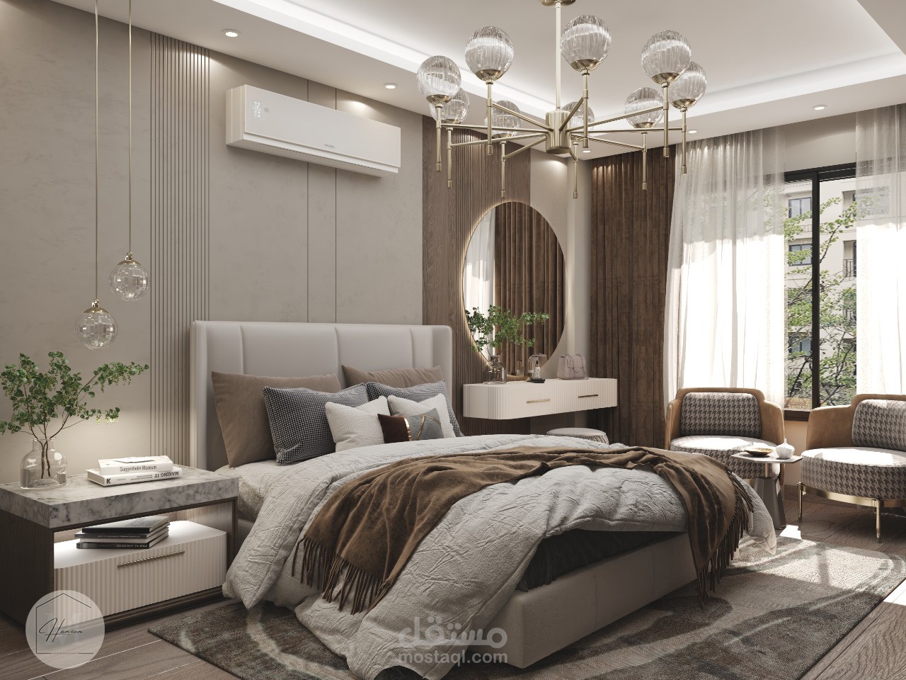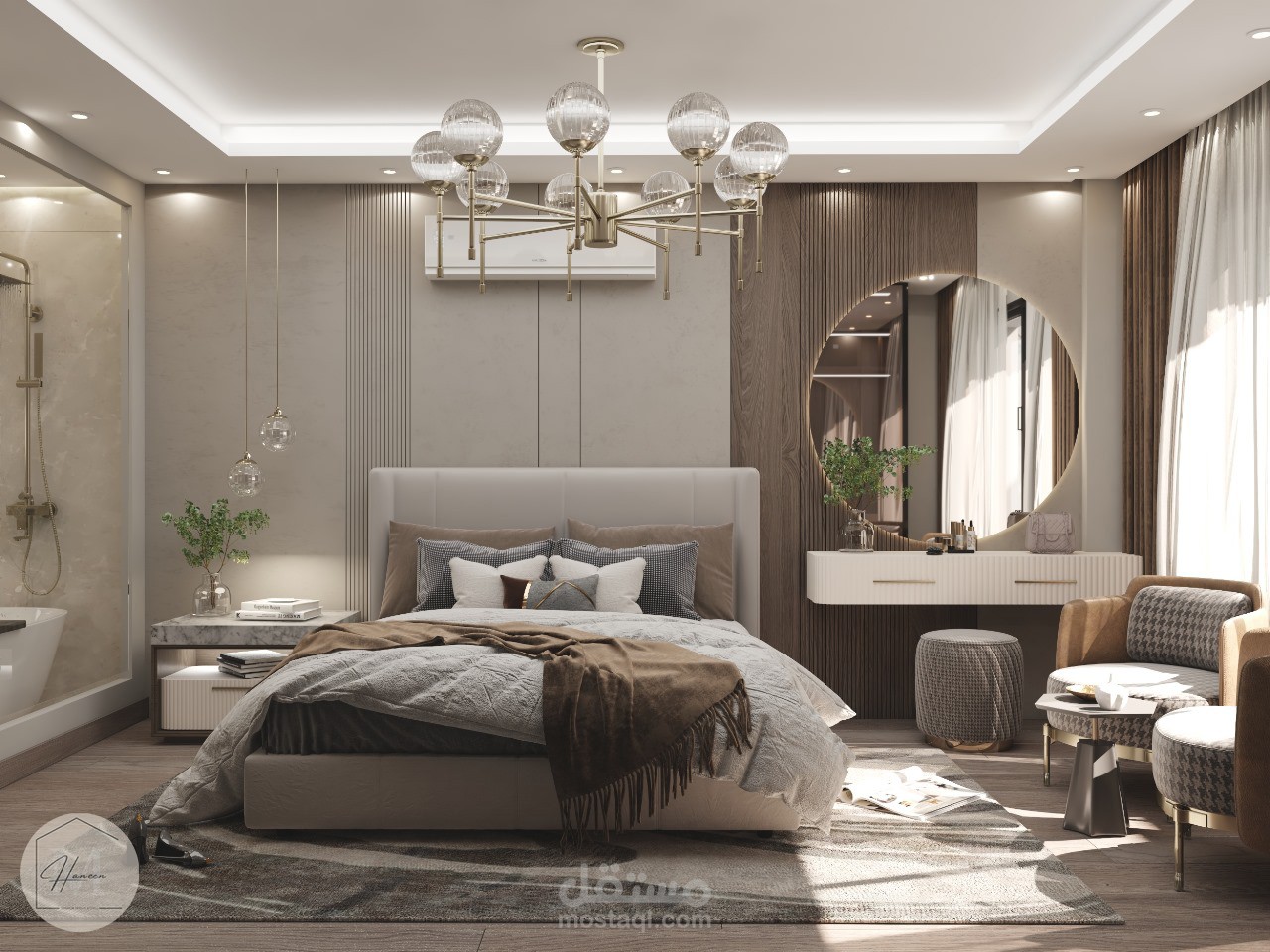 تصميم داخلي لغرفة نوم رئيسية مع حمام خاص