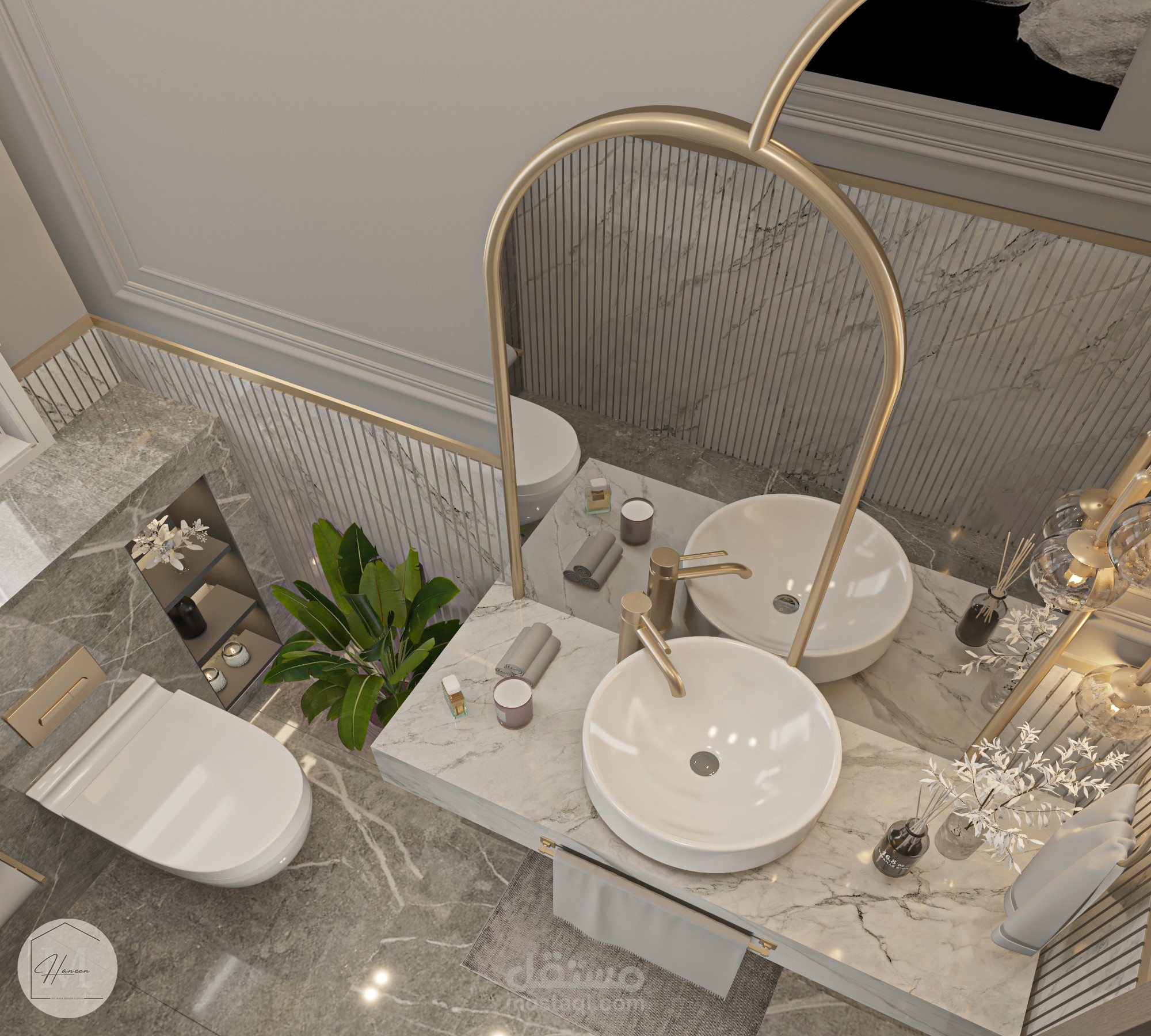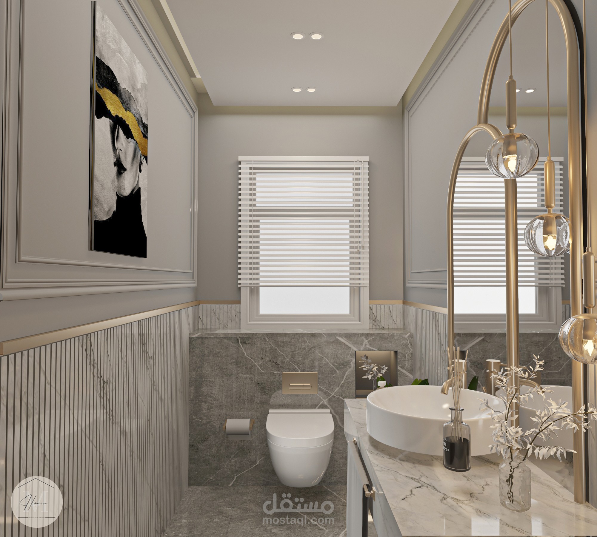 حمام ضيوف عصري بألوان متناغمة بما يتناسب مع ذوق العميل