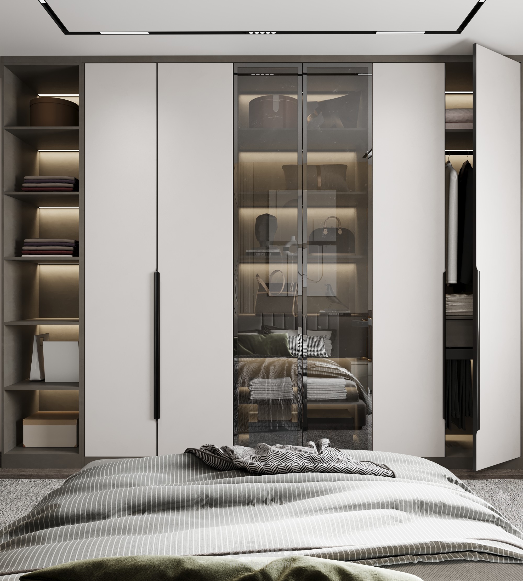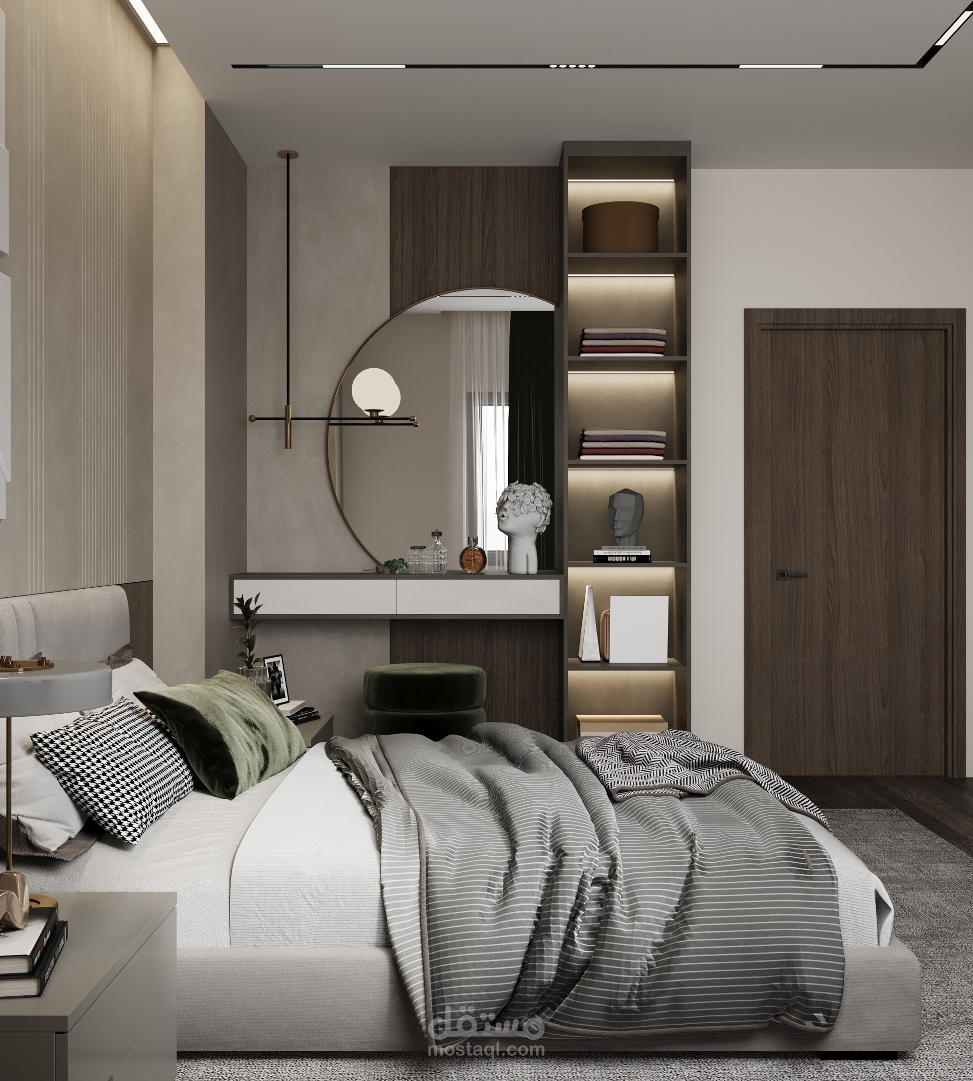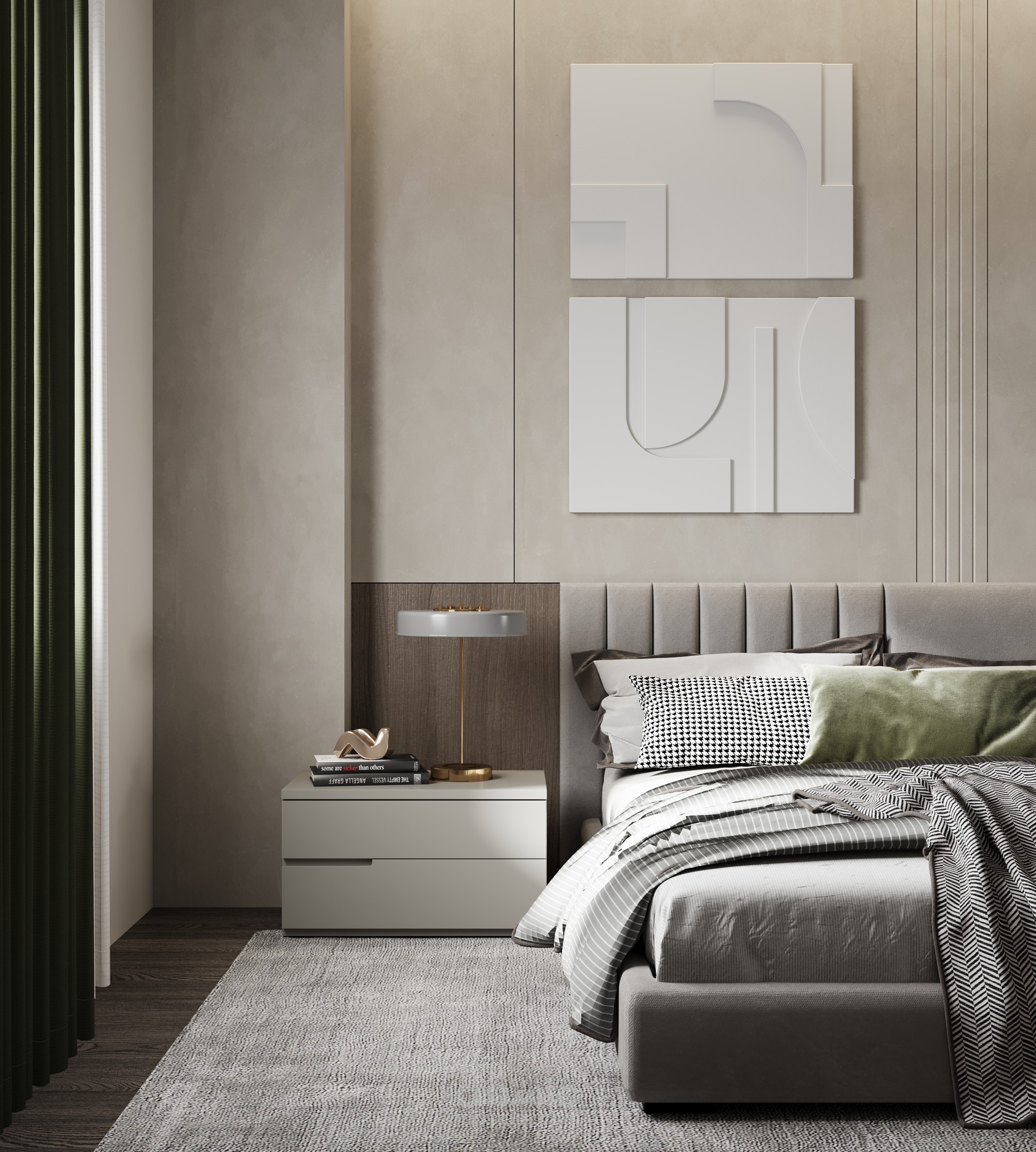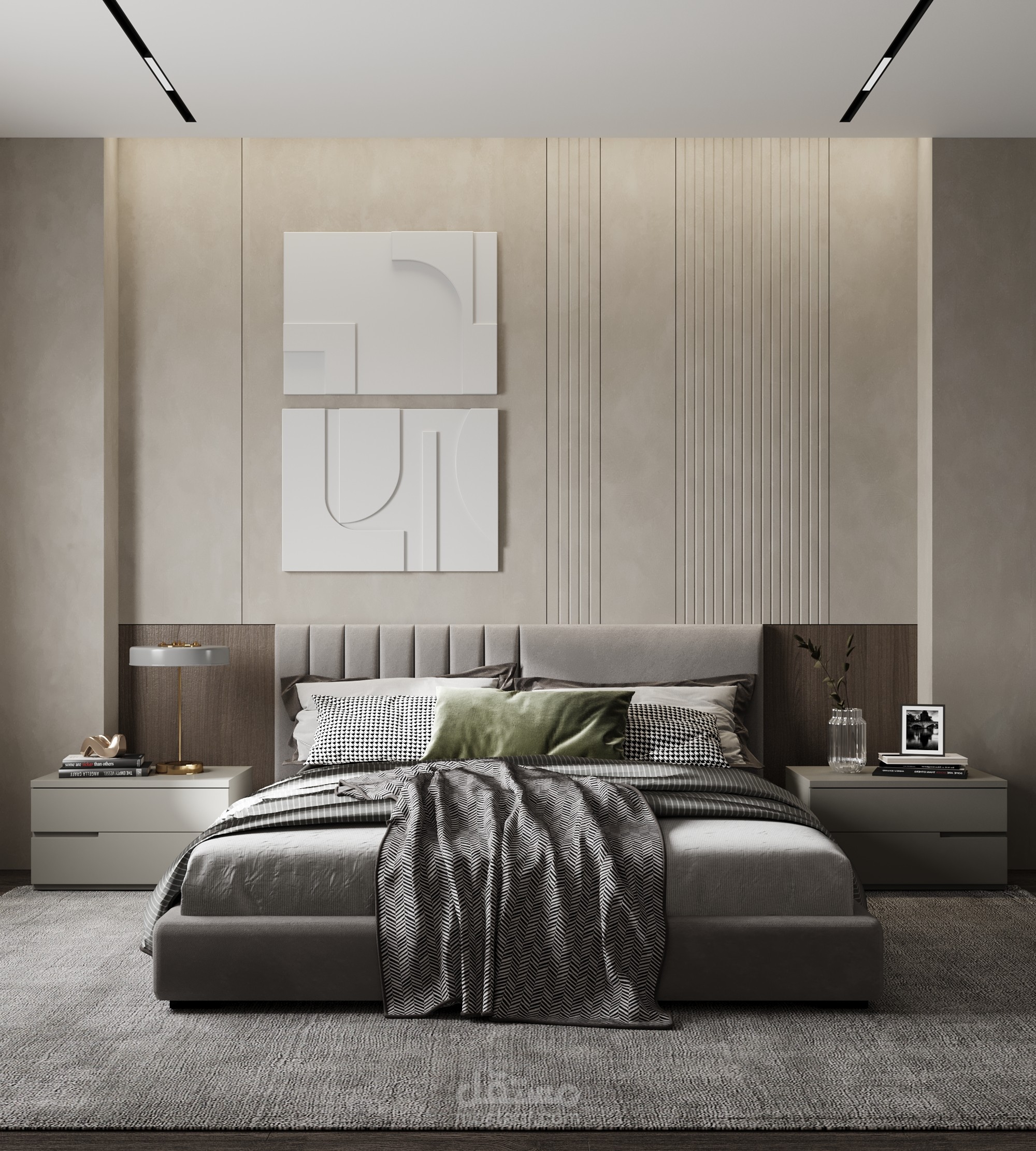 This modern bedroom is a harmonious retreat, featuring