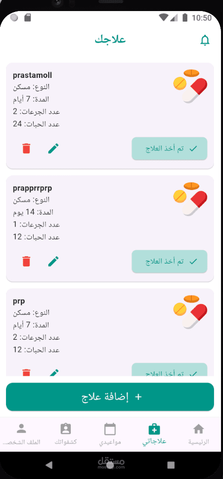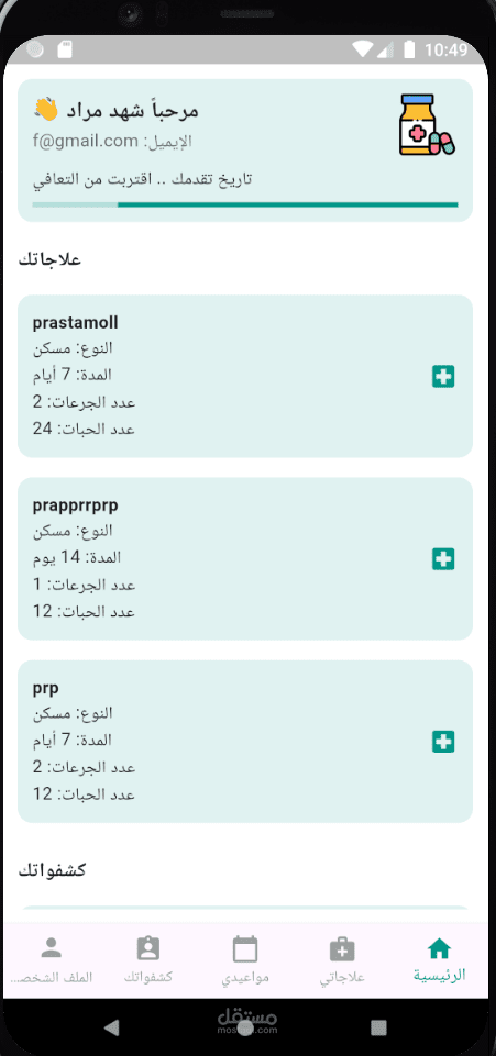 يعرض التطبيق في الصفحة الرئيسية الأدوية والكشوفات الخاصة باليوم الحالي، مع إمكانية تتبع حالة كل بند (تم / لم يتم) بناءً على تفاعل المستخدم مع الإشعارات، مما يسهّل على المستخدم الحفاظ على نظامه الصحي بشكل منتظم.