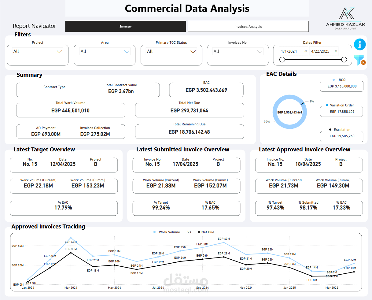 هذا المشروع يقدّم حلًا ديناميكيًا باستخدام Power BI لتبسيط وتتبع الفواتير والبيانات التجارية للمشروعات في مجال الإنشاءات.