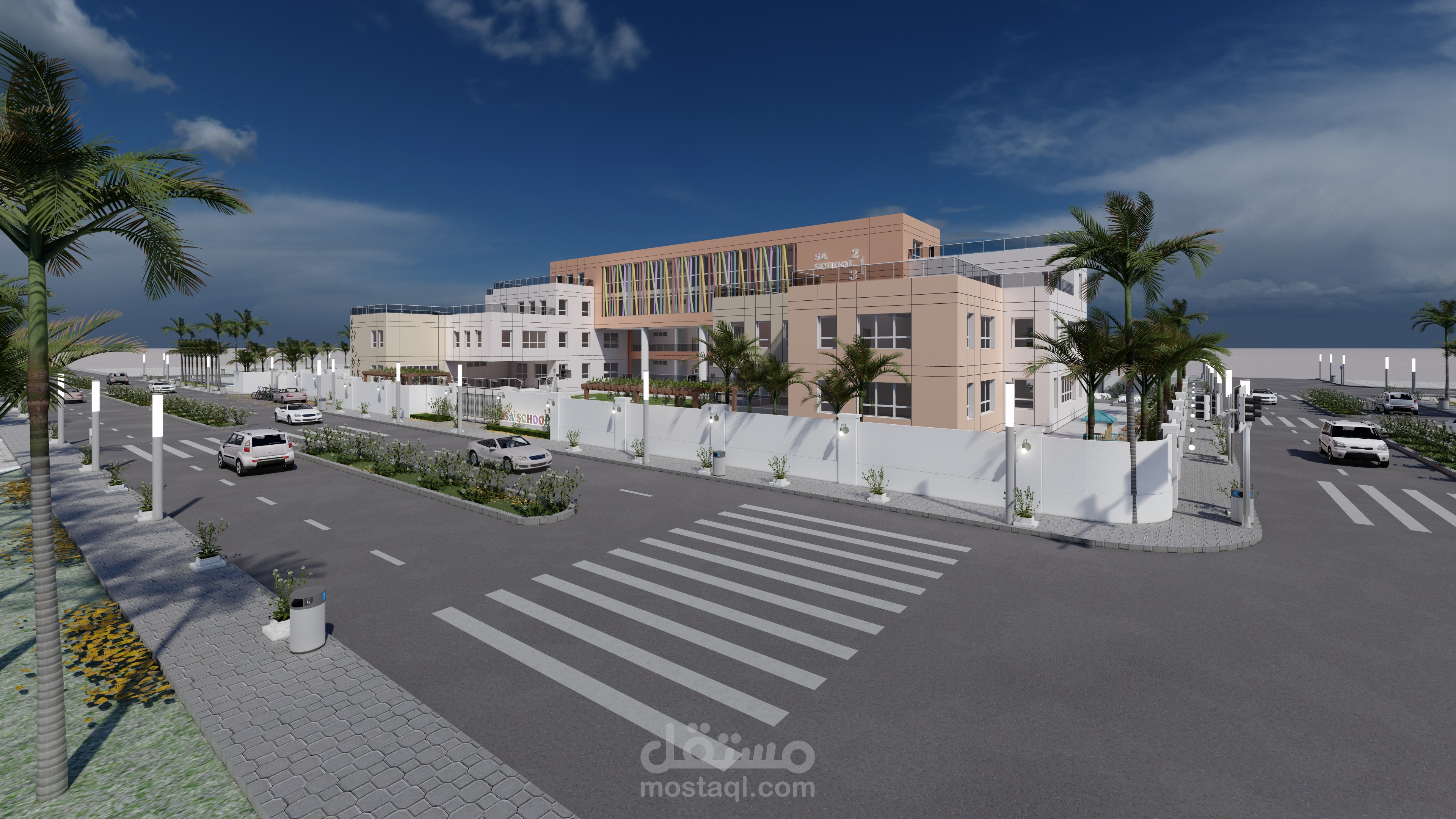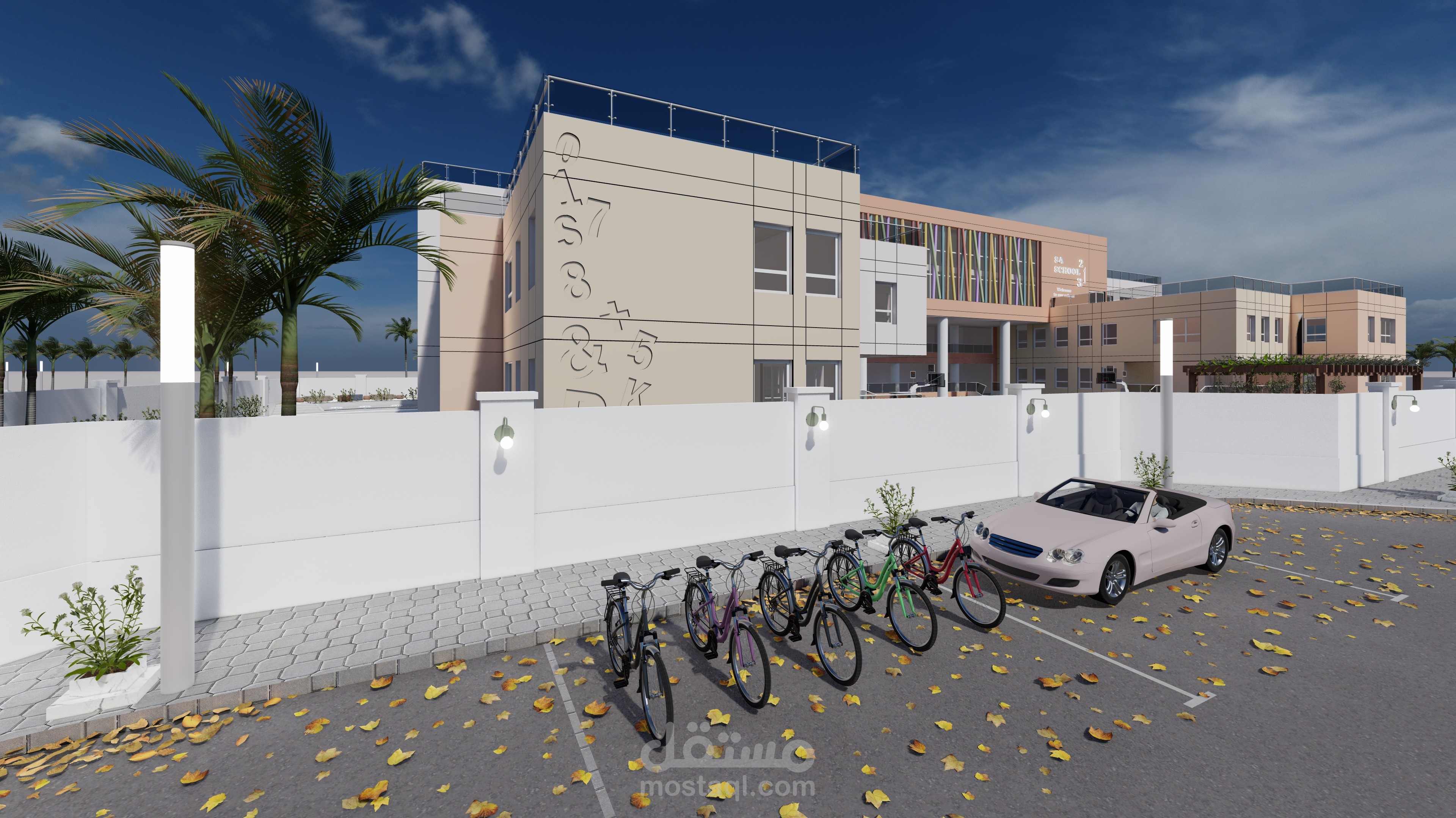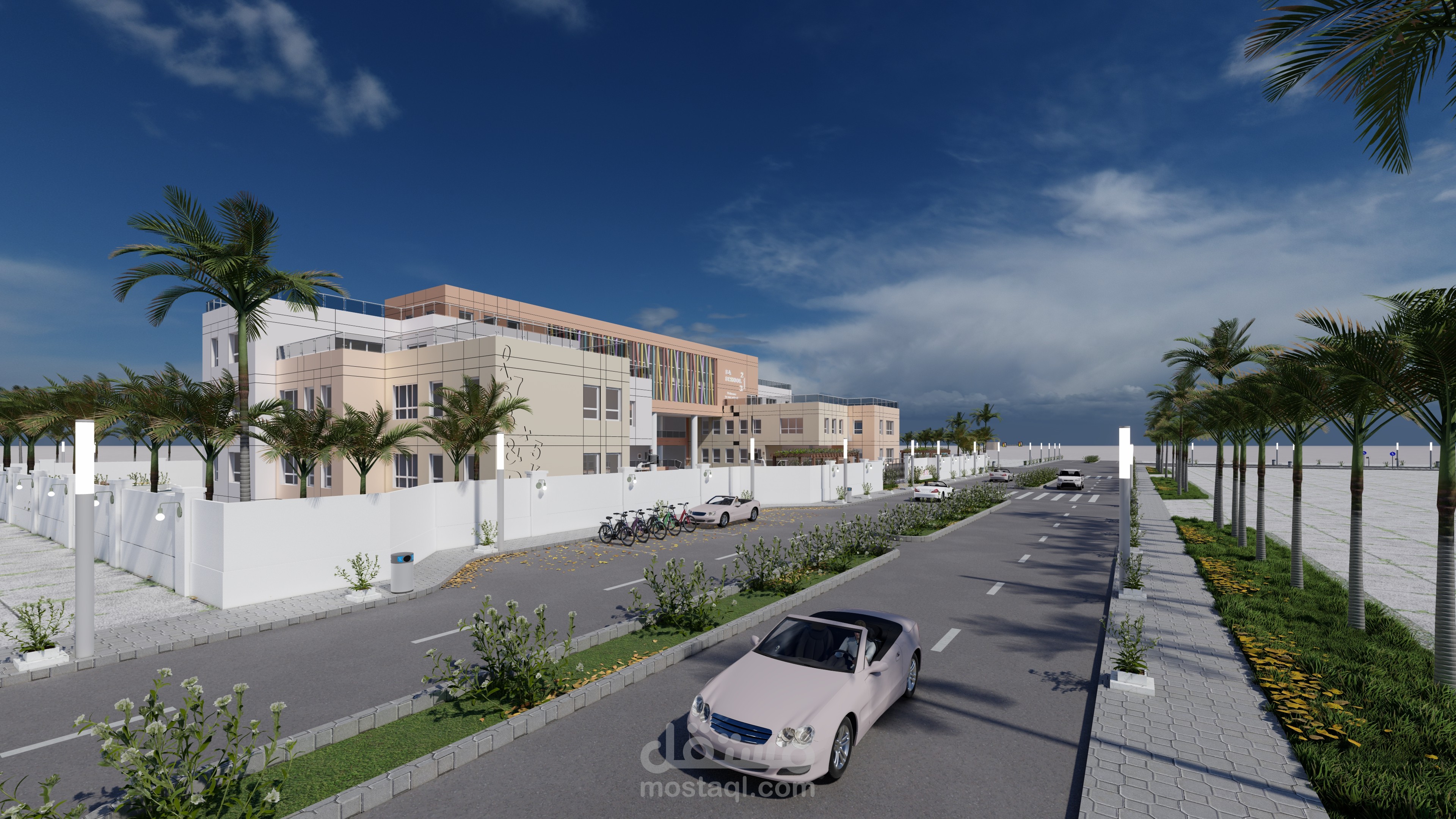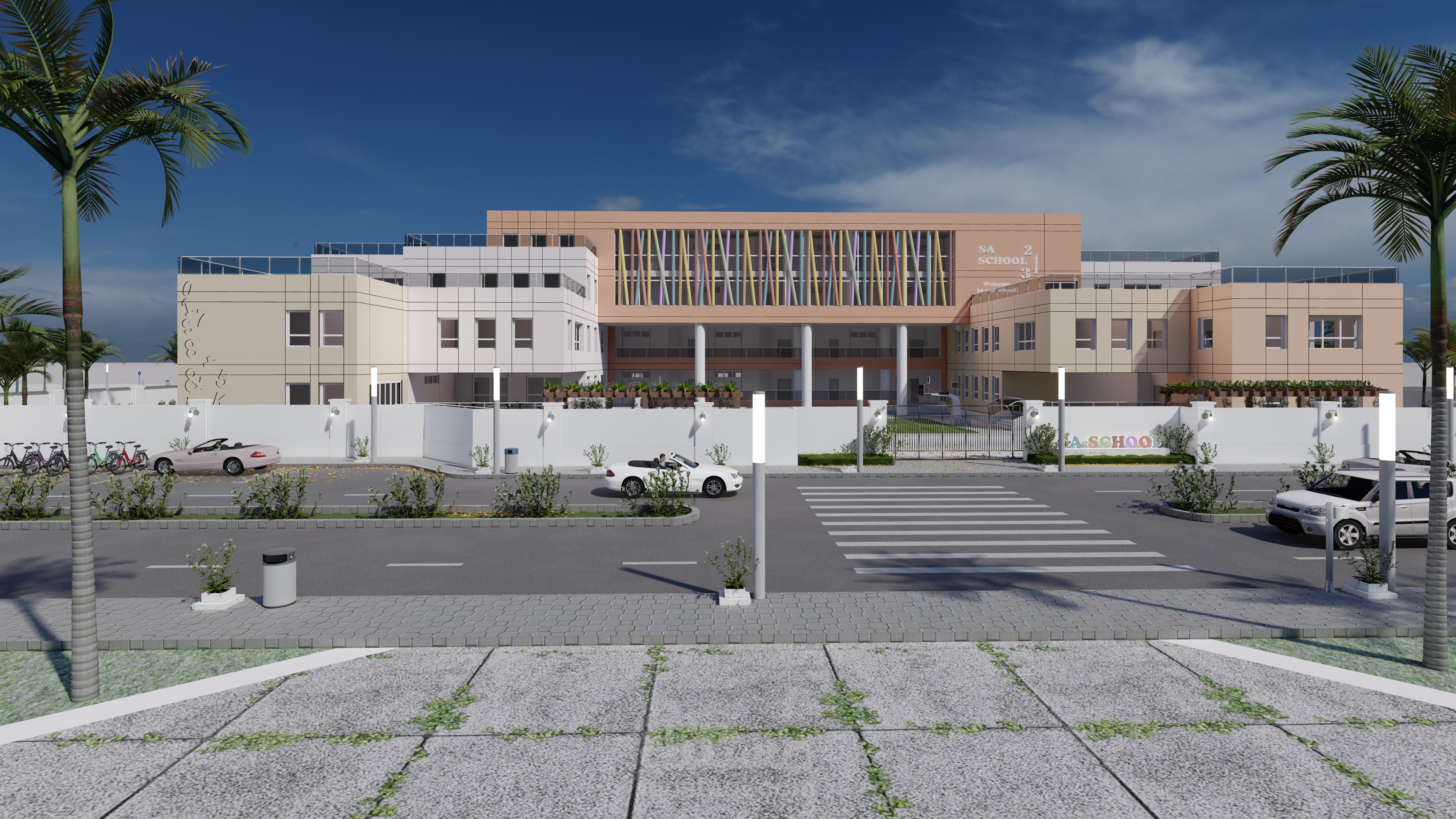 تصميم المدرسة يعكس طابعًا عصريًا ومريحًا، يتكون من ثلاث كتل معمارية بألوان هادئة وتنظيم واضح. تبرز الواجهة الوسطى بشرائح ملونة تضيف حيوية وتظليلًا طبيعيًا، مع مدخل رئيسي مميز بأعمدة دائرية. يحيط المبنى سور أبيض أنيق، ويتضمن المشروع مسارات مشاة، مواقف سيارات ودراجات، وتشجير خارجي يخلق بيئة تعليمية آمنة وجذابة.
