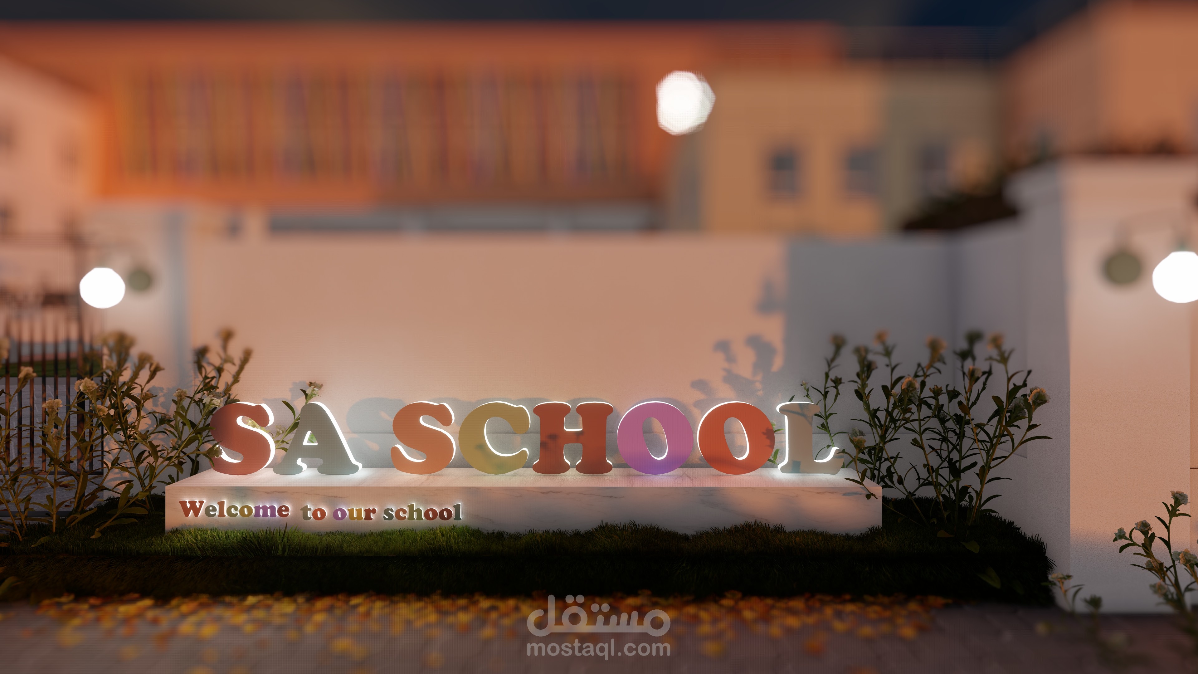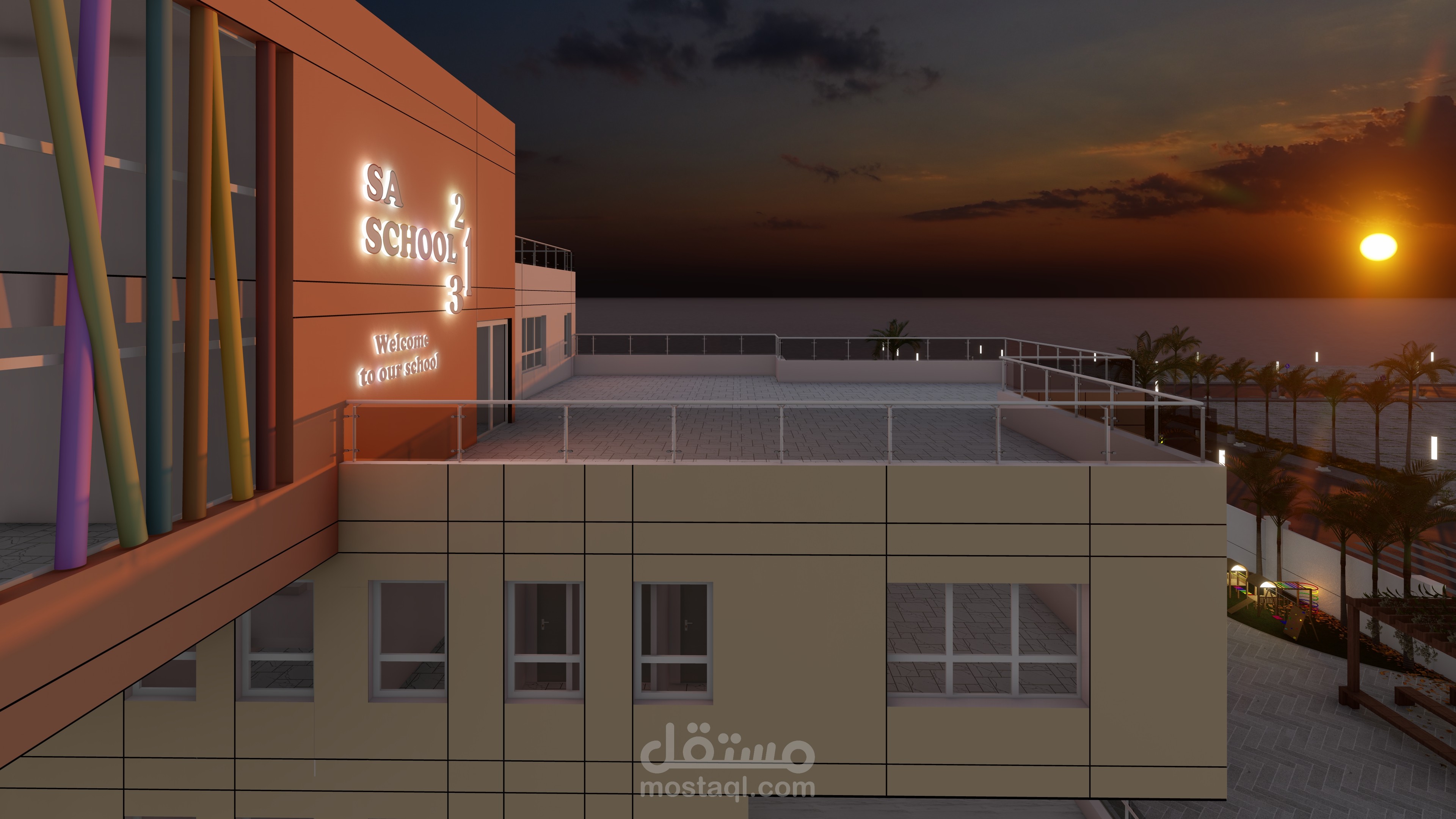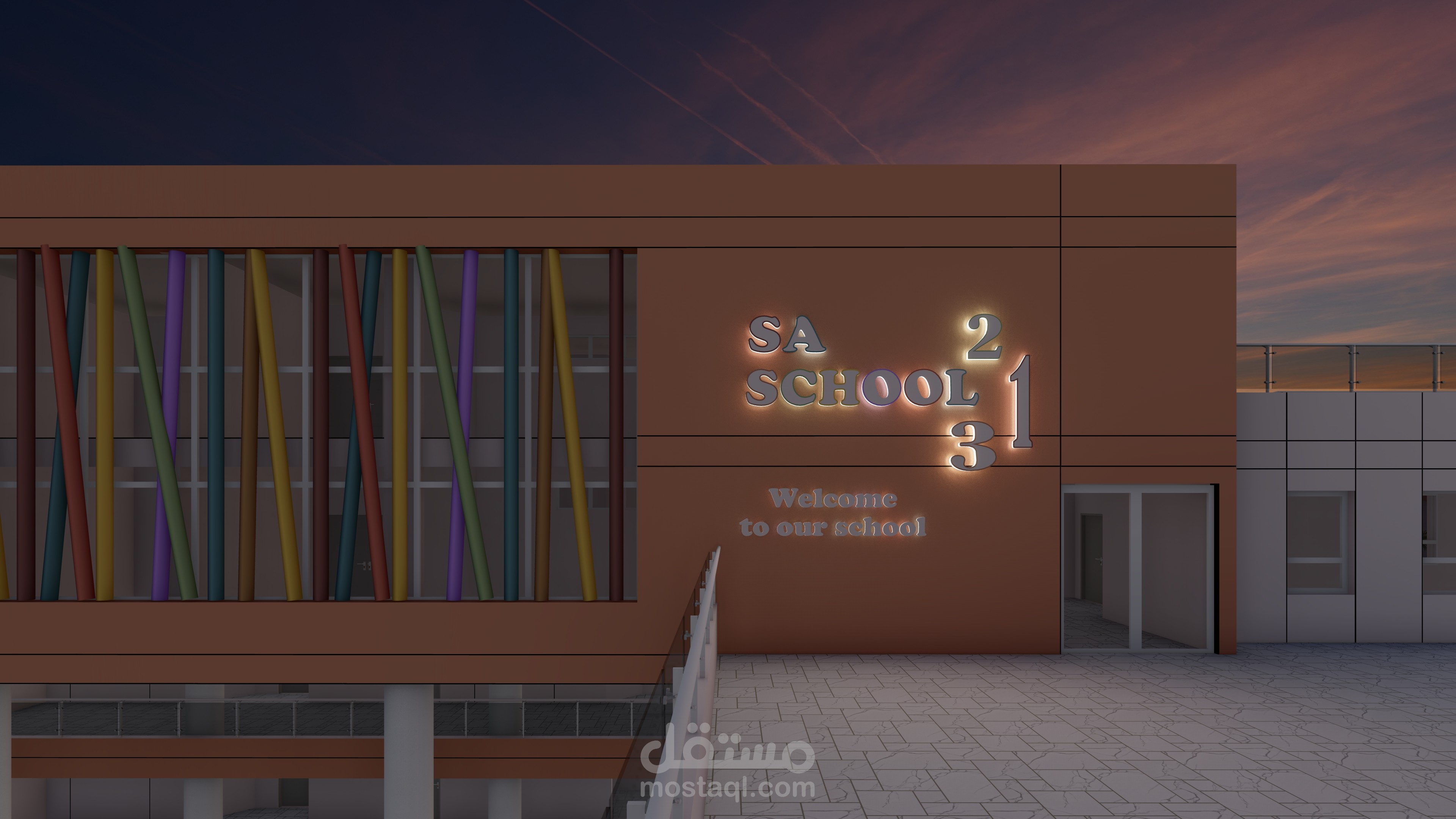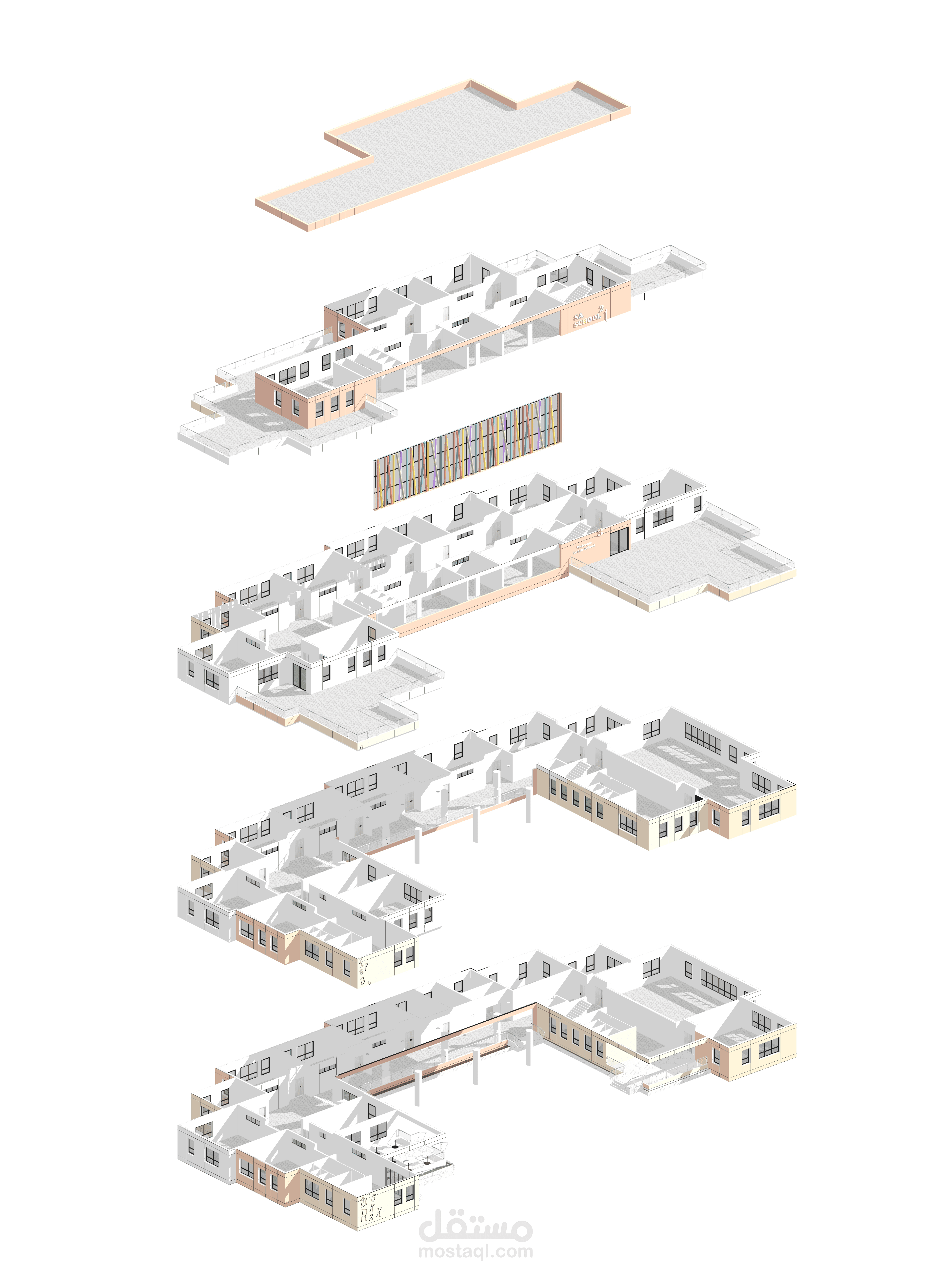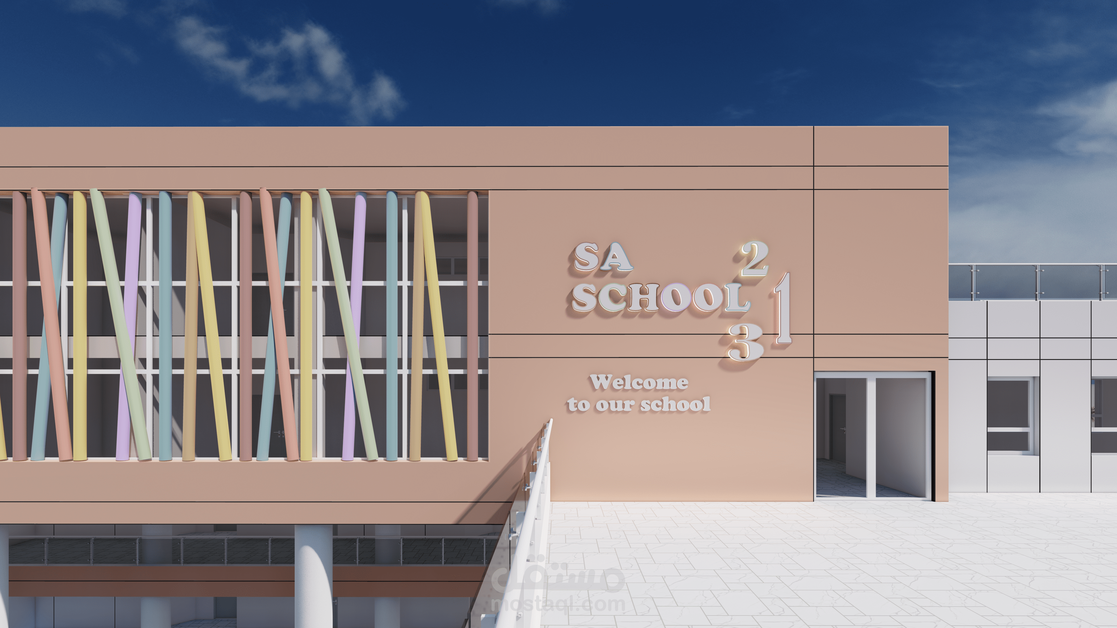 تصميم المدرسة يعكس طابعًا عصريًا ومريحًا، يتكون من ثلاث كتل معمارية بألوان هادئة وتنظيم واضح. تبرز الواجهة الوسطى بشرائح ملونة تضيف حيوية وتظليلًا طبيعيًا، مع مدخل رئيسي مميز بأعمدة دائرية. يحيط المبنى سور أبيض أنيق، ويتضمن المشروع مسارات مشاة، مواقف سيارات ودراجات، وتشجير خارجي يخلق بيئة تعليمية آمنة وجذابة.