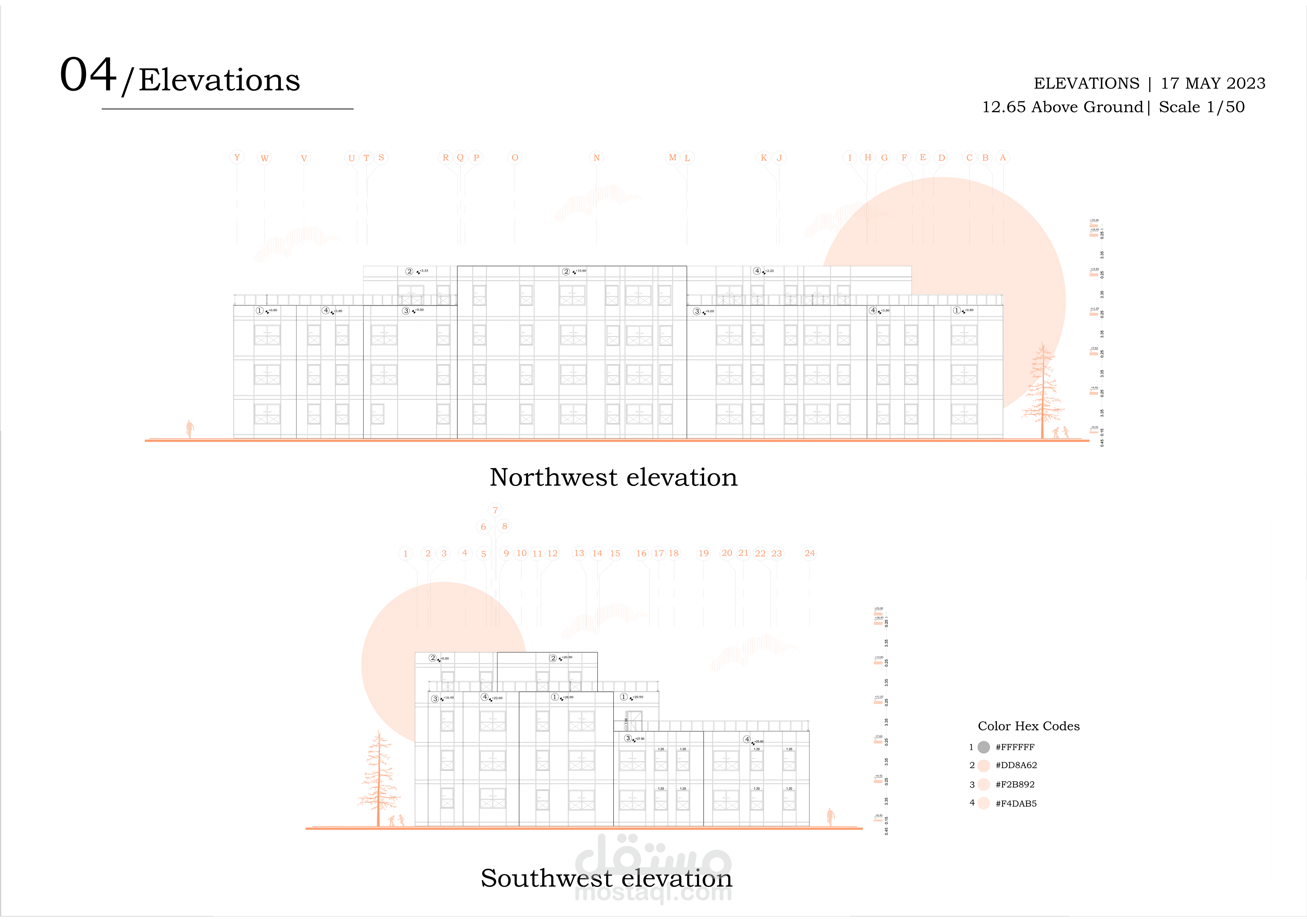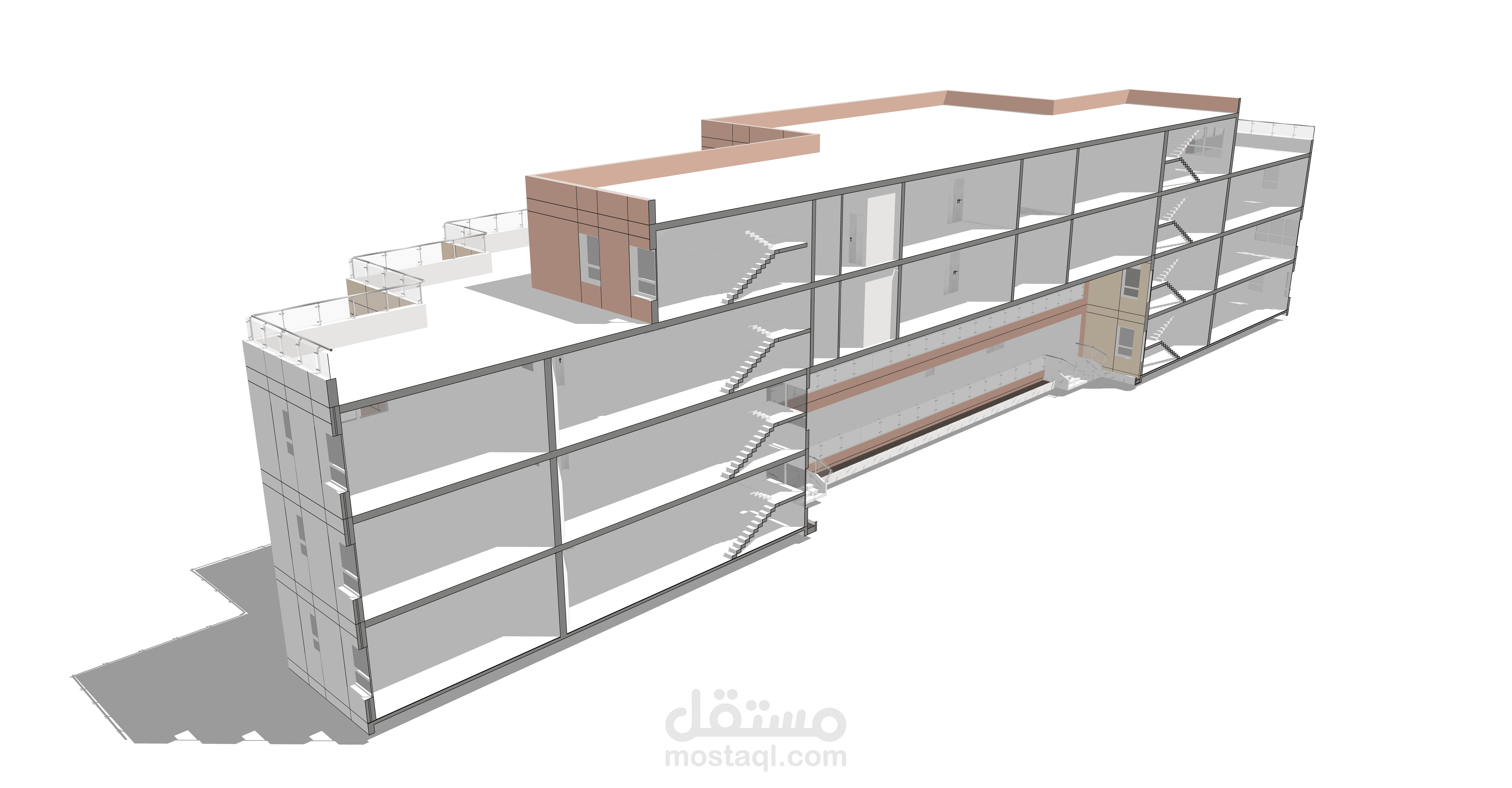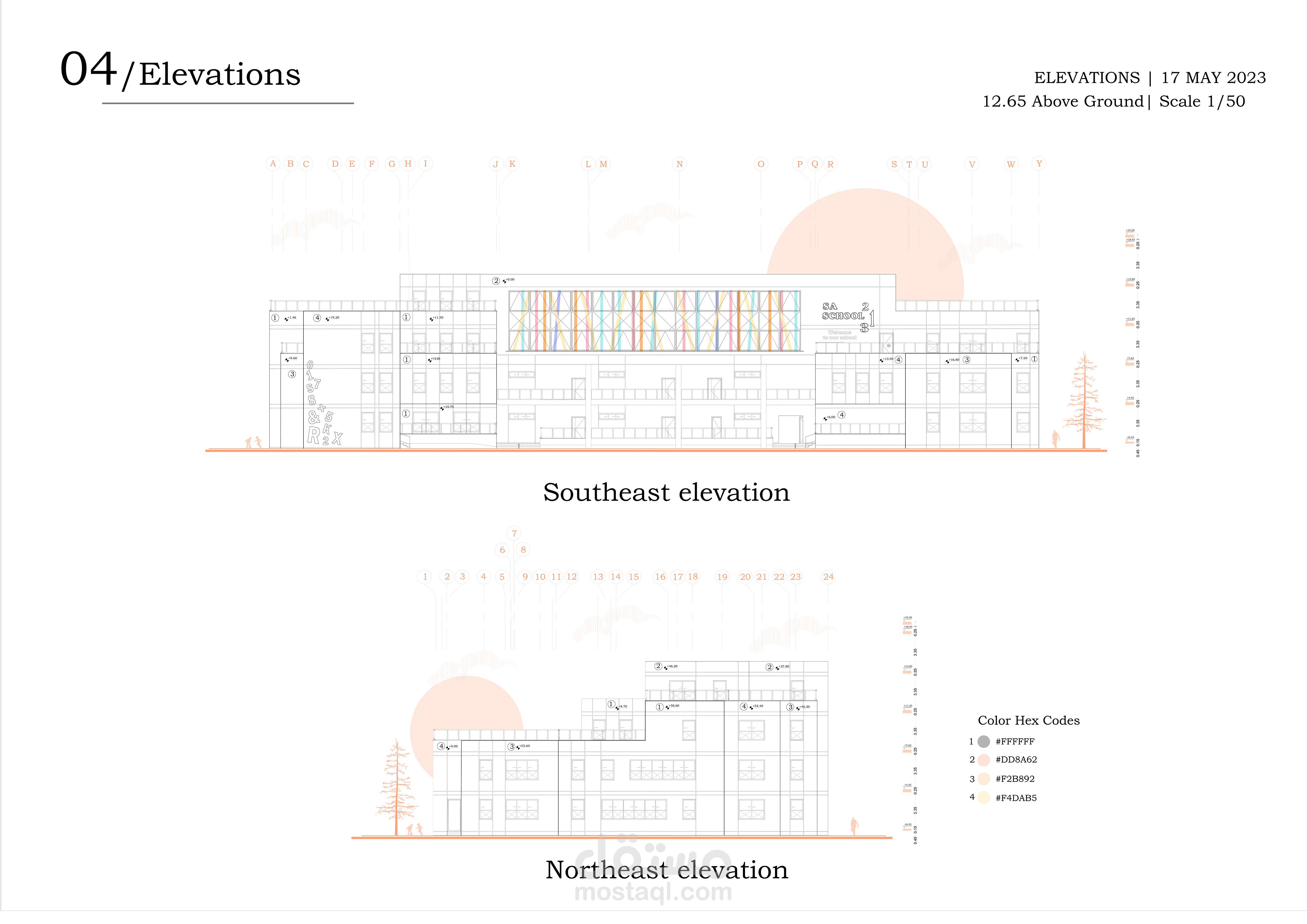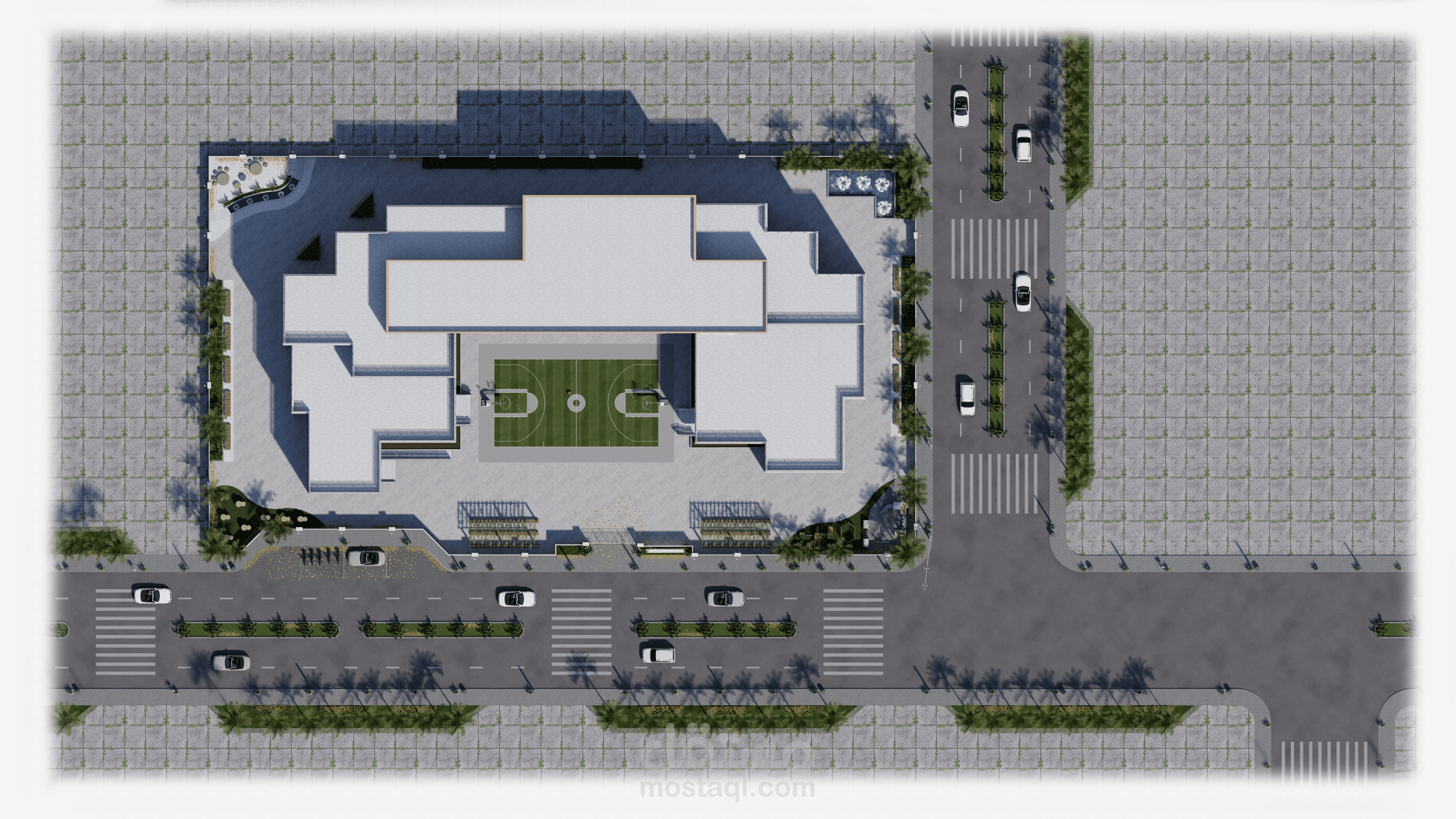 تصميم المدرسة يعكس طابعًا عصريًا ومريحًا، يتكون من ثلاث كتل معمارية بألوان هادئة وتنظيم واضح. تبرز الواجهة الوسطى بشرائح ملونة تضيف حيوية وتظليلًا طبيعيًا، مع مدخل رئيسي مميز بأعمدة دائرية. يحيط المبنى سور أبيض أنيق، ويتضمن المشروع مسارات مشاة، مواقف سيارات ودراجات، وتشجير خارجي يخلق بيئة تعليمية آمنة وجذابة.