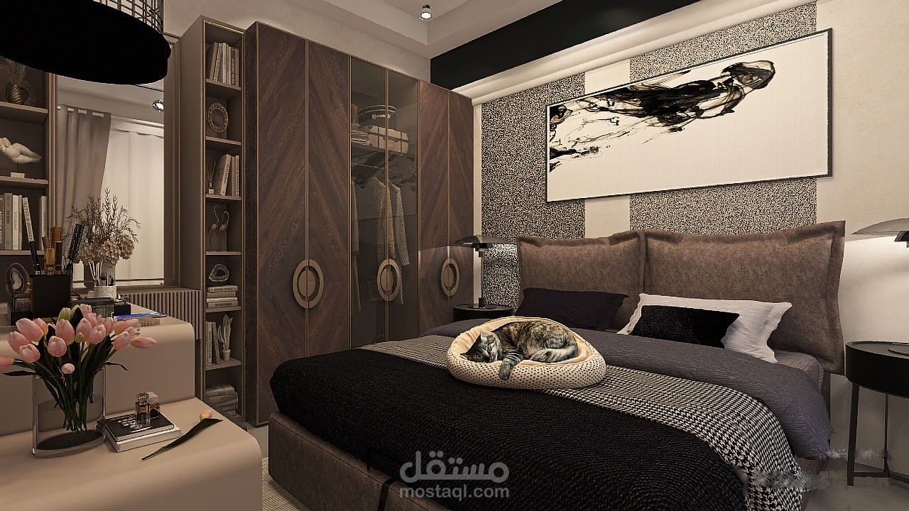 Bedrooms: The bedrooms were designed in a way that reflects the modern style, featuring simple beds and functional furniture, along with soothing lighting to create a relaxing atmosphere.