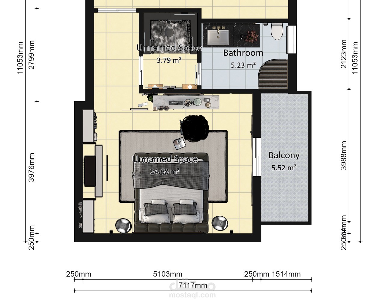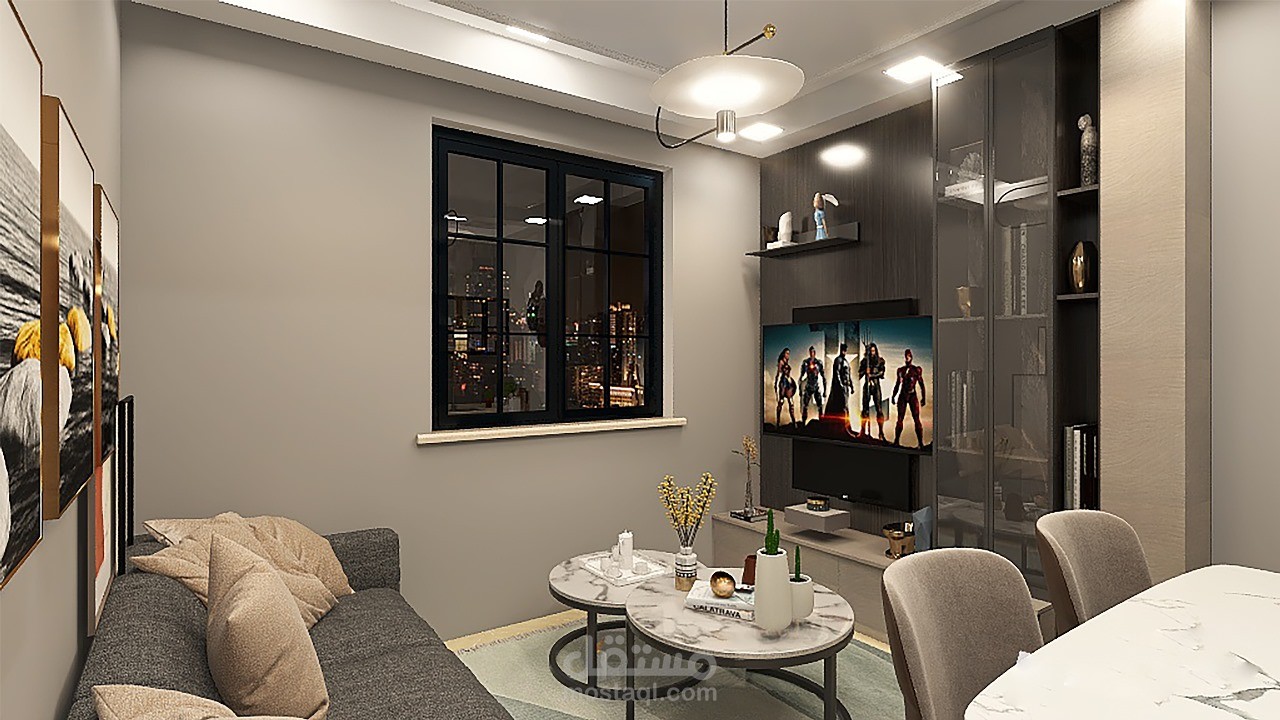 Overall Concept: The apartment was designed in a modern style characterized by clean lines and neutral colors, with touches of vibrant colors added to bring life to the space. The priority was to achieve a balance between beauty and comfort while maximizing the use of available space.