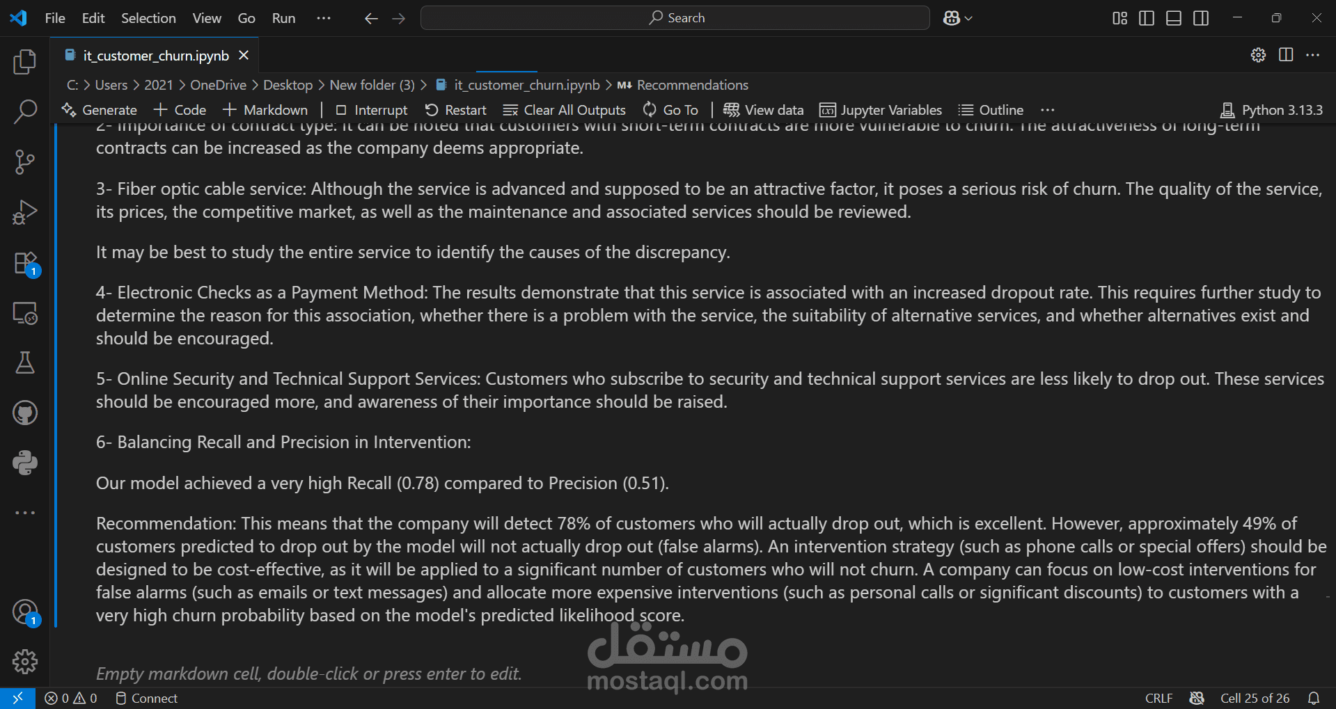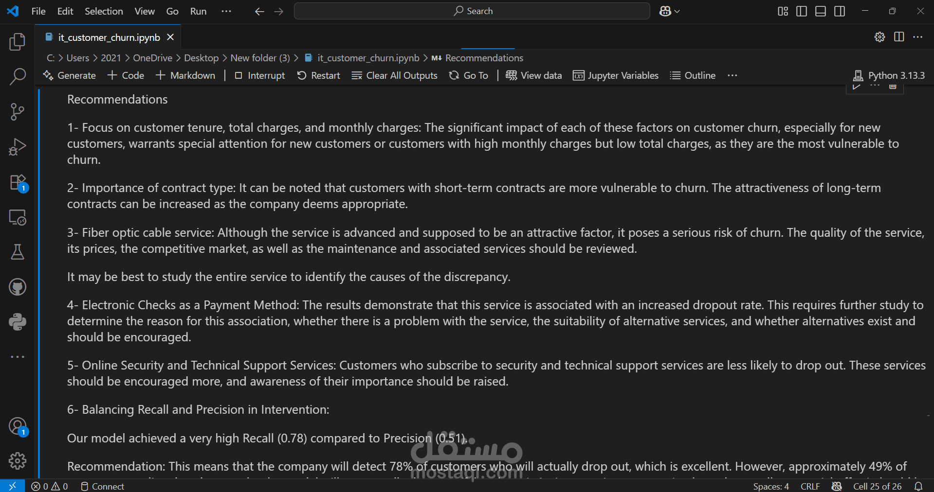 We started by importing the data, then verified the data types for the columns, performed data cleaning, handled null values, and considered outliers as a starting point for the analysis process. This was followed by a simple descriptive analysis to study the features and their effects, as well as to gain a better understanding and familiarity with the data, as shown in the code. We then created two prediction models, each in two forms: a normal image and an image, using RandomizedSearchCV. Based on the results of several metrics, we selected the logistic regression model with RandomizedSearchCV as the most appropriate model among the tested models. Based on the above, we reached the following recommendations: