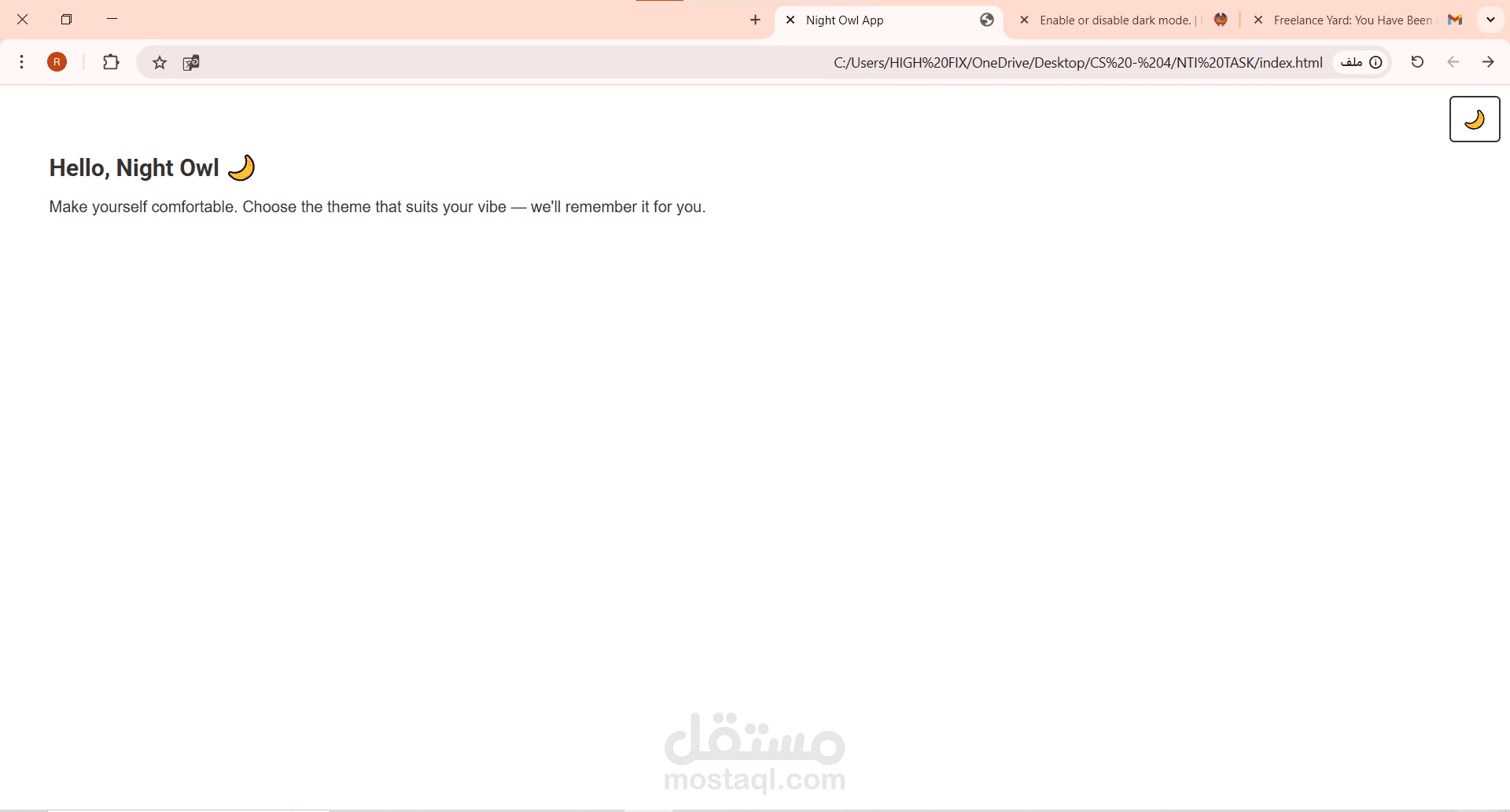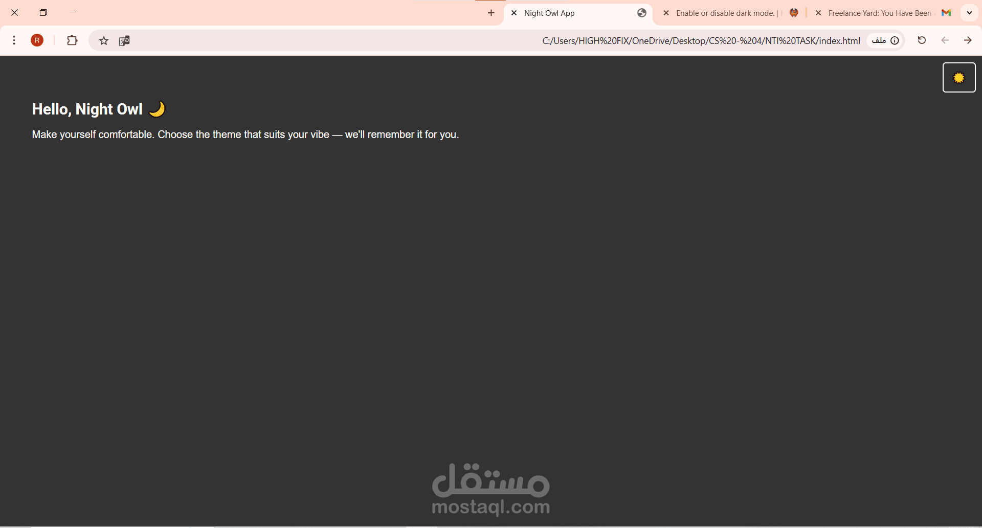 dark mode toggle feature for a client named “Night Owl,” who wants their app to have both light and dark themes