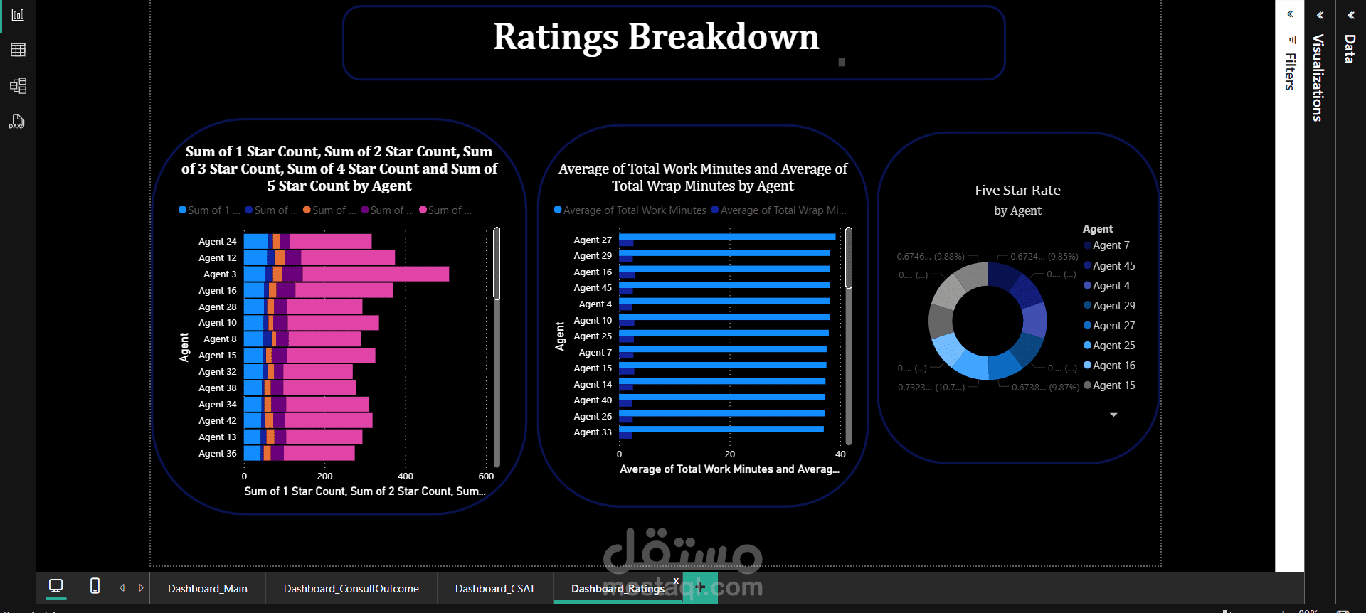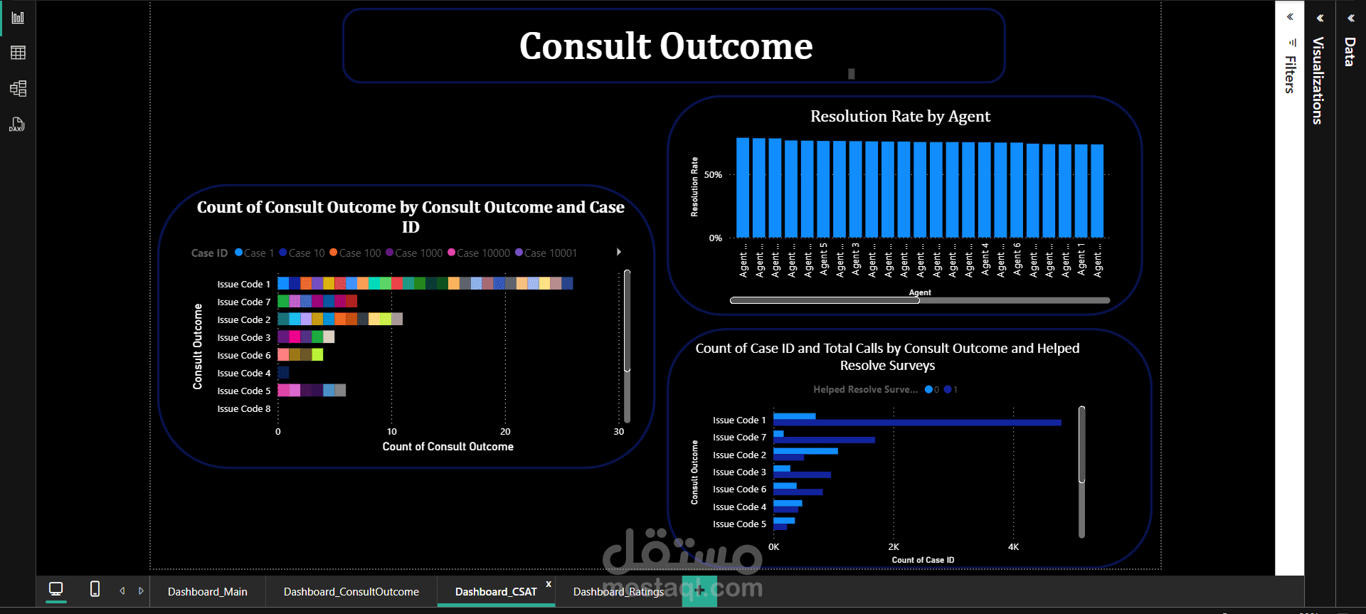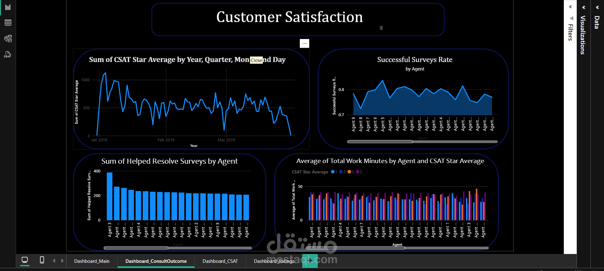 داشبورد تفاعلية باستخدام Power BI لتحليل بيانات مركز الاتصال (Call Center)، حيث تشمل تقارير مفصلة حول عدد المكالمات، أداء الوكلاء، رضا العملاء (CSAT)، معدل وقت المكالمة (AHT)، وتوزيع المكالمات حسب اللغة والقطاع والشهر. تم تضمين أزرار تنقل بين الصفحات لعرض تقارير متخصصة، مما يسهل اتخاذ القرارات وتحسين الأداء بشكل لحظي