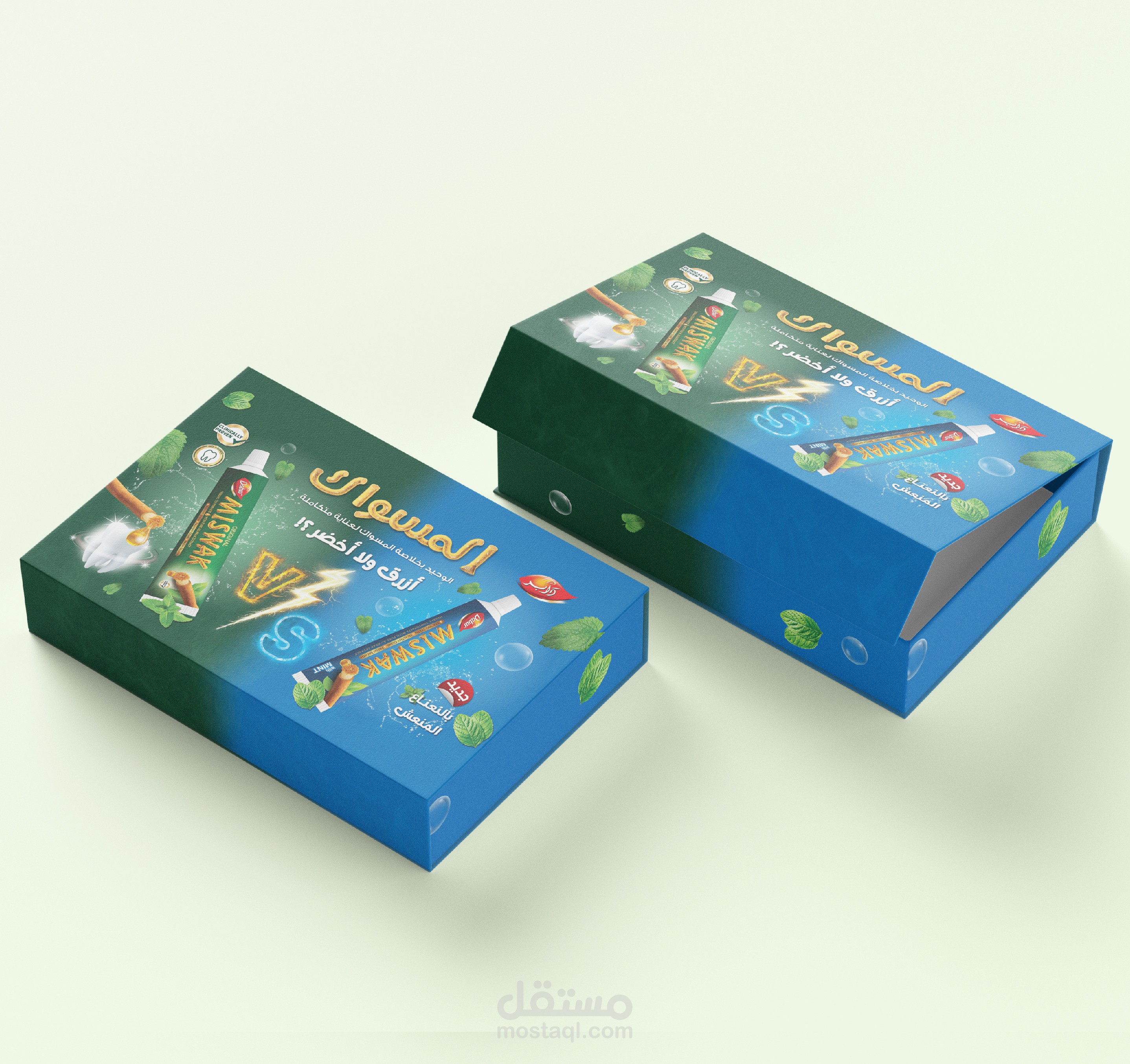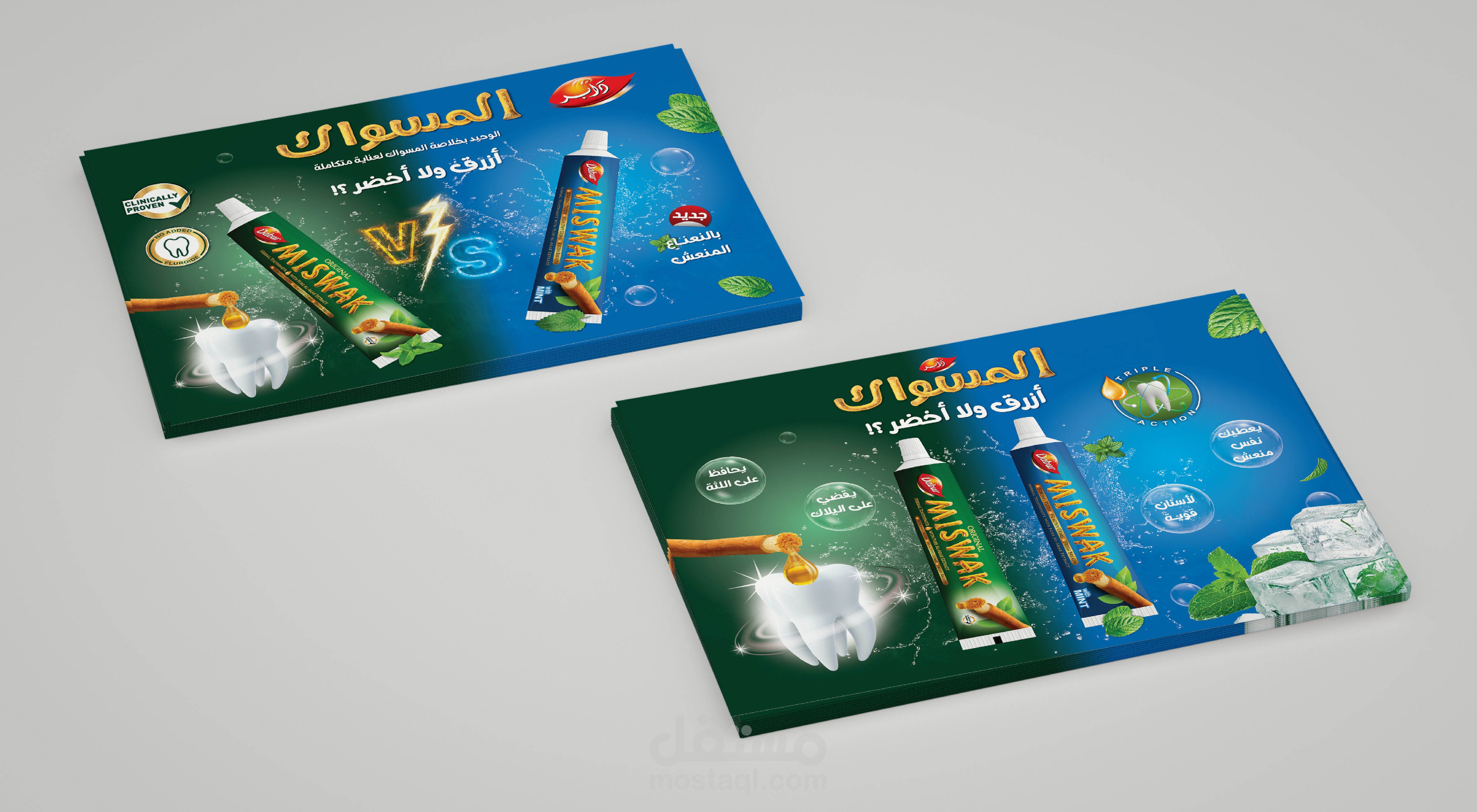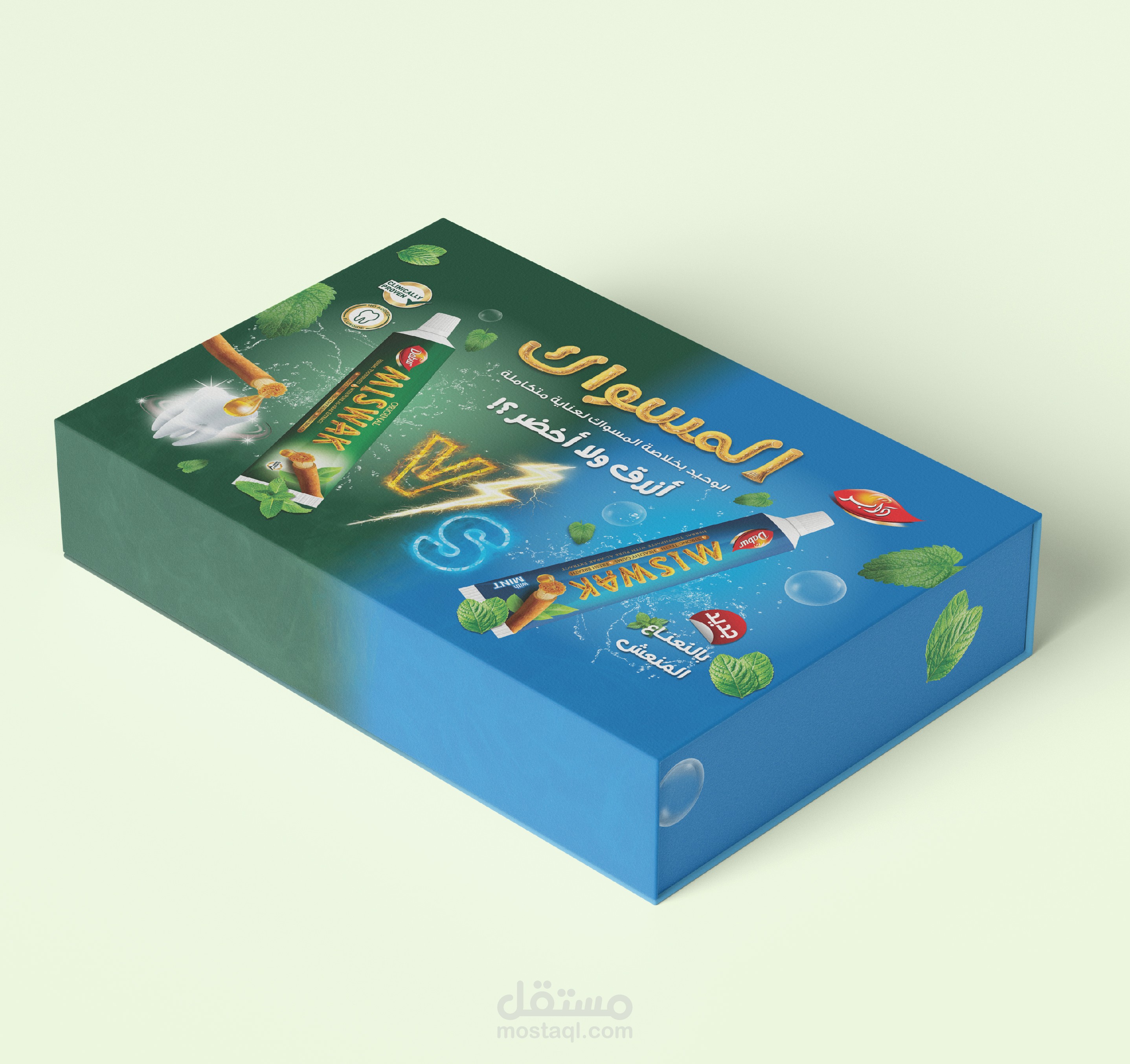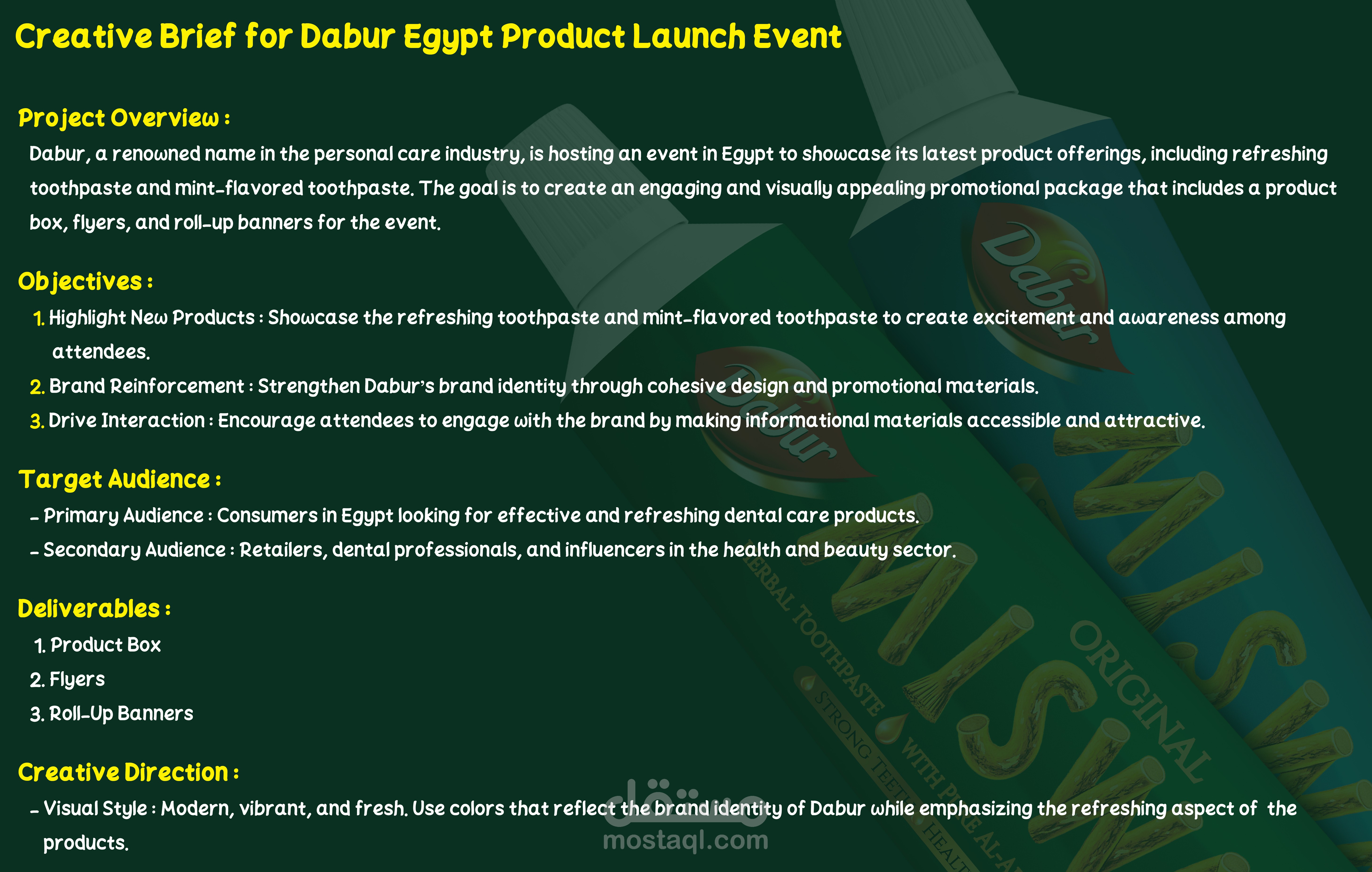 تستضيف دابر، الاسم الرائد في مجال العناية الشخصية، فعالية في مصر لعرض أحدث منتجاتها، بما في ذلك معجون أسنان منعش ومعجون أسنان بنكهة النعناع. الهدف هو تصميم حزمة ترويجية جذابة وجذابة بصريًا تتضمن علبة منتجات، ومنشورات، ولافتات قابلة للطي للفعالية.