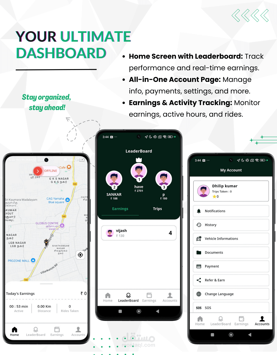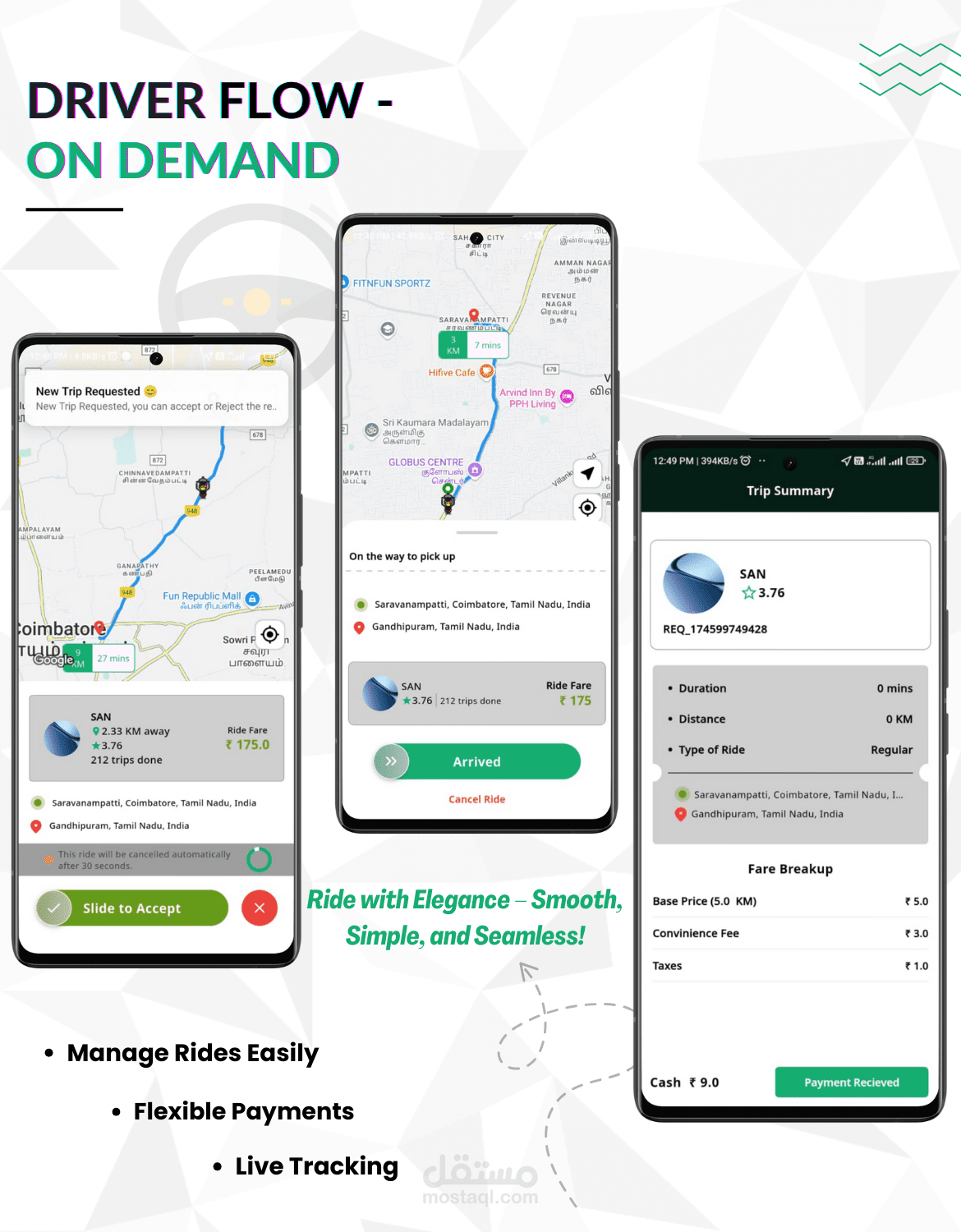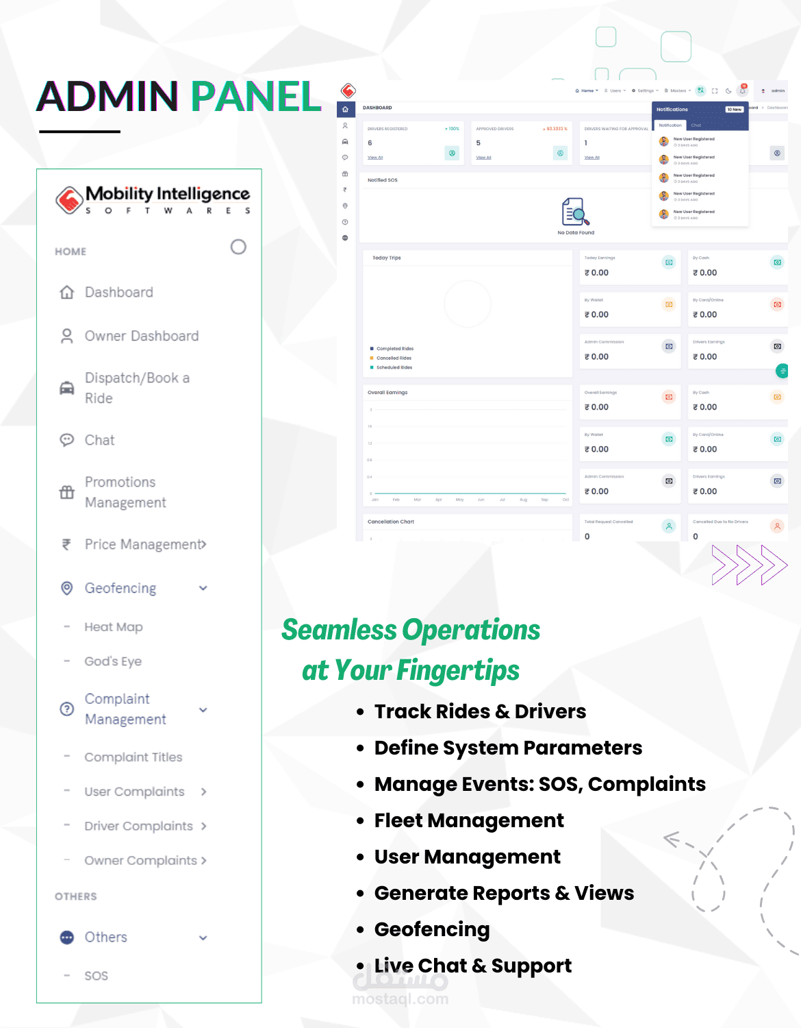 إدارة طلبات الرحلات والمستخدمين والسائقين.