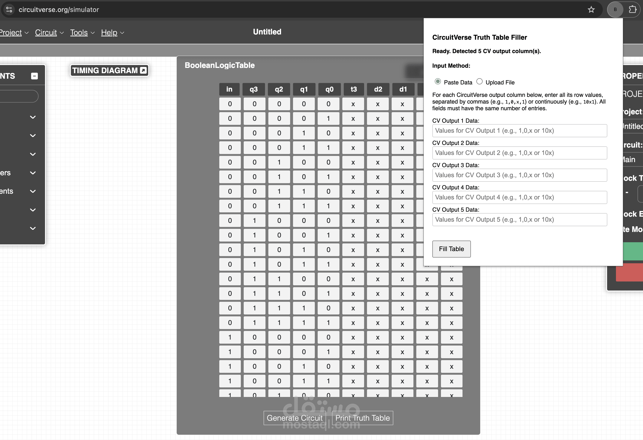 Developed a browser extension, the 'CircuitVerse Truth Table Filler', using JavaScript, HTML, and CSS to streamline filling truth tables in CircuitVerse's Combinational Analysis tool. The extension allows users to input data by pasting directly or uploading .csv and .xlsx files, leveraging the PapaParse and SheetJS (xlsx.js) libraries for file processing. It interacts with CircuitVerse pages via content scripts and background logic using browser extension APIs. This project is currently unpublished with plans to expand its utility (potentially under the name 'FilliT') to support a wider range of websites and input types, from simple forms to complex tables.