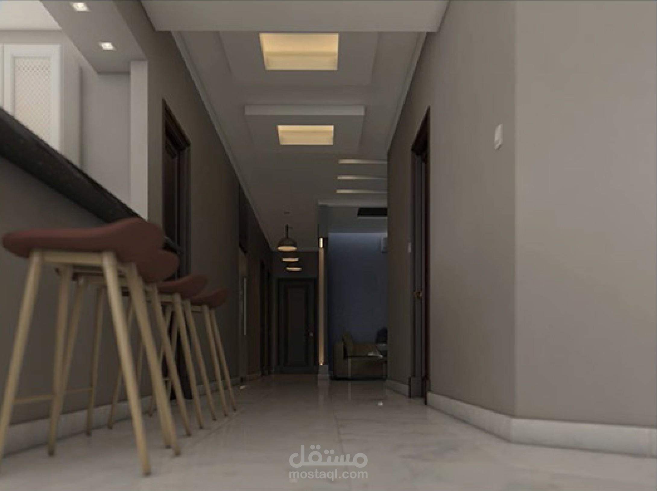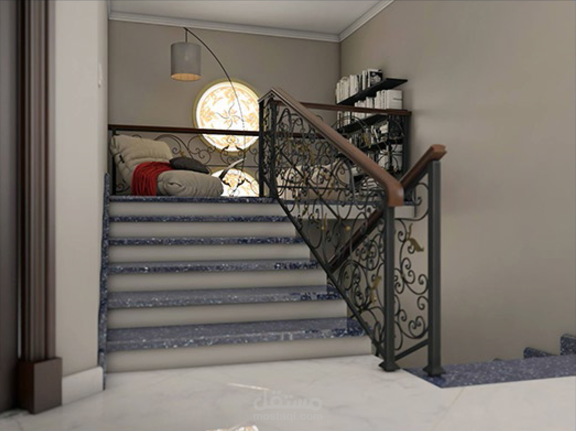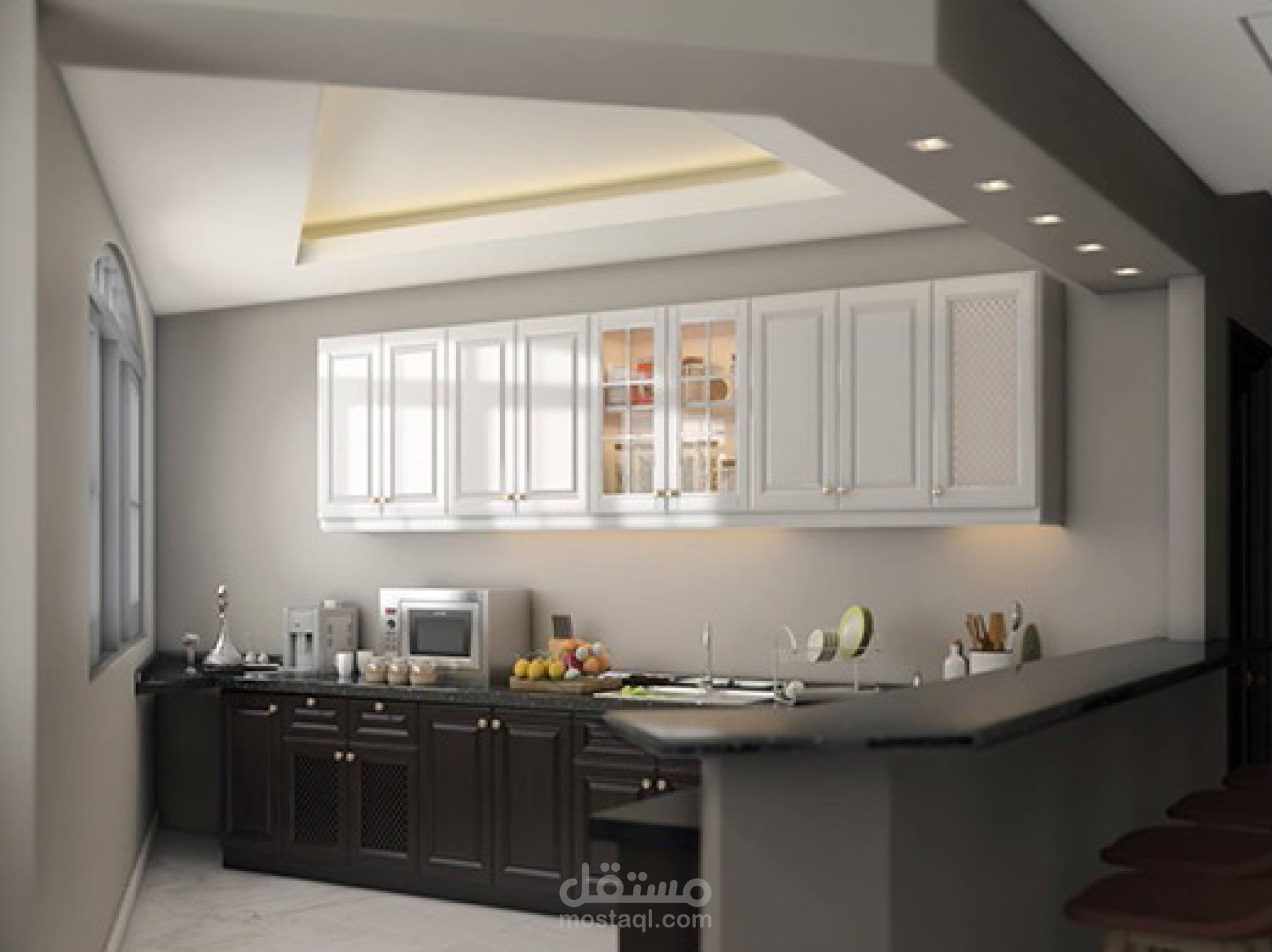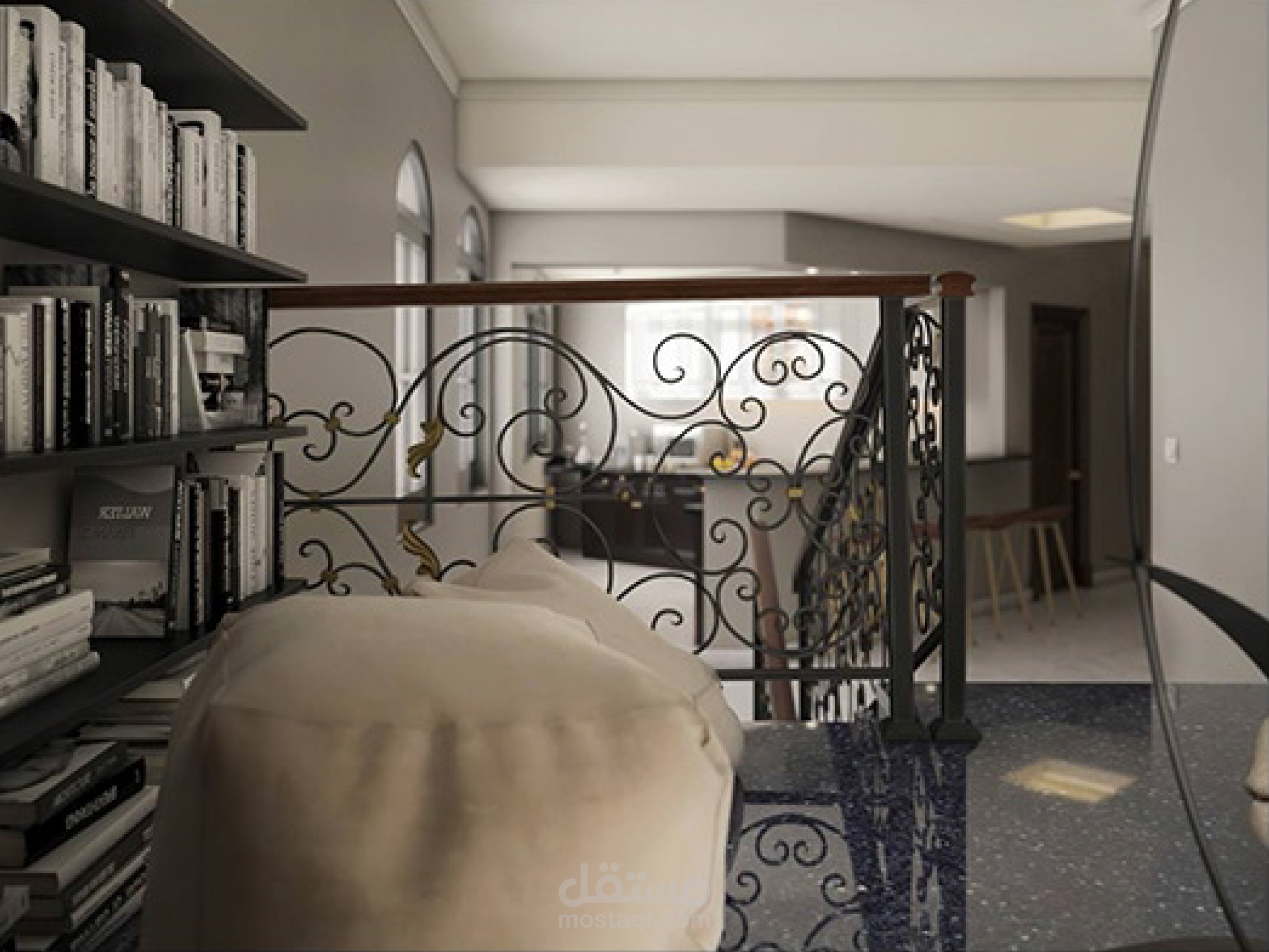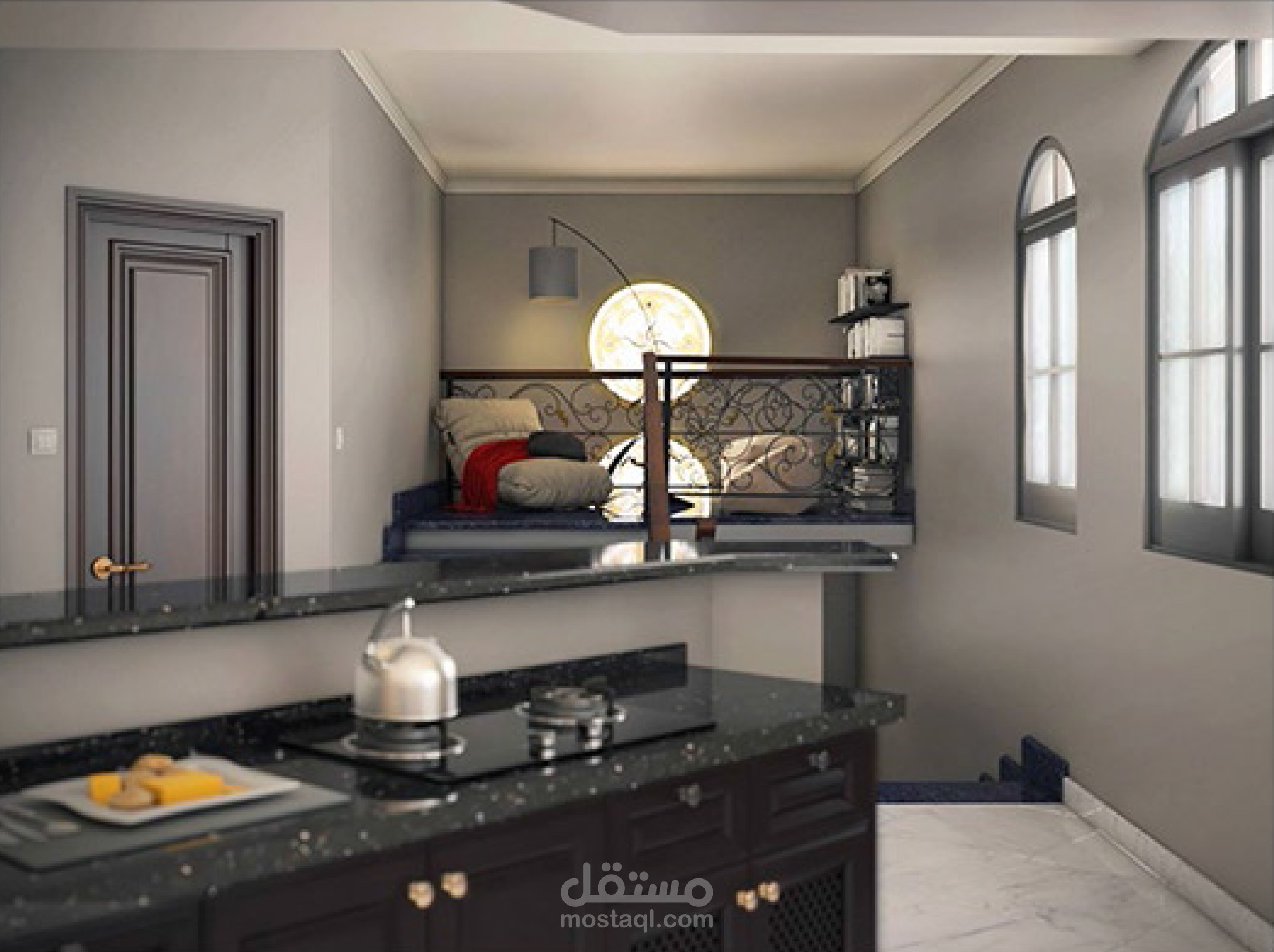 غرفة معيشة ومطبخ ومكتب علوي في منطقة السلم بشقة دوبلكس