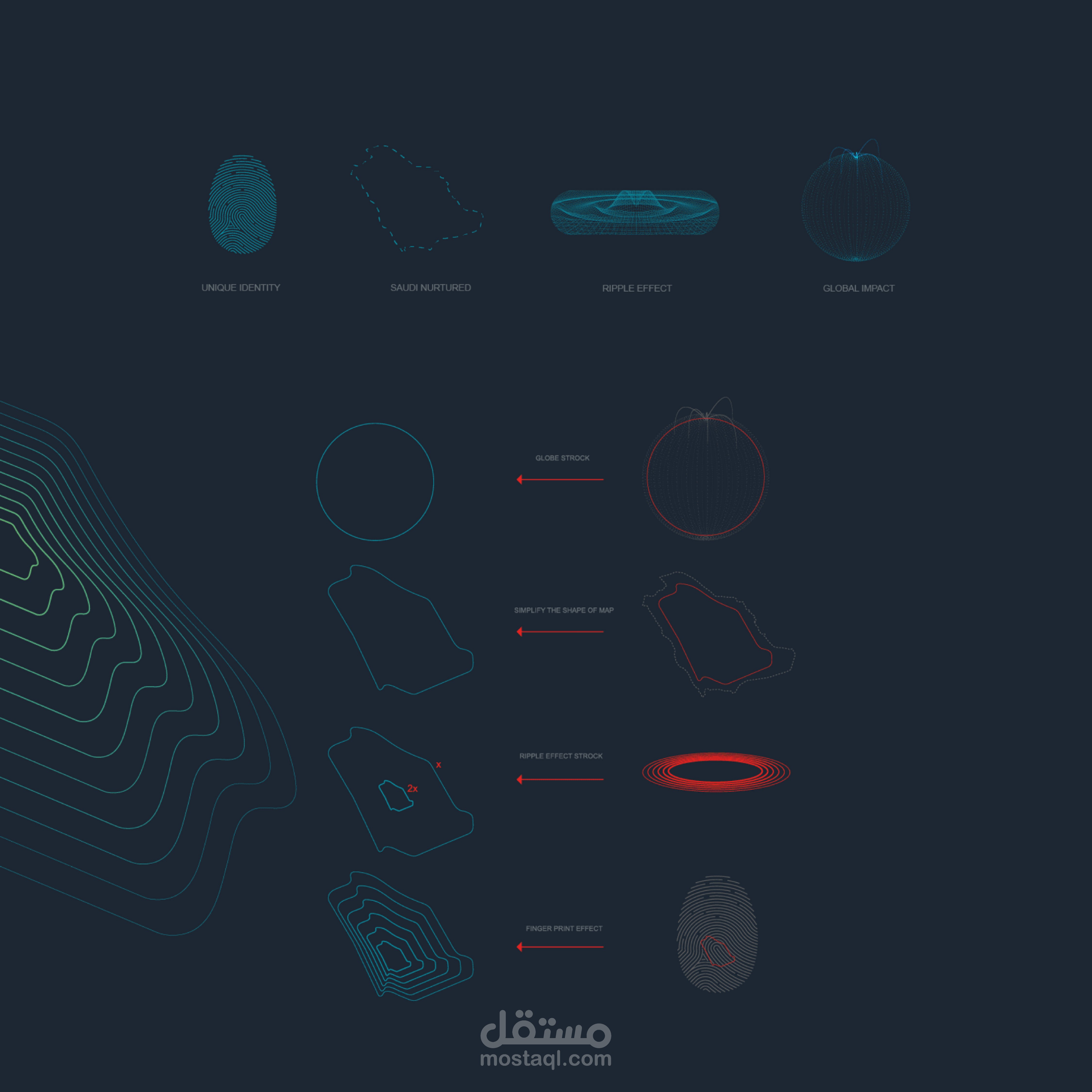 A modern mark blending Saudi roots with a global vision. The design integrates a fingerprint (identity), a stylized Saudi map (origin), circular waves (expanding influence), and a spherical shape (global reach), all crafted with a balance of precision and organic growth.