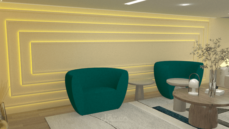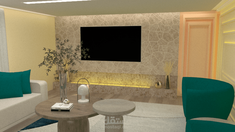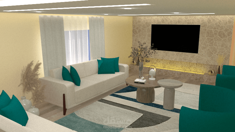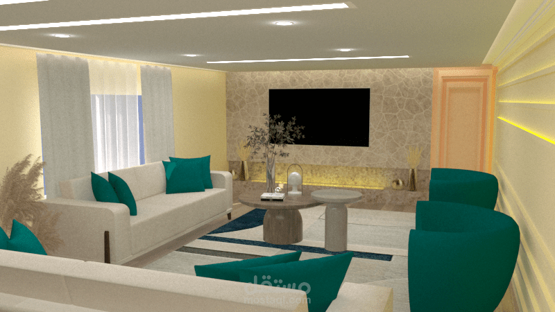 لقد تم تصميم صالون مودرن استخدان الألوان الهادئة والاضاءة الجميلة لابراز جمال الصالون