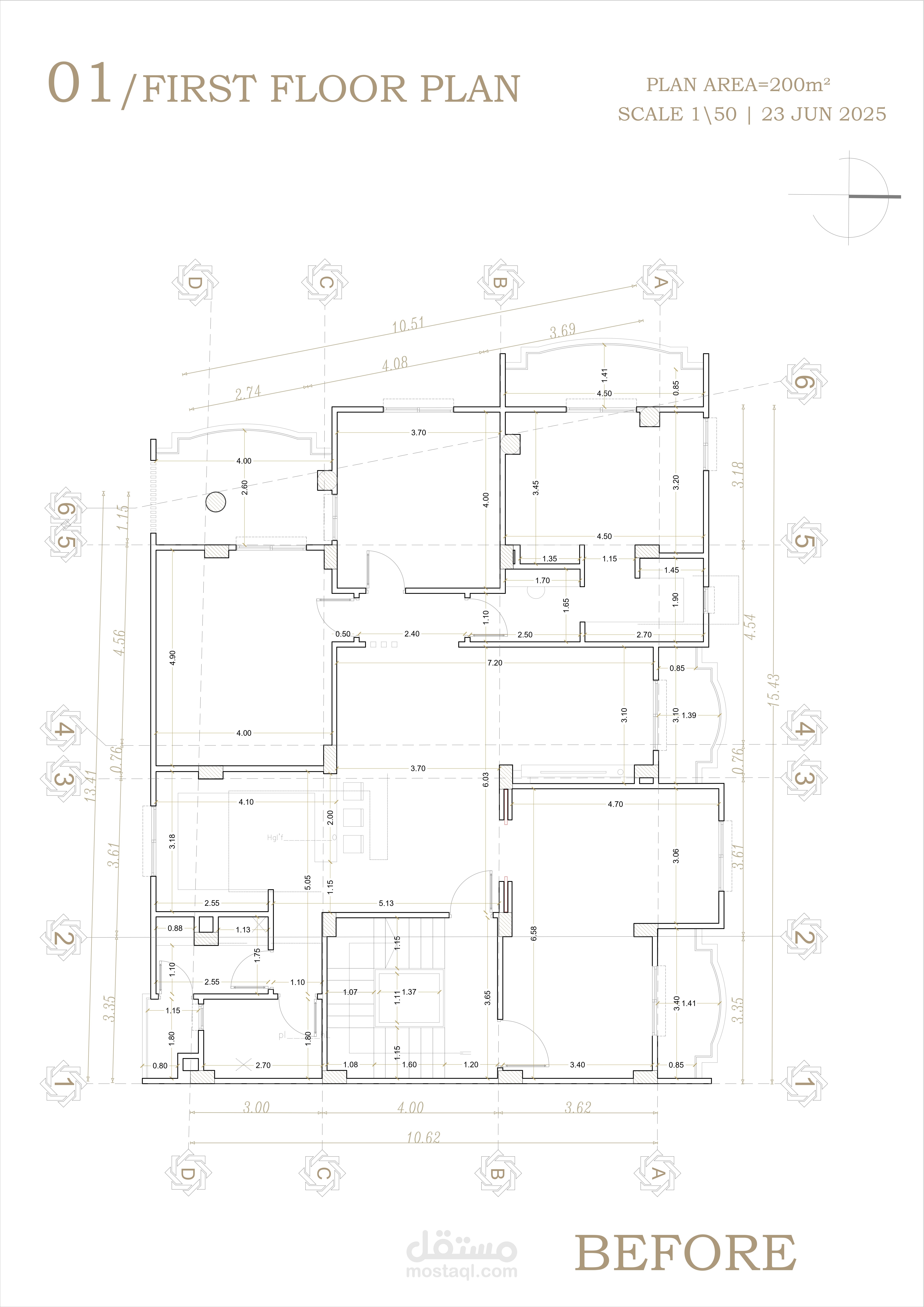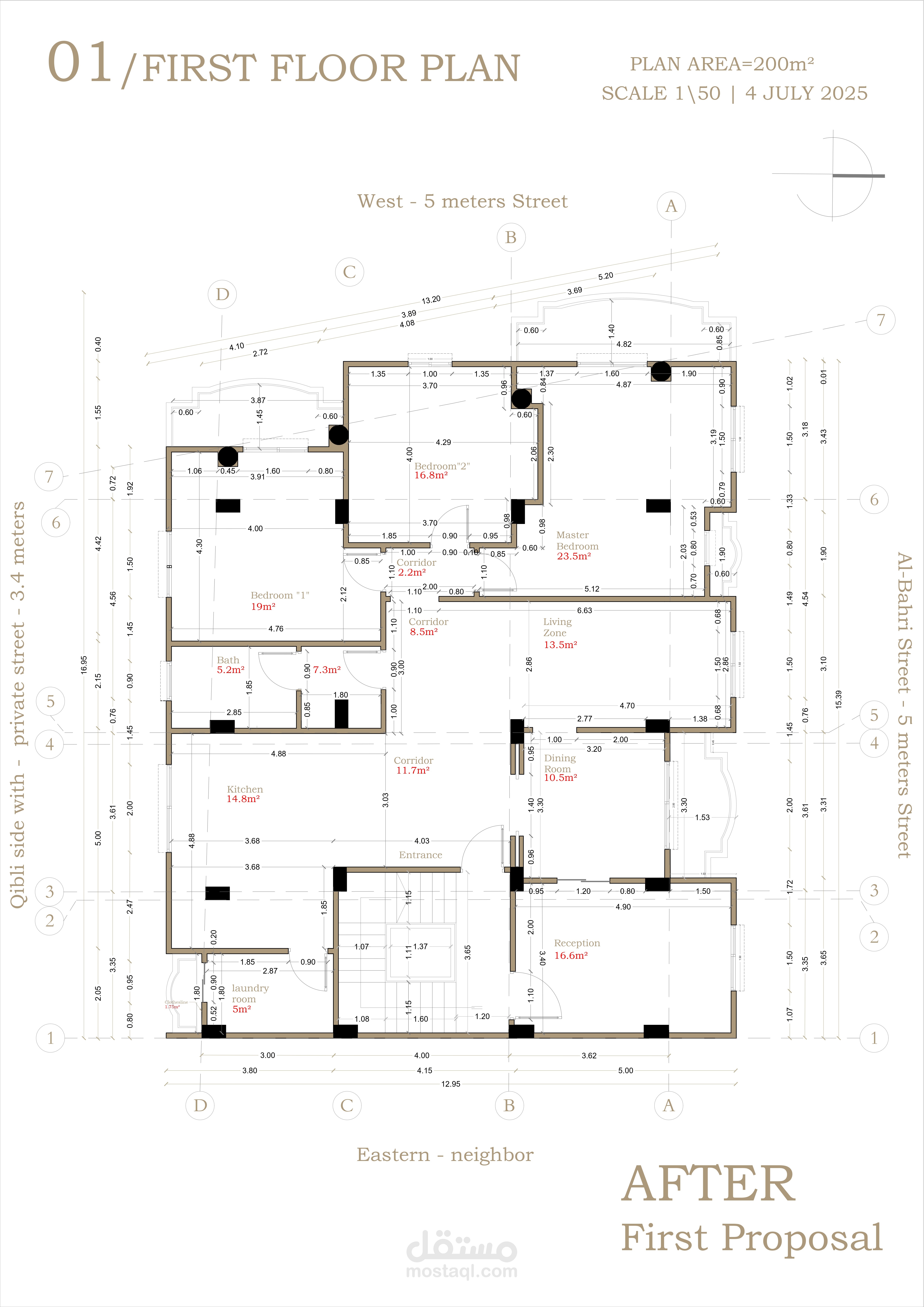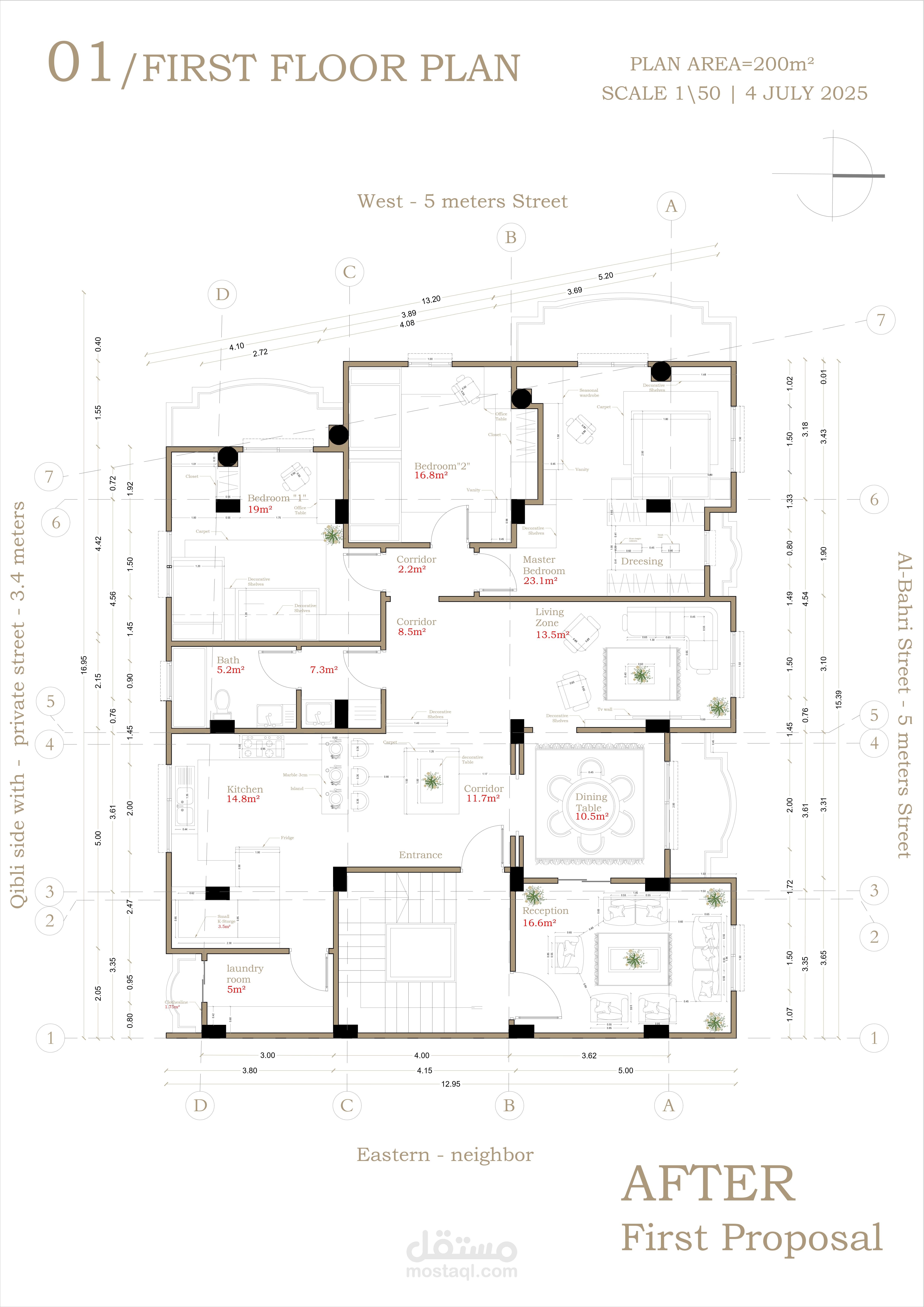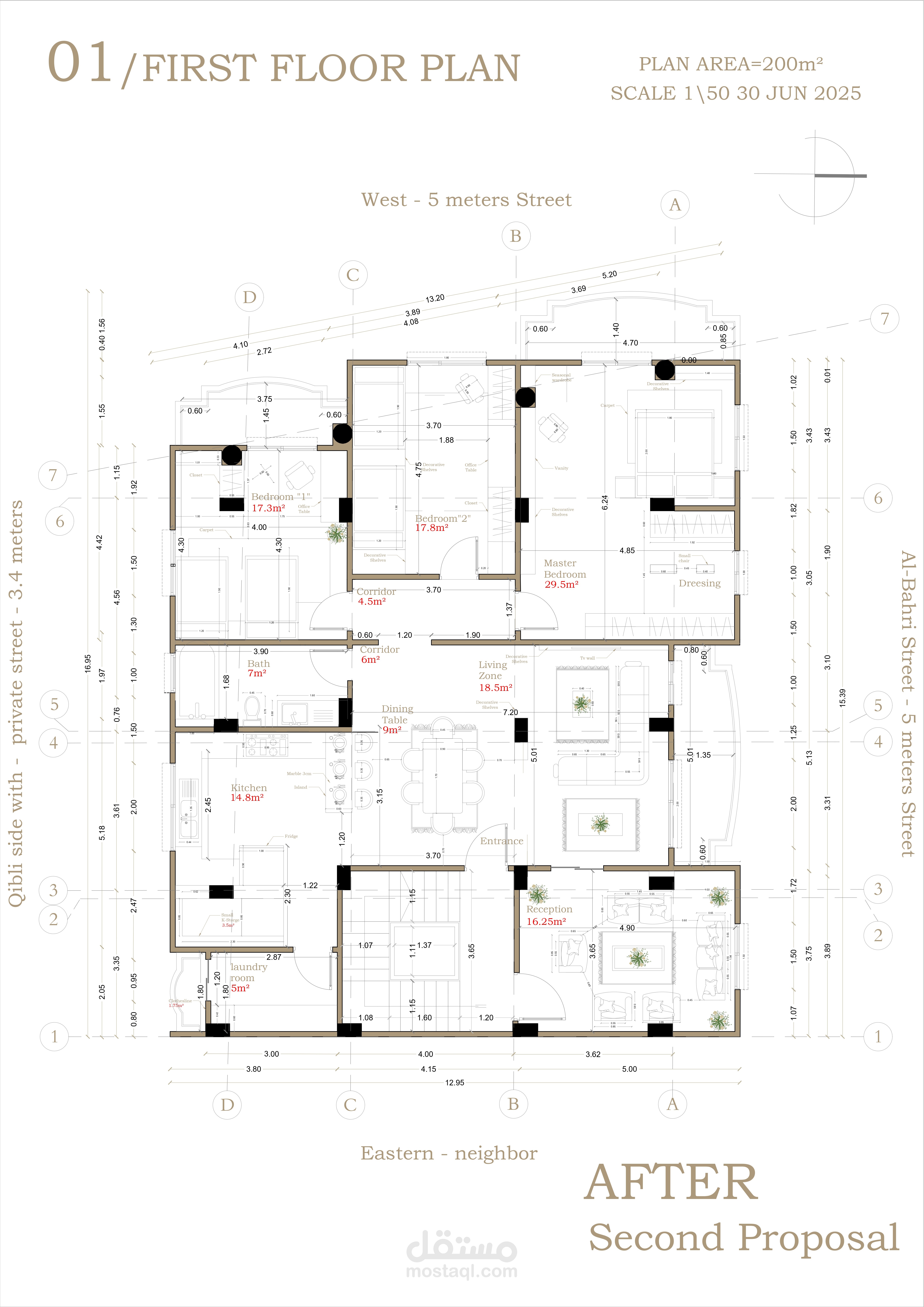 الهدف كان نوزع المساحات بطريقة عملية وأنيقة بنفس الوقت، ونستفيد من الإضاءة الطبيعية قدر الإمكان. وجود الأعمدة رسملي حدود خفية للأماكن ولكنها بالنسبة لي ليست مشكلة فالخبرة لدي في استغلال المساحات والتصميم كافية لحل مشكلات التصميم.