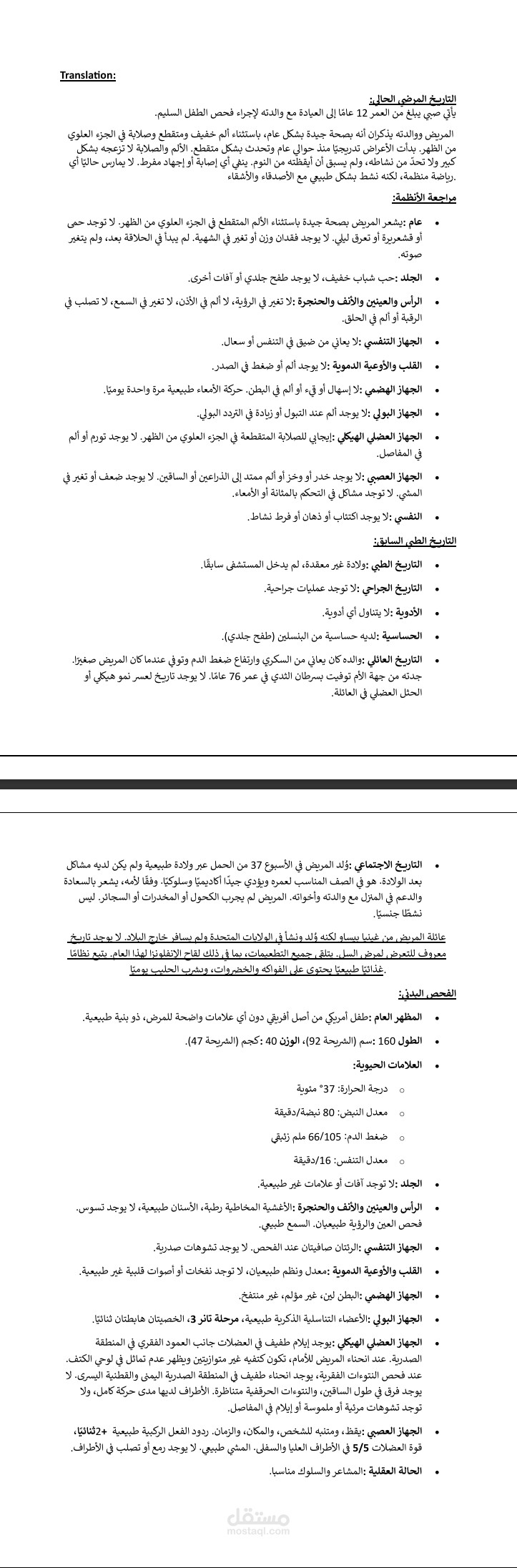 الوصف: ترجمت هذه الحالة المرضية من ملف سريري يوضح التاريخ المرضي ونتائج الفحص المبدئي لطفل يعاني من ألم خفيف ومتقطع وصلابة في الجزء الأعلى من الظهر.