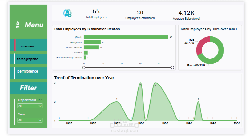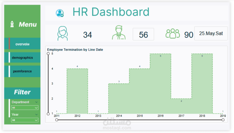قمت بتصميم لوحة معلومات تفاعلية باستخدام Power BI لتحليل بيانات الموارد البشرية، بهدف عرض مهاراتي كمحللة بيانات ومطورة لوحات BI. يركز المشروع على تحليل التوزيع الديموغرافي للموظفين، معدل الدوران، وتوزيع النوع، باستخدام مؤشرات أداء واقعية وتقنيات عرض بصري تساعد في اتخاذ قرارات مبنية على البيانات.