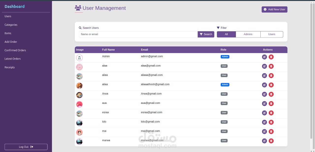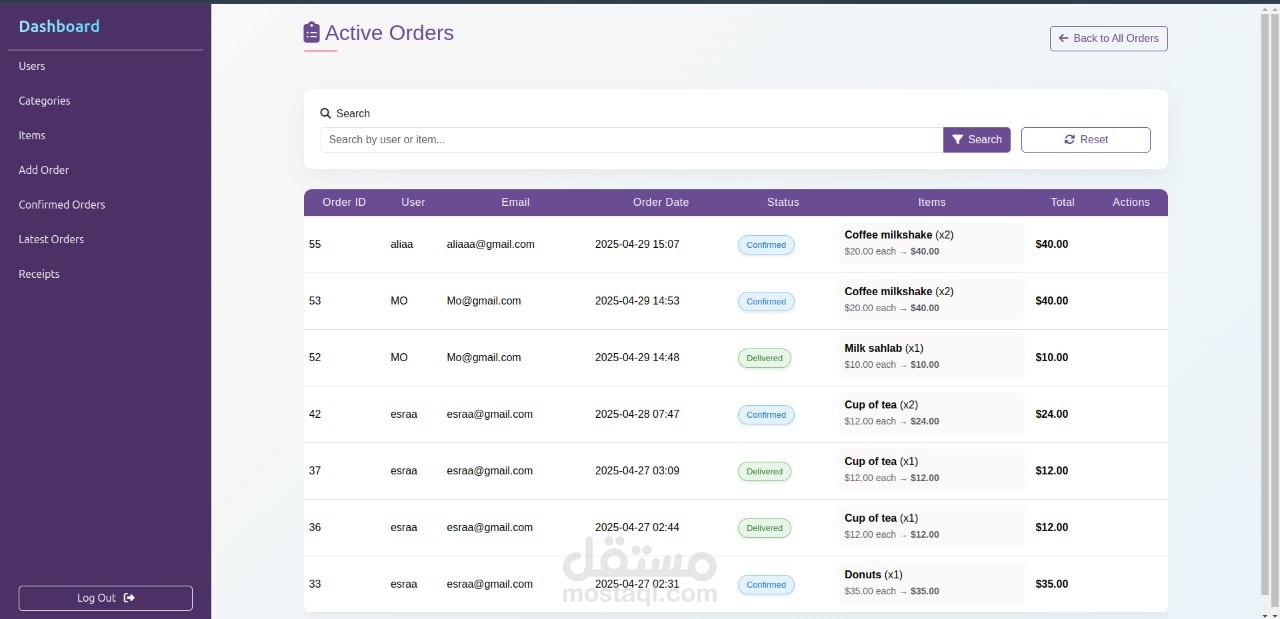 لوحة تحكم للمسؤول (Dashboard): يمكن من خلالها إدارة الأصناف، ومتابعة الطلبات، وتحديث حالة كل طلب (مثل: قيد الانتظار، قيد التحضير، تم التوصيل)، بالإضافة إلى إمكانية عرض التقارير وطباعة الفواتير.