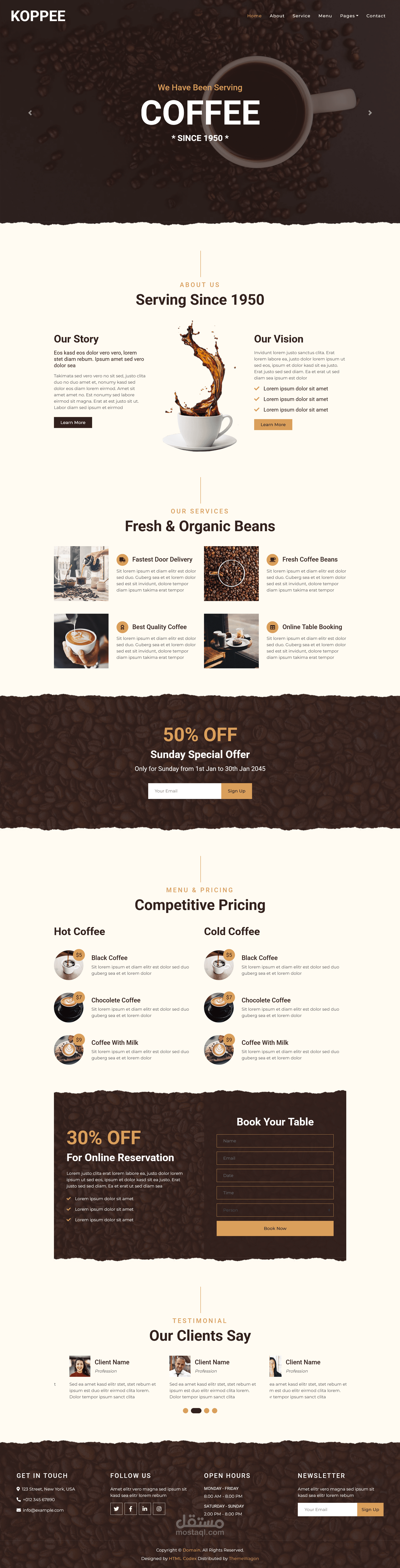 موقع ويب احترافي لمقهى (Coffee Shop) مصمم بتقنيات حديثة، يحتوي على صفحات رئيسية مثل: