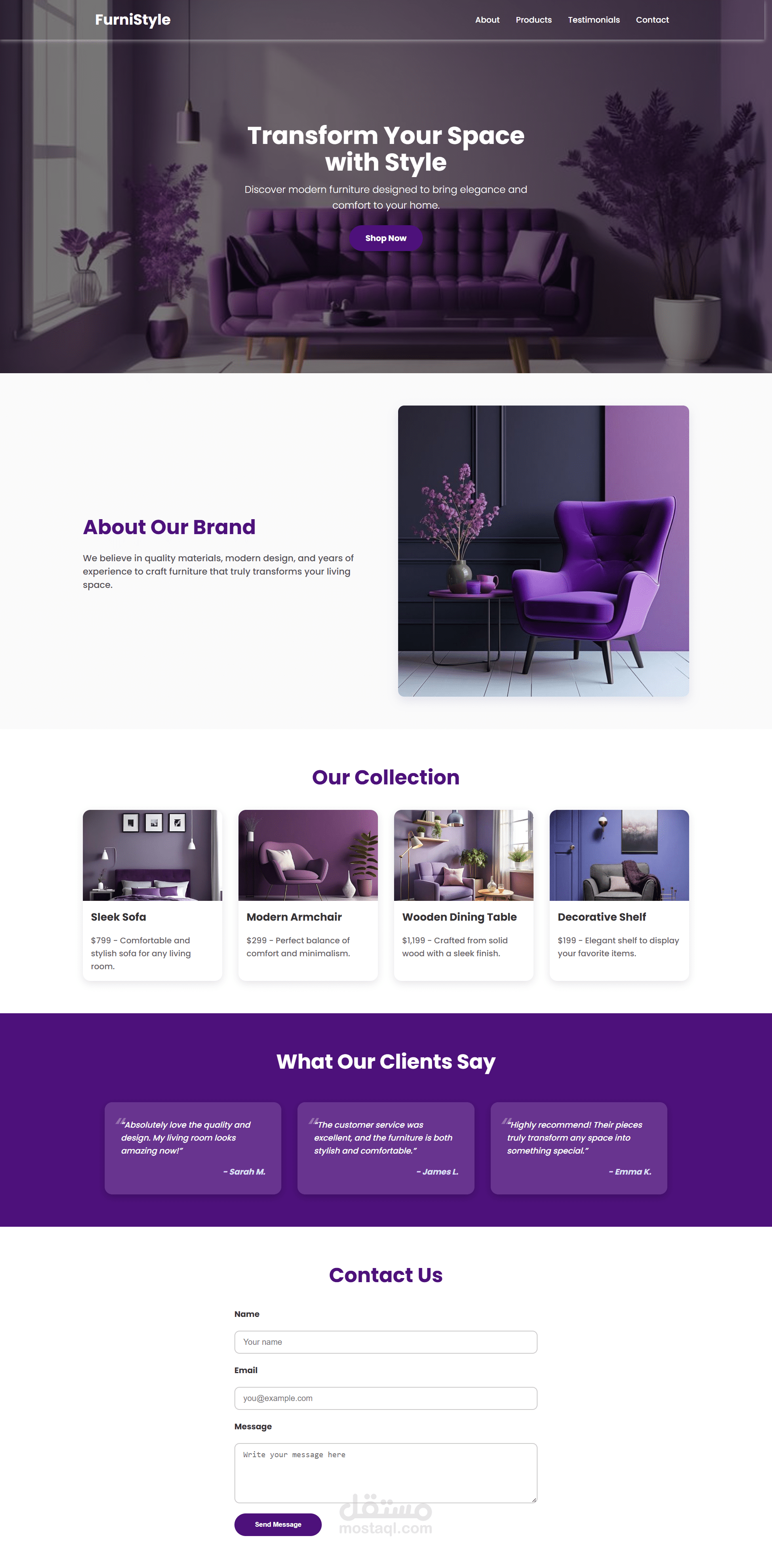 تم تصميم صفحة هبوط كاملة لموقع "FurniStyle" المتخصص في بيع الأثاث المنزلي العصري. التصميم يتميز بجاذبيته البصرية وتناسق الألوان الأنيقة (درجات البنفسجي) التي تعكس هوية العلامة التجارية الراقية. تضمنت الصفحة: