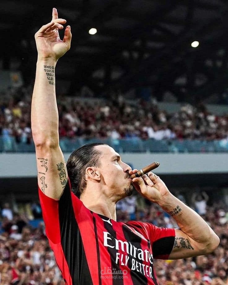 صورة ظلية (سيلويت) للاعب يشير إلى السماء بيده اليمنى بينما يدخن سيجارًا، في وضعية تعبيرية توحي بالفخر والثقة بالنفس. على قميصه عبارة "Emirates Fly Better" وهو الشعار الرسمي لرعاية نادي ميلان.