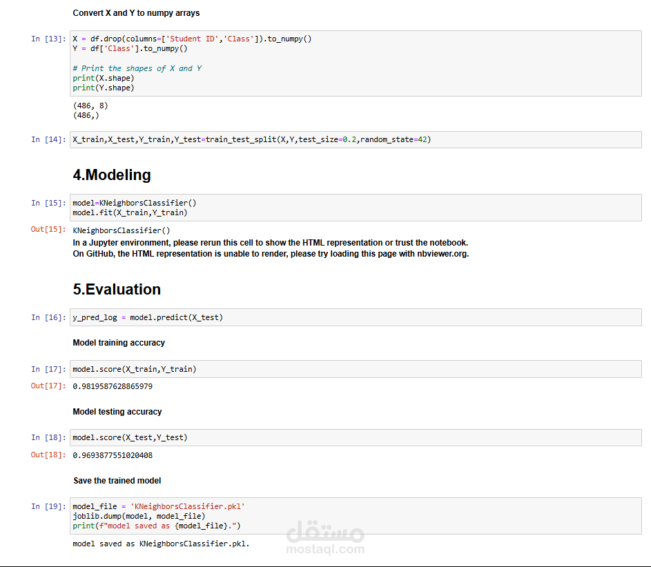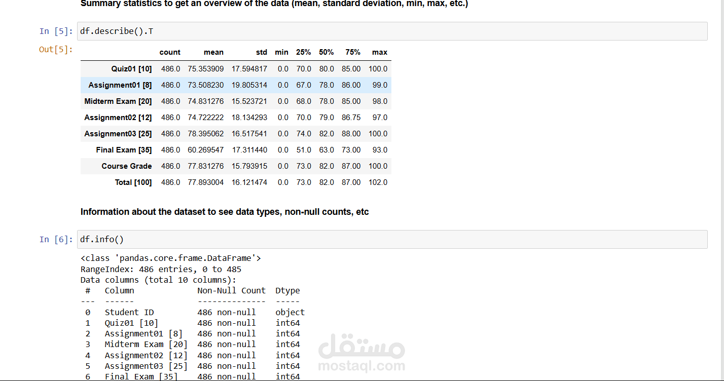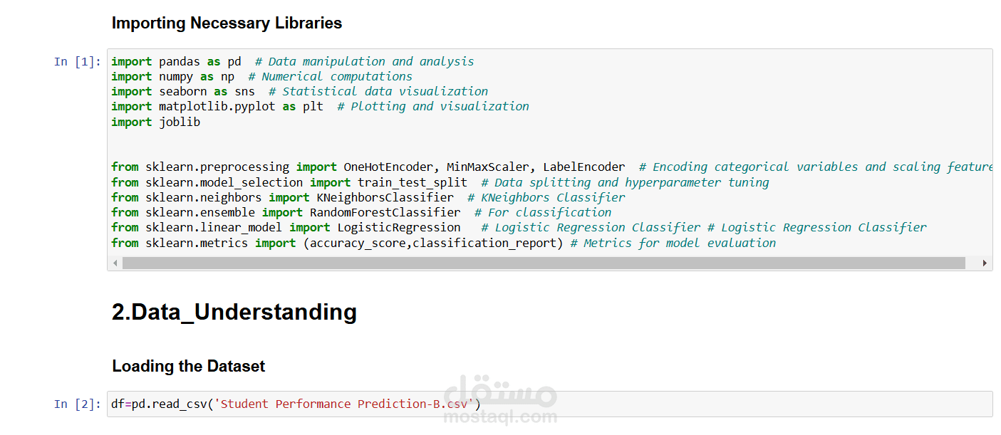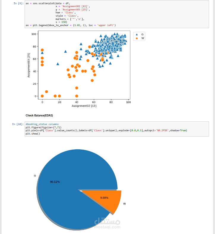 The data analysis includes exploratory data analysis (EDA) with visualizations like box plots, scatter plots, and pie charts to understand the distribution of grades (e.g., Assignment01, Assignment02, Final Exam) across classes (G and W). The dataset, loaded from "Student_Performance_Prediction-B.csv," contains 486 entries with 10 columns, including student IDs and various assessment scores.