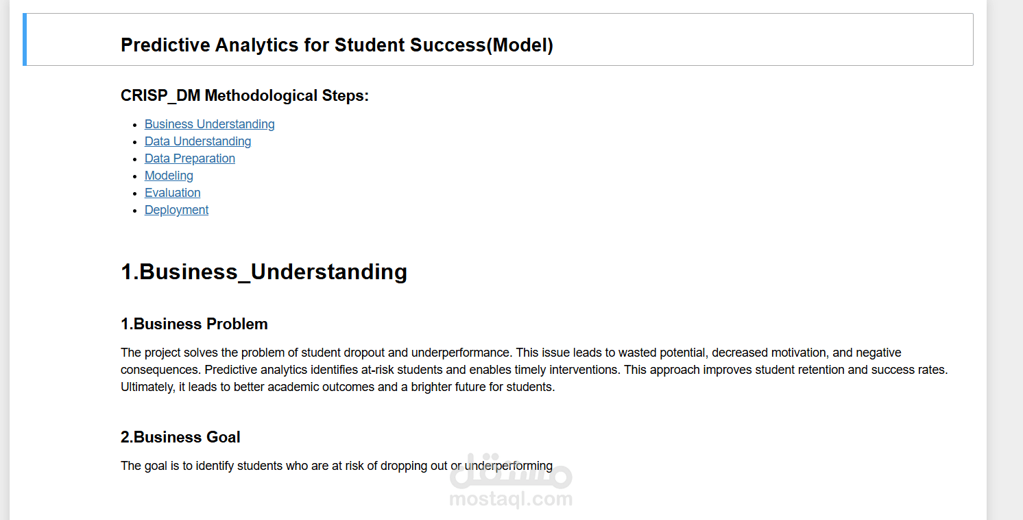 The project "Predictive Analytics for Student Success" aims to address the issues of student dropout and underperformance by leveraging predictive analytics. Using the CRISP-DM methodology (Business Understanding, Data Understanding, Data Preparation, Modeling, Evaluation, and Deployment), it identifies at-risk students and enables timely interventions to improve retention and success rates. The business problem involves mitigating wasted potential and negative consequences, ultimately leading to better academic outcomes. The goal is to identify students at risk of dropping out or underperforming.