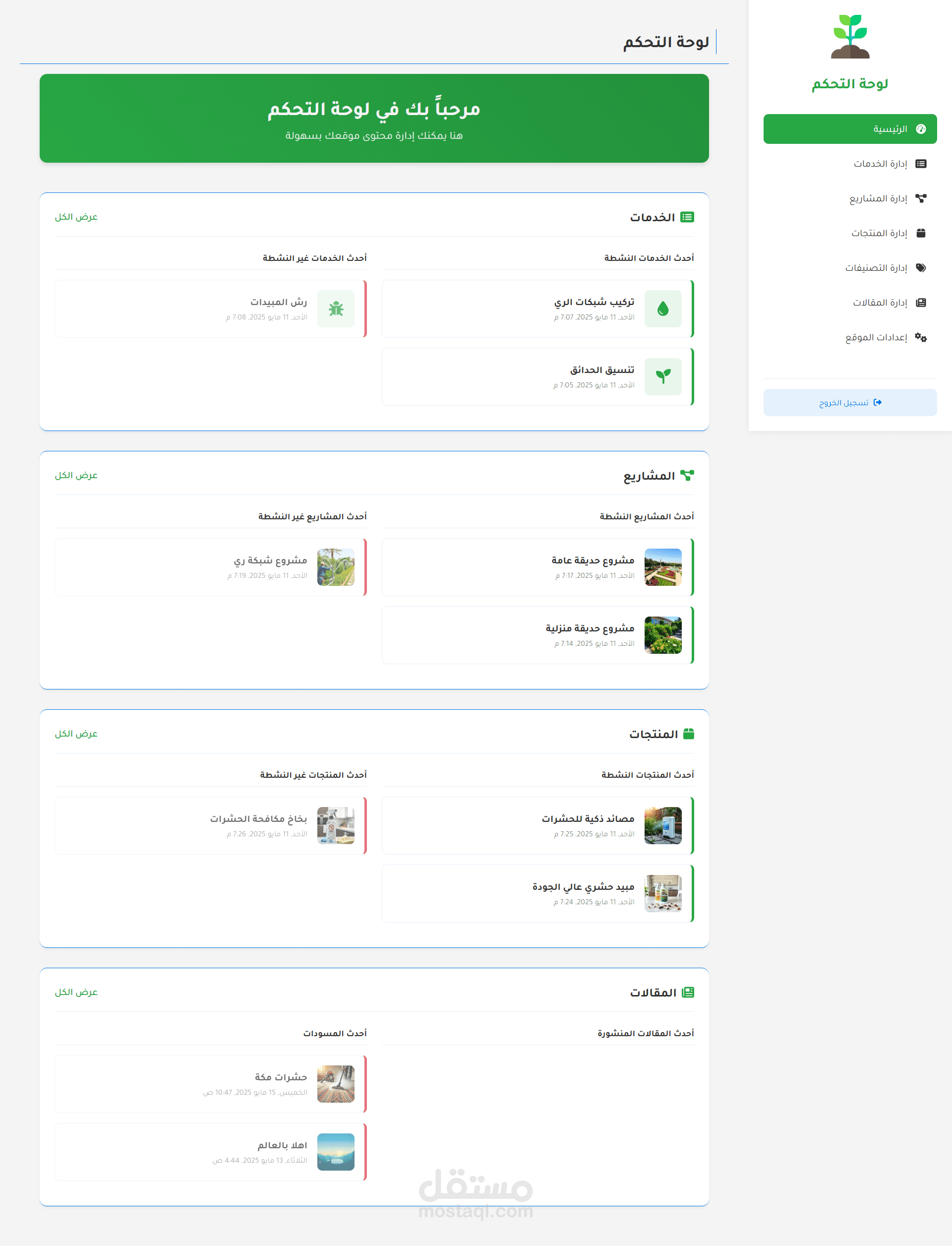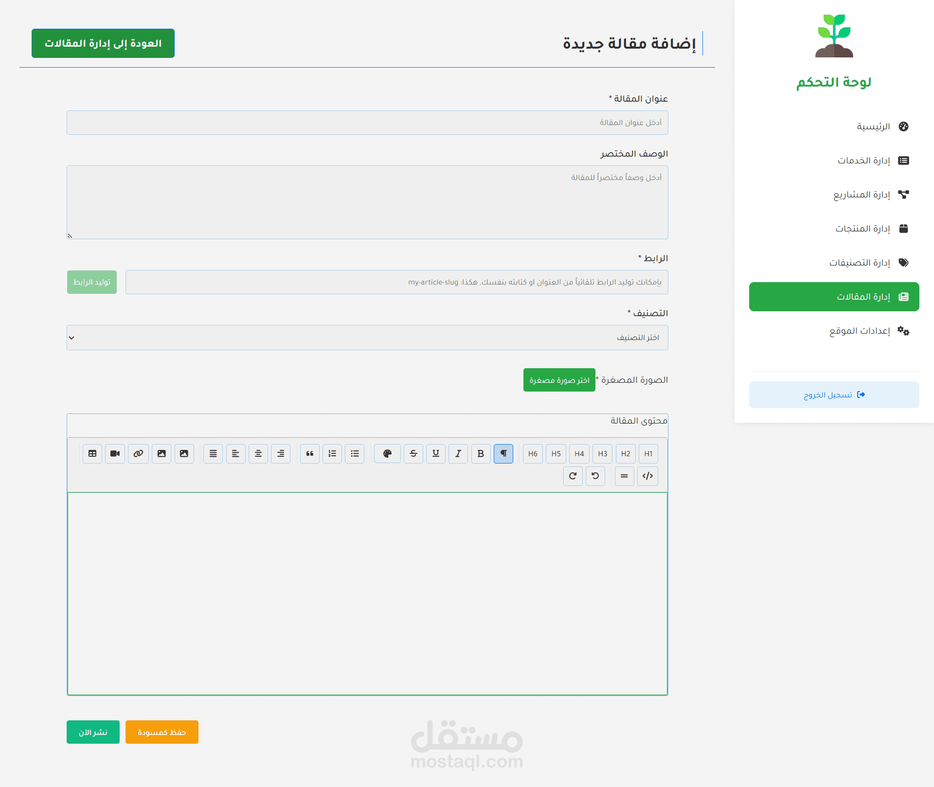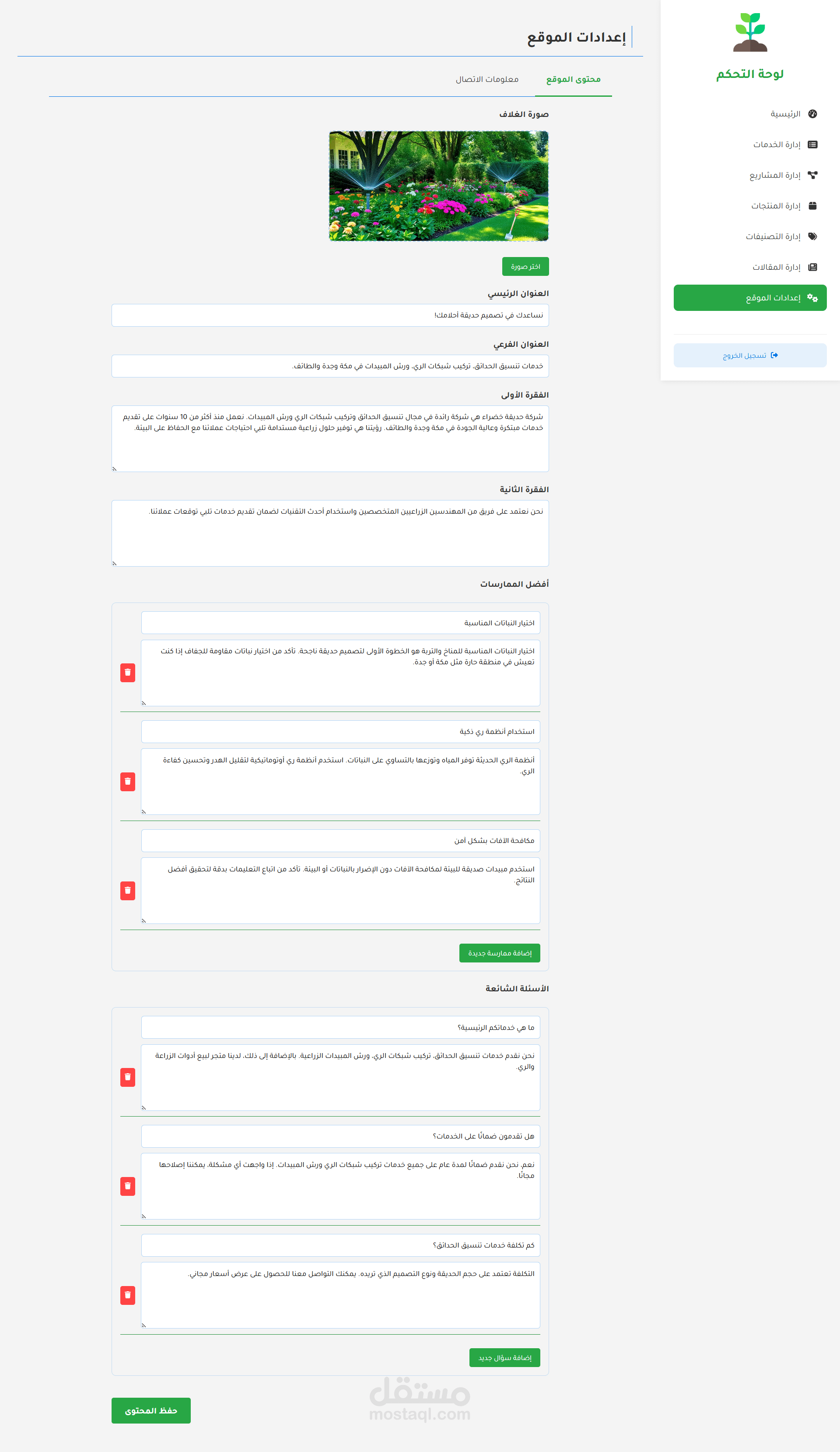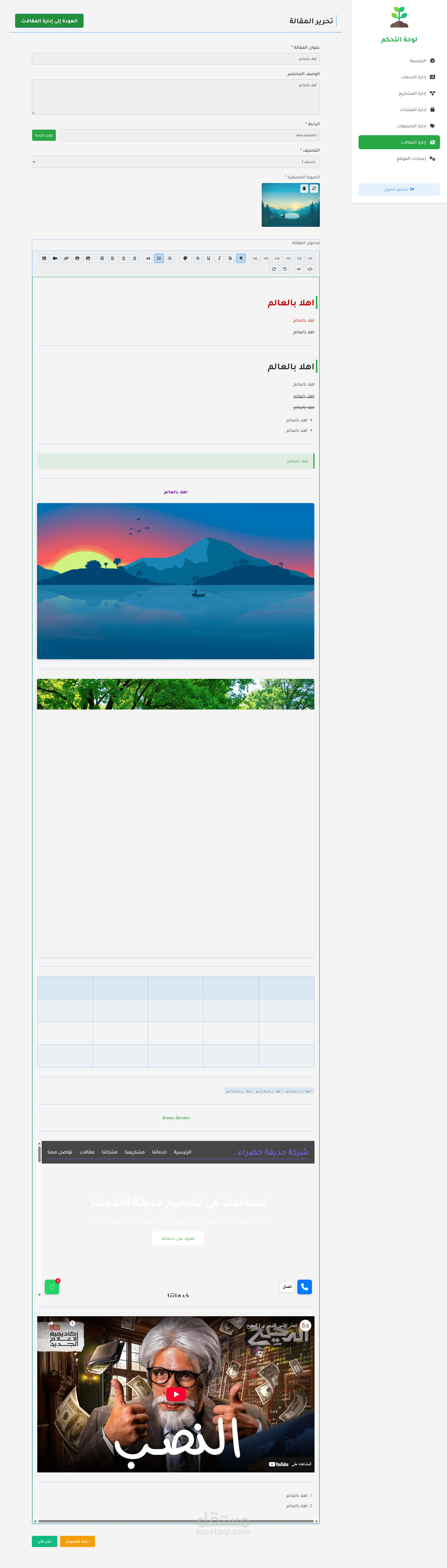 الميزة الإدارية: إدارة المحتوى: إنشاء المقالات وإدارتها باستخدام محرر النصوص الغني (TipTap)، إدارة كتالوج المنتجات، إدارة قوائم الخدمات، إدارة محفظة المشاريع