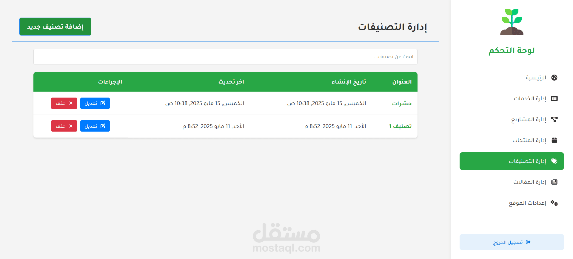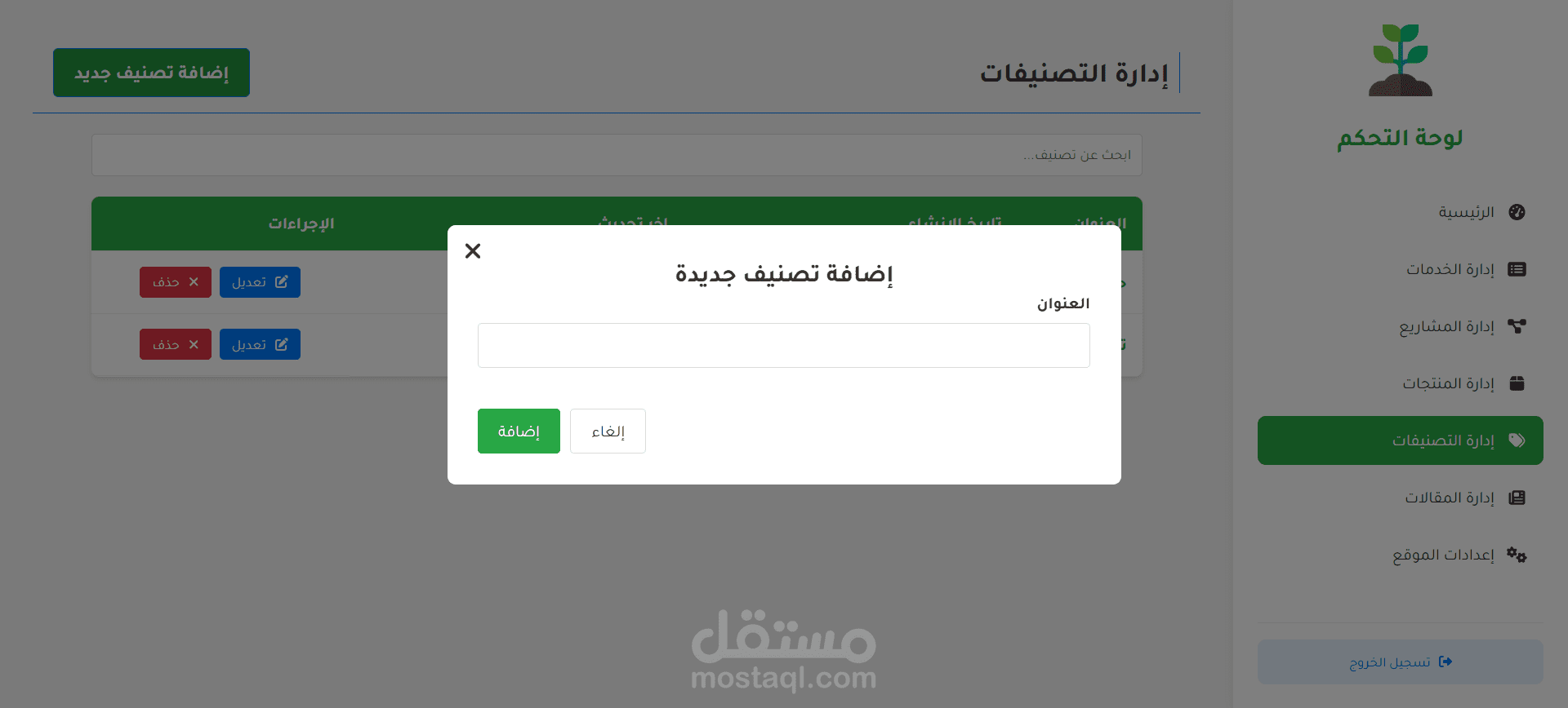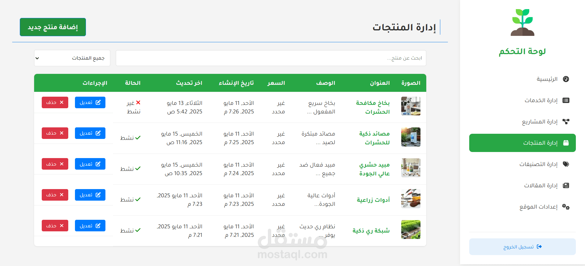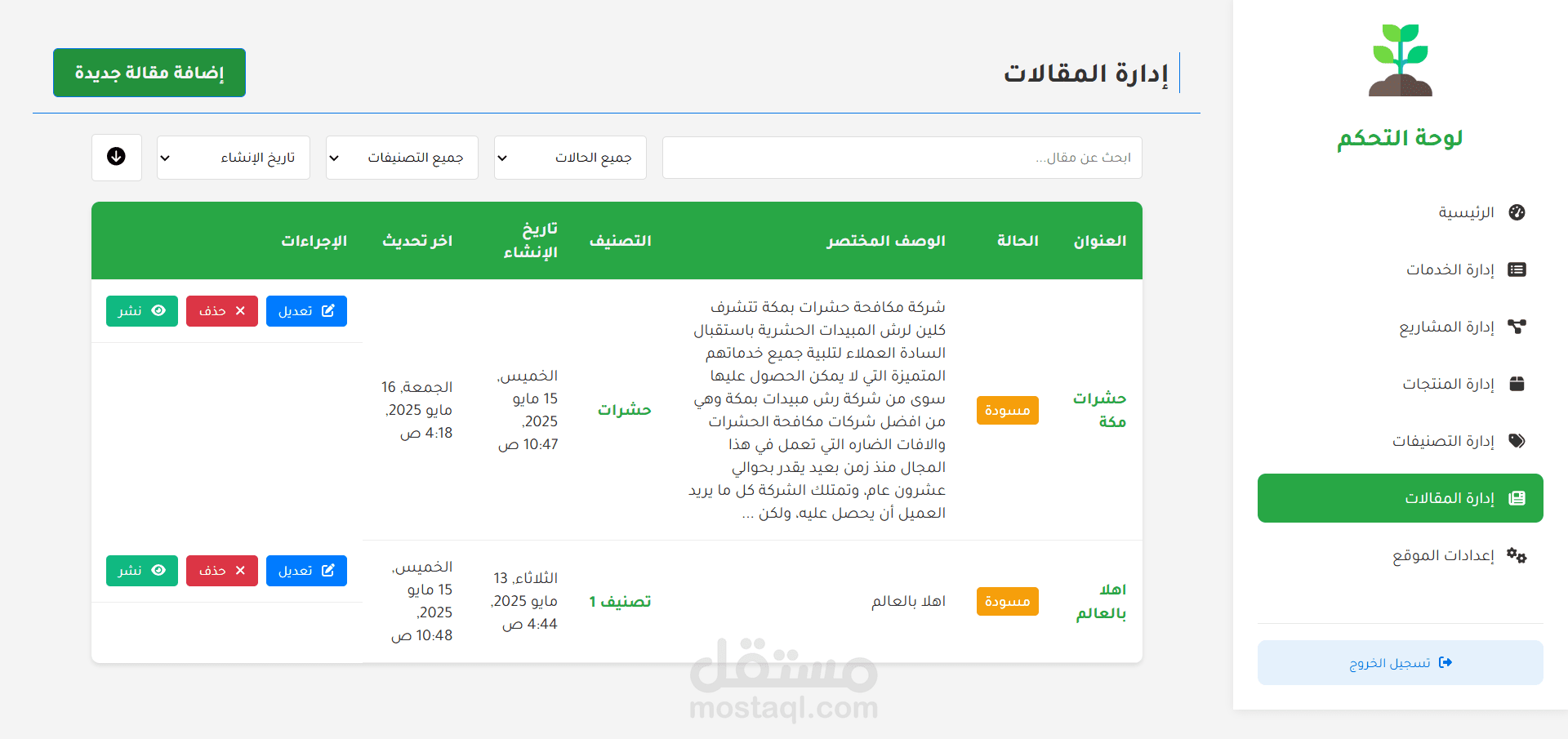 الميزة الإدارية: إدارة المحتوى: إنشاء المقالات وإدارتها باستخدام محرر النصوص الغني (TipTap)، إدارة كتالوج المنتجات، إدارة قوائم الخدمات، إدارة محفظة المشاريع