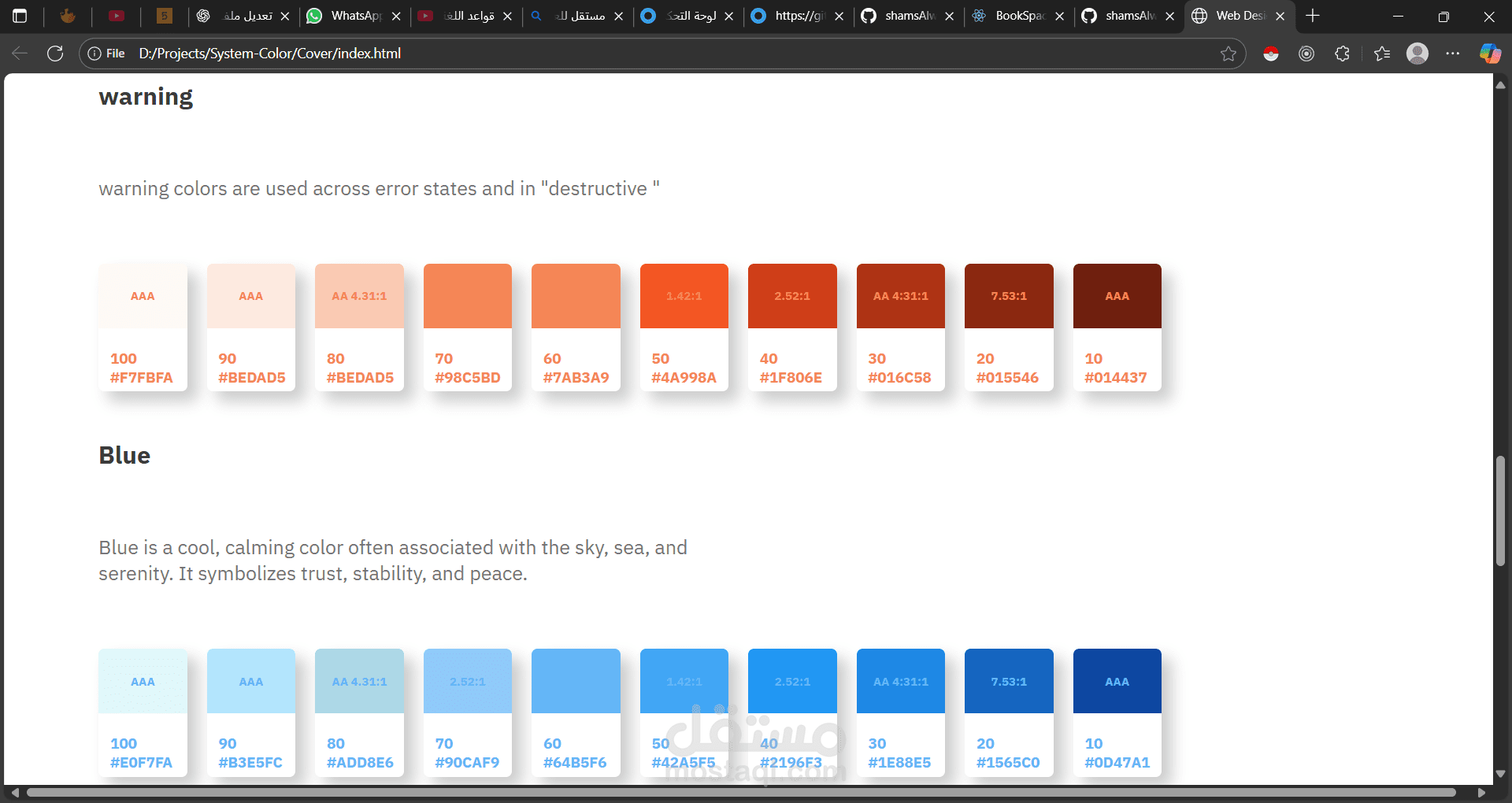 لوحة ألوان متدرجة تعرض رموز HEX ونسب التباين (contrast ratio) لتقييم قابلية القراءة.
