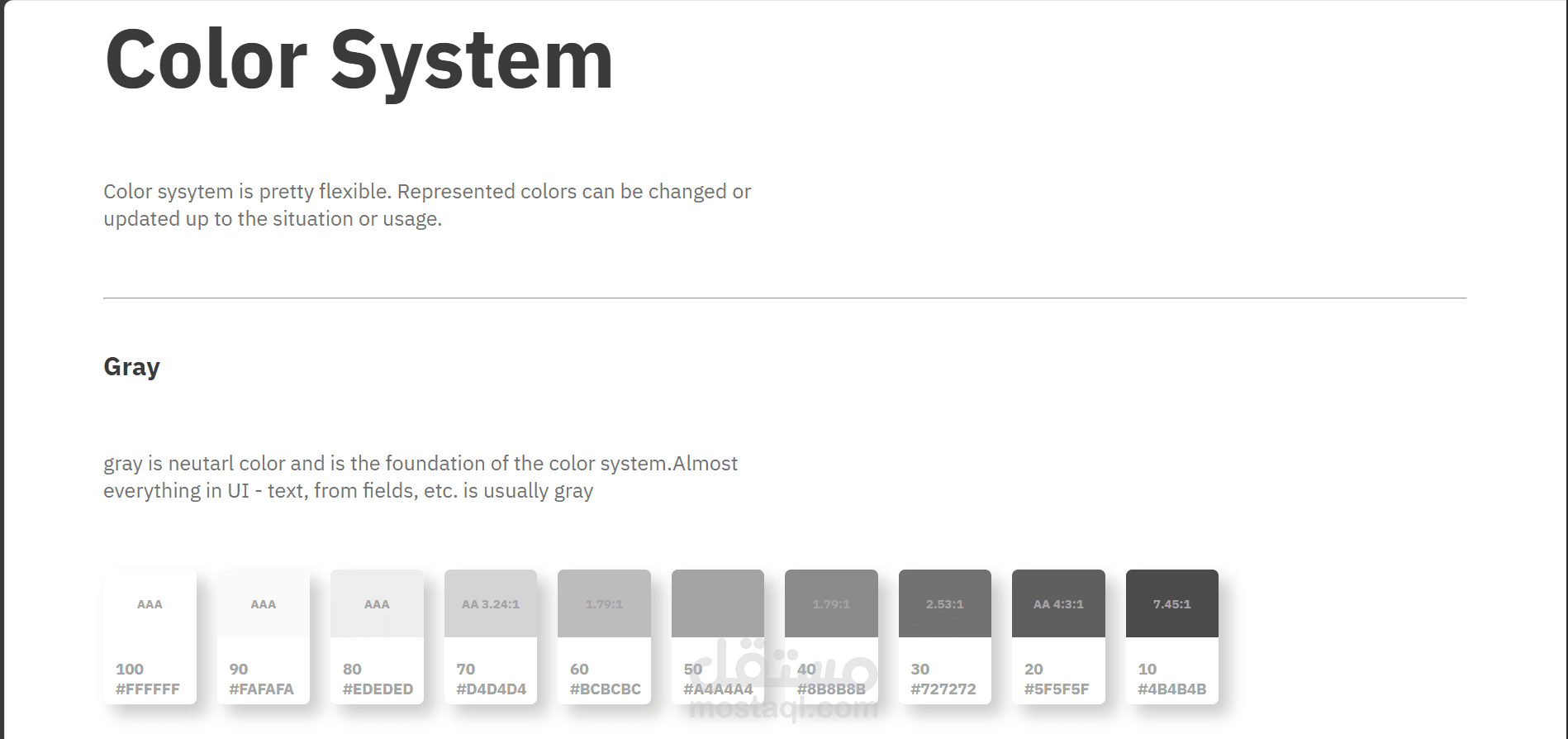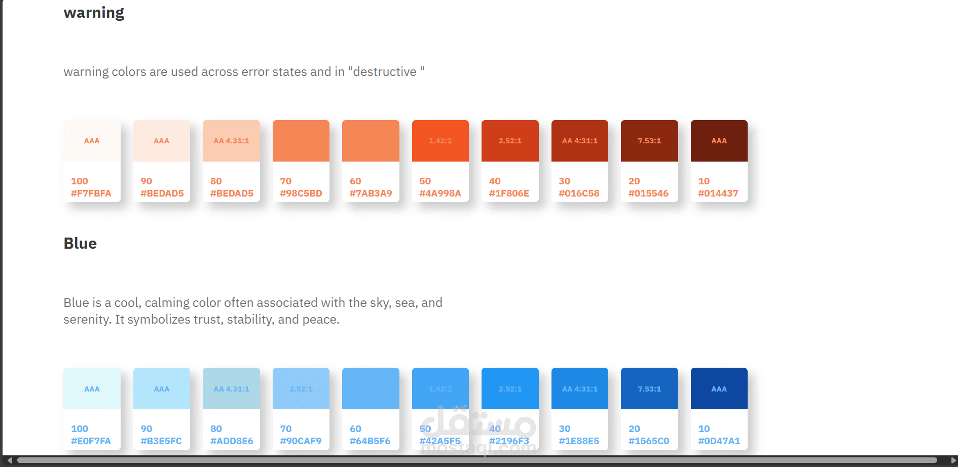 لوحة ألوان متدرجة تعرض رموز HEX ونسب التباين (contrast ratio) لتقييم قابلية القراءة.