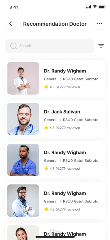 عرض قائمة الأطباء الموصى بهم مع تقييماتهم وتفاصيلهم.