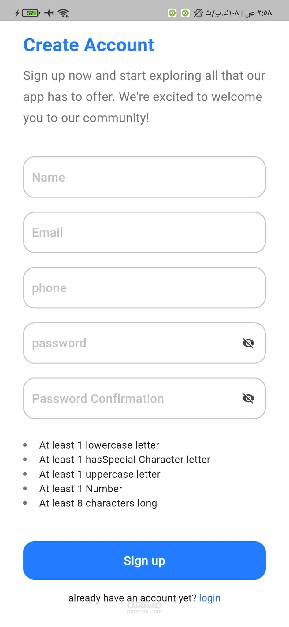 تصميم وتنفيذ شاشات تسجيل الدخول، إنشاء حساب، والصفحة الرئيسية.
