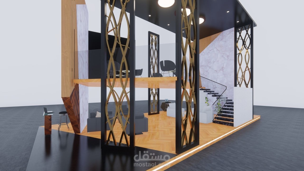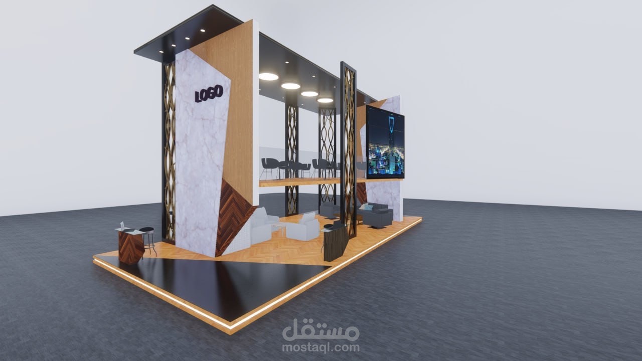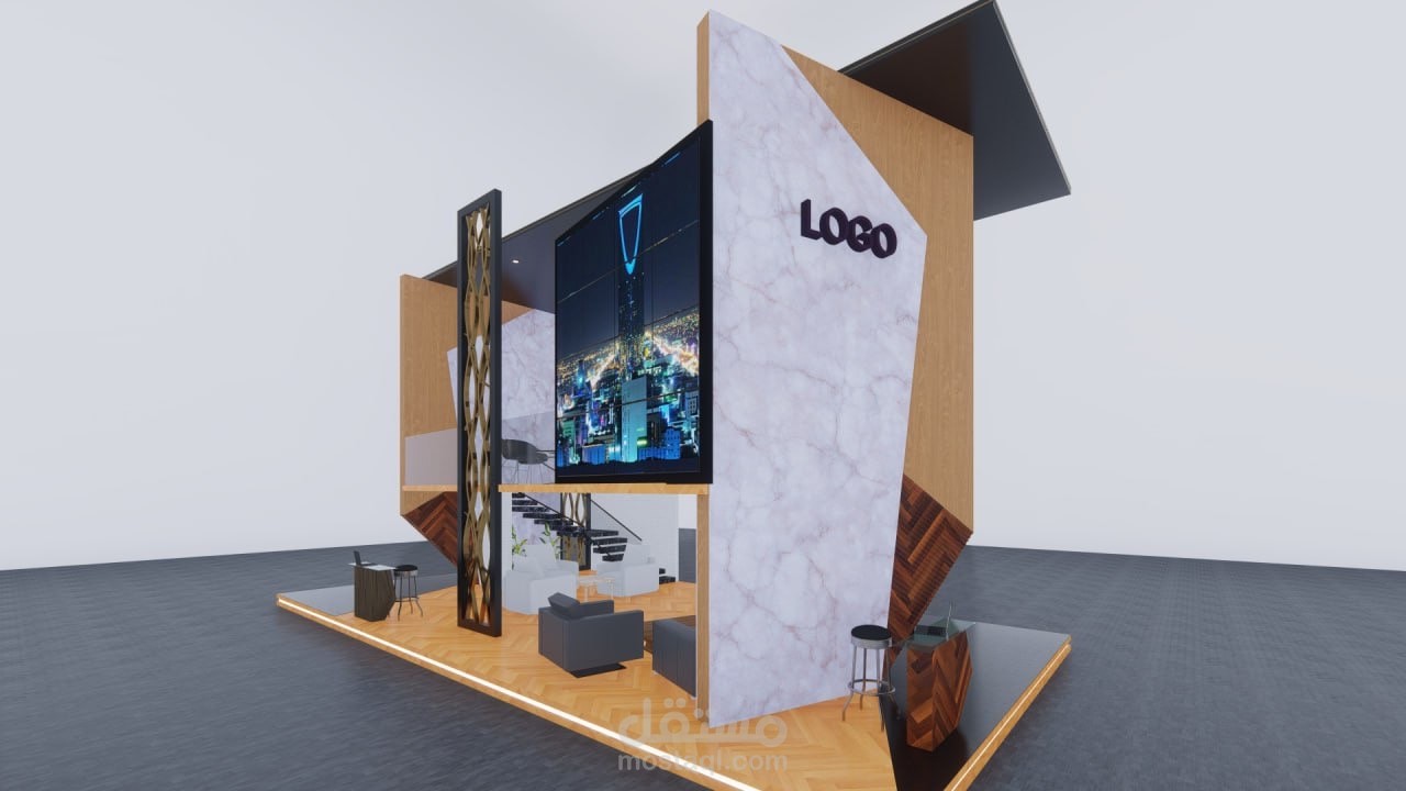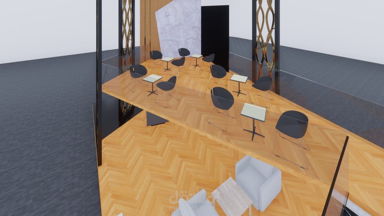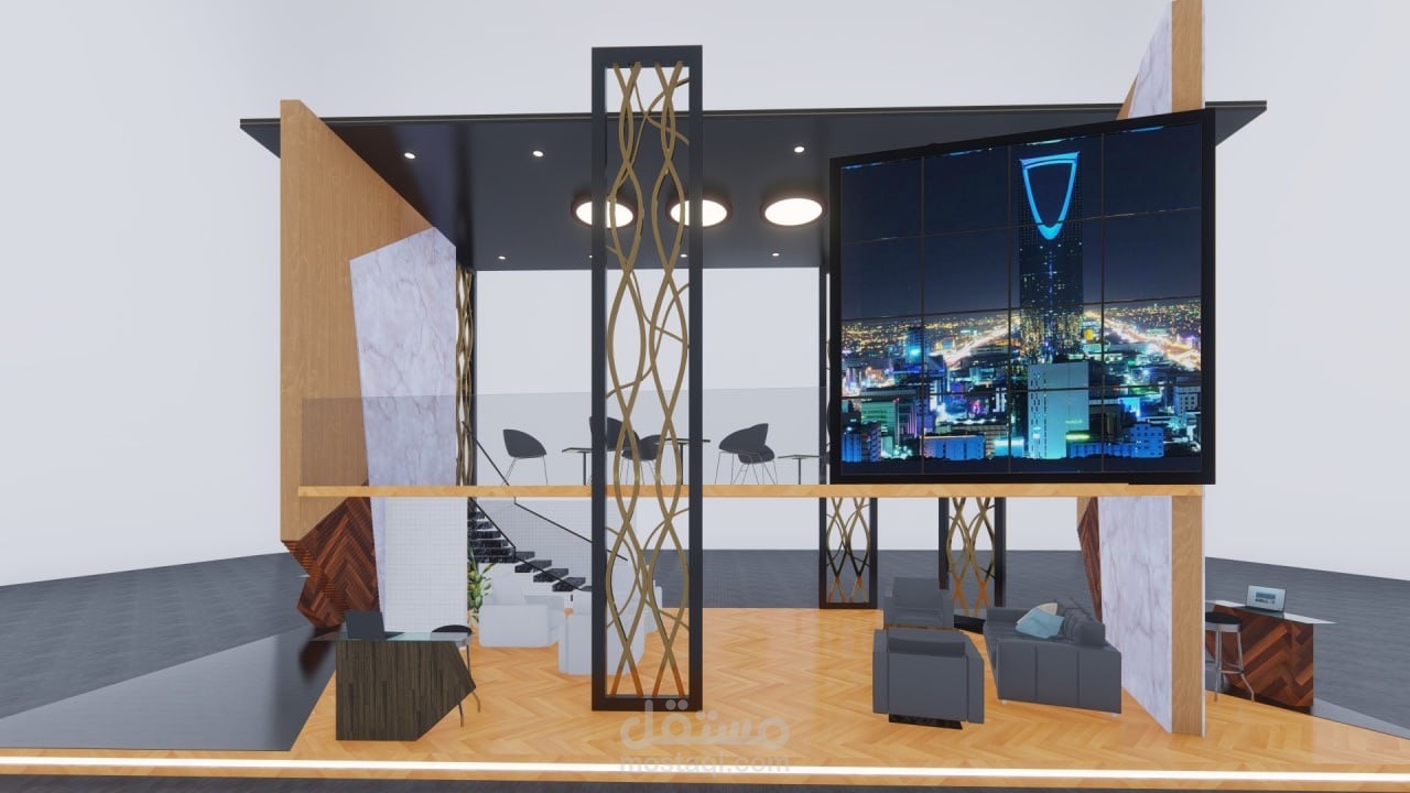 تصميم جناحٍ عصري يجمع بين الأناقة والوظائف العملية، مع شاشة عرض بانورامية تُبرز معالم المدينة وإطلالة علوية مخصصة للاجتماعات الراقية."