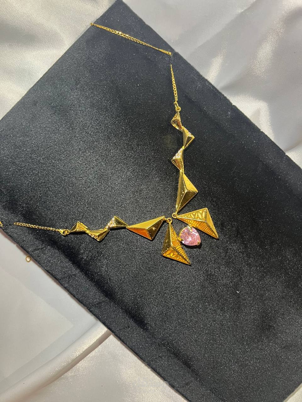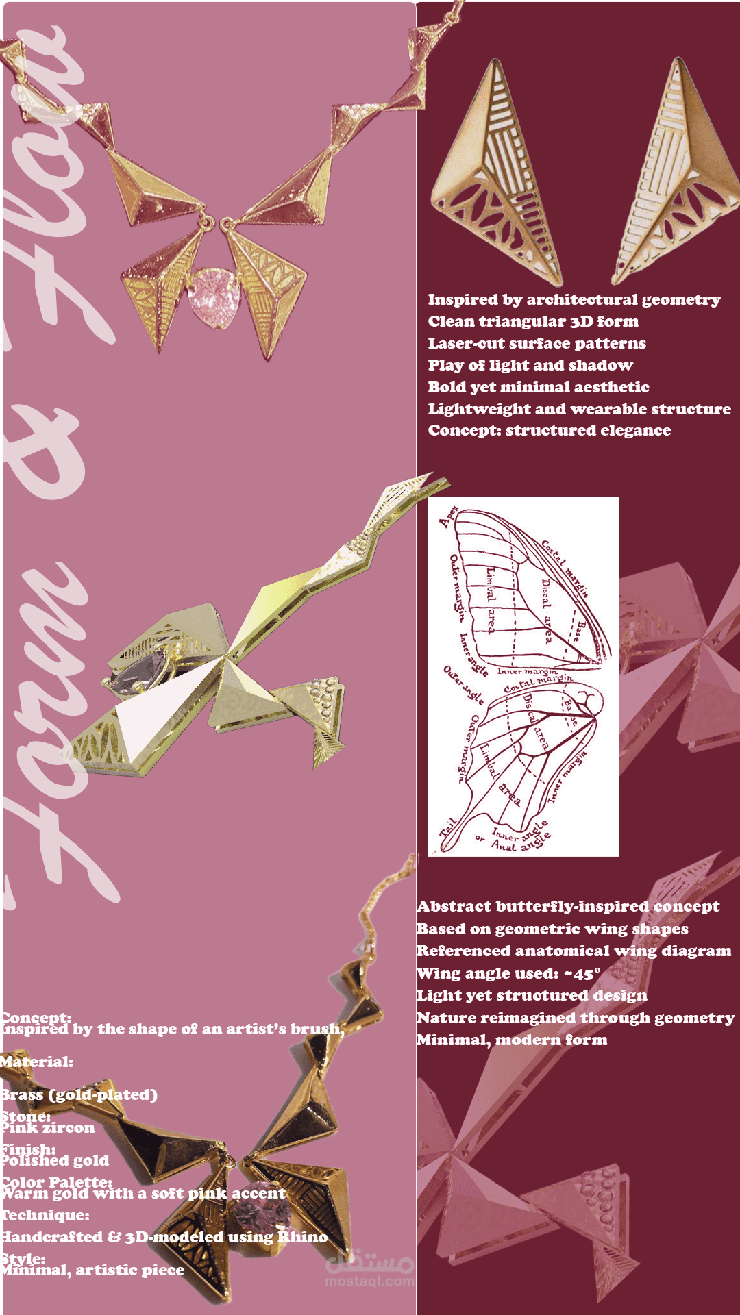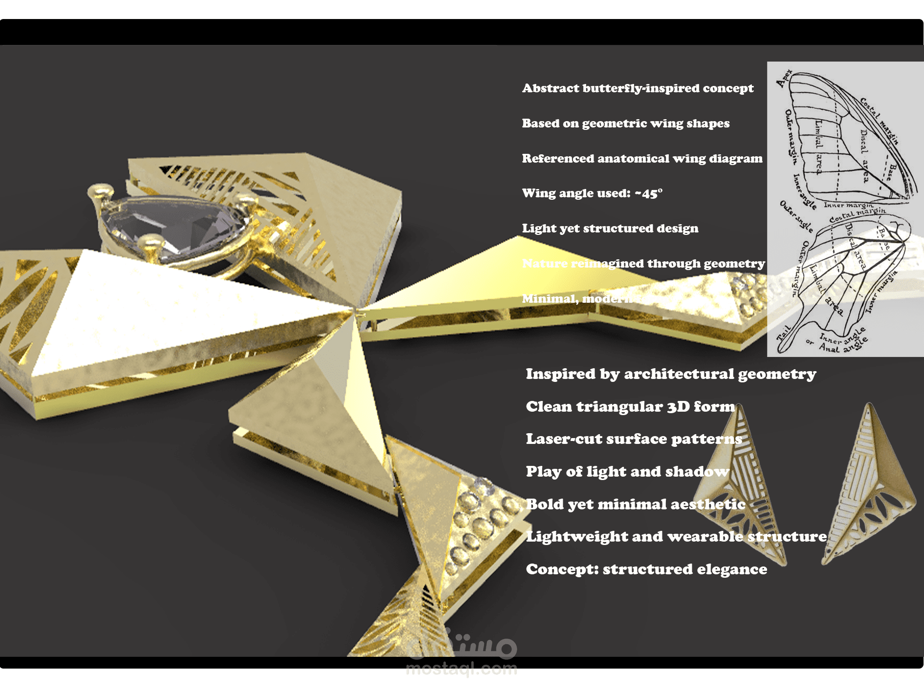 The design is inspired by the natural elegance of a butterfly, reimagined through abstract geometric forms. Rather than directly mimicking the literal shape of a butterfly, the piece captures its essence — the symmetry, the lightness, and the sense of graceful movement — using simplified lines and structured angles. The result is a modern interpretation that blends nature with geometry, creating a wearable sculpture that feels both artistic and architectural.