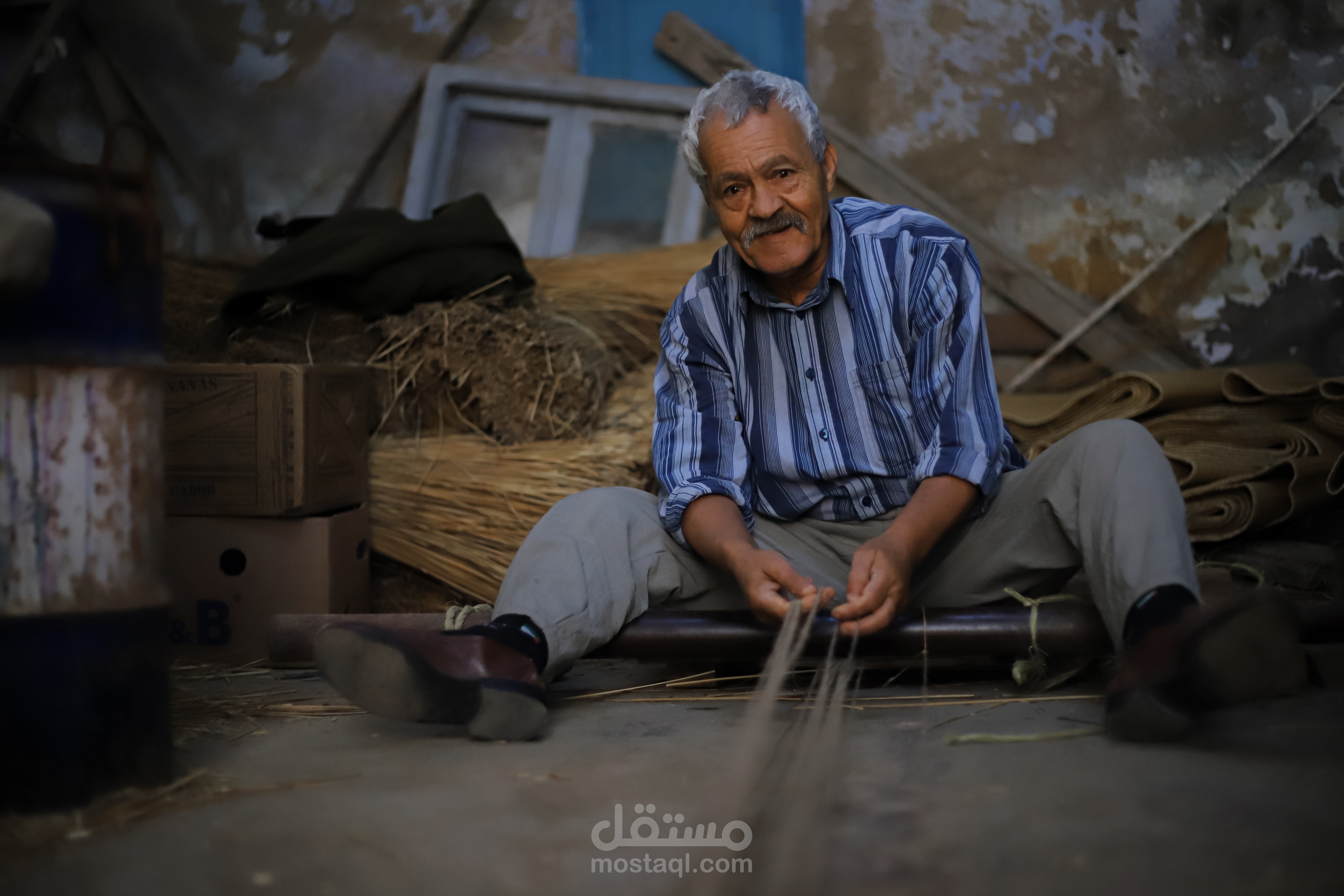 The setting tells a story of authenticity and heritage. The backdrop is a modest workshop with stacked hay, cardboard boxes, and rolled mats—elements that reflect a rural, handmade world. The wall behind him, weathered and textured, adds a rustic charm and depth to the scene. His striped shirt and well-worn shoes give him a humble, grounded appearance, while his kind smile and direct gaze toward the camera convey warmth, dignity, and pride in his craft.