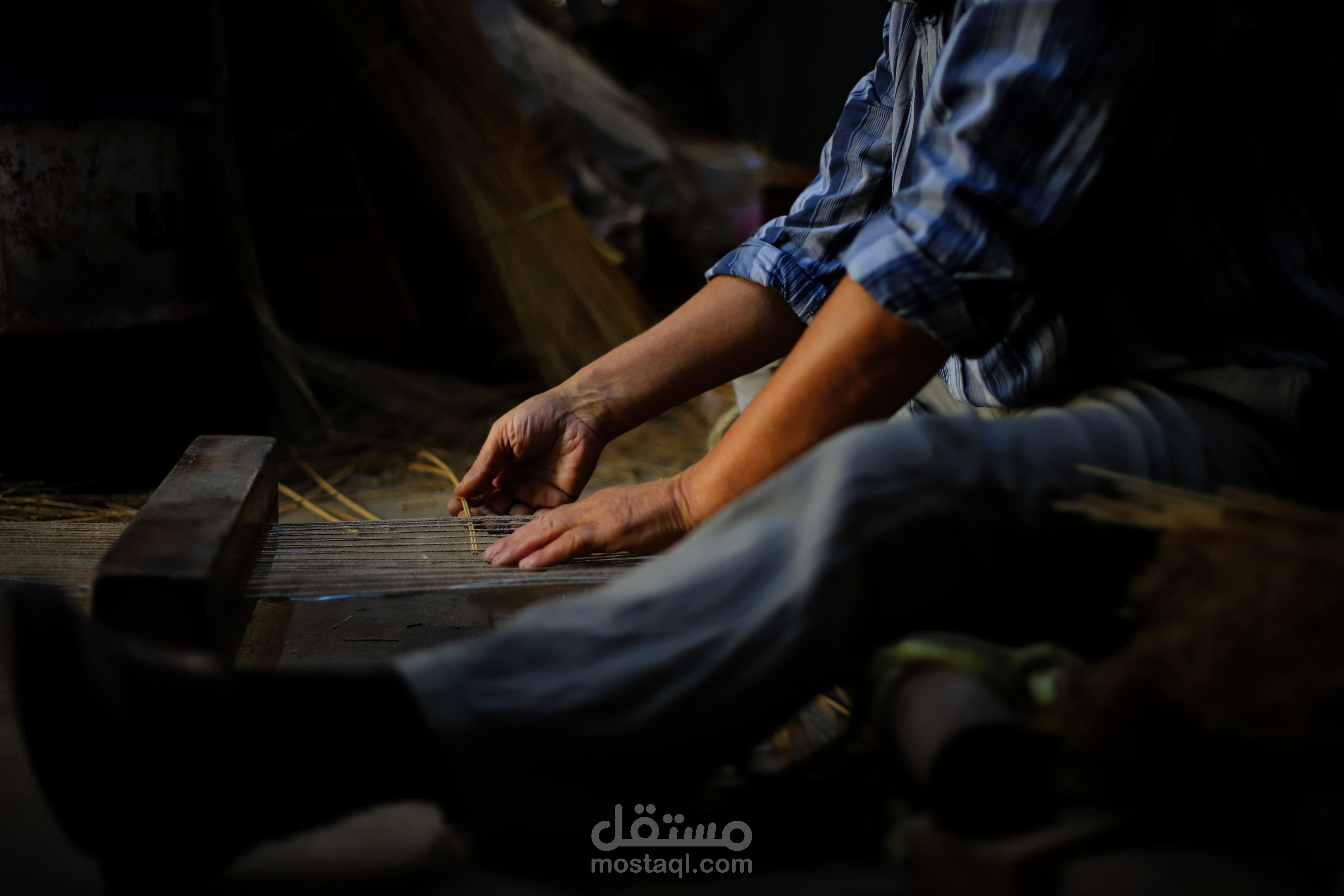 This photo captures a powerful and intimate moment in the life of a Tunisian artisan. The man, seated comfortably on the floor with legs apart, is deeply engaged in a traditional craft—most likely weaving or rope-making. His hands, roughened by years of labor, delicately work with natural fibers stretched in front of him.