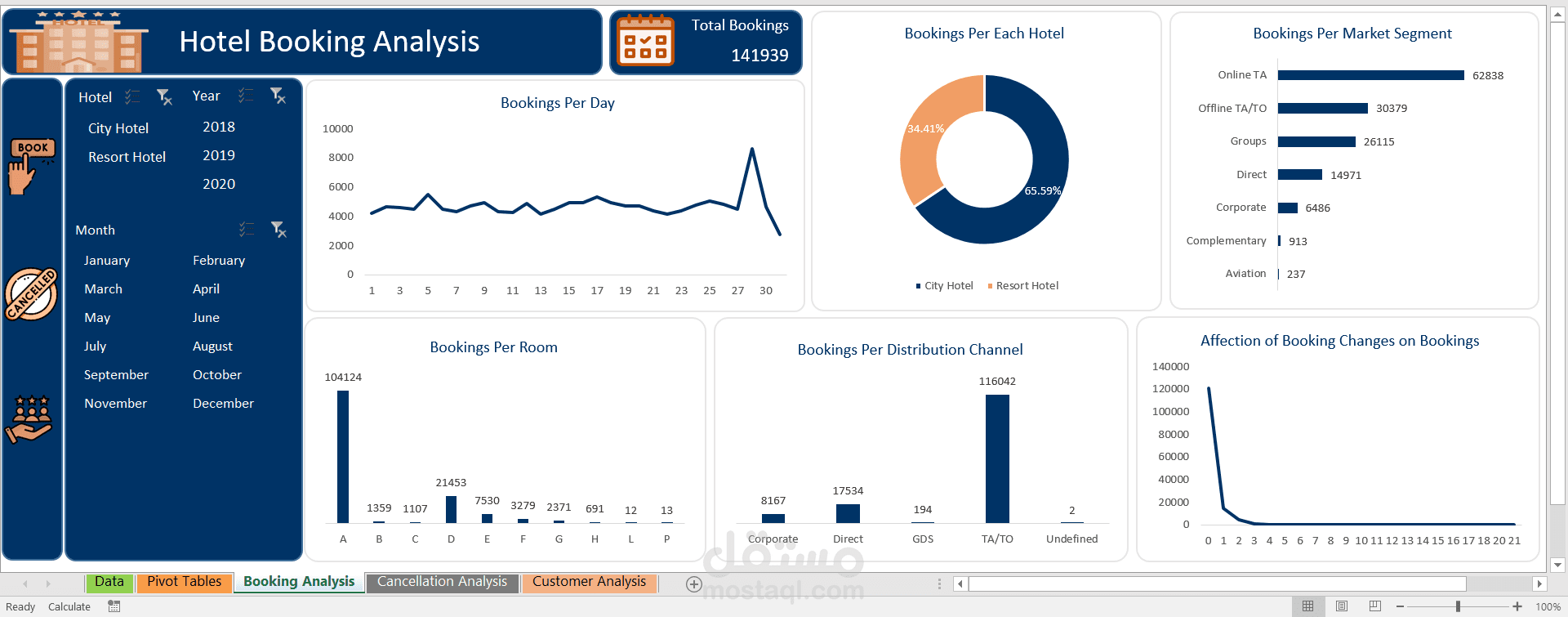 تحليل الحجوزات: عدد الحجوزات يوميًا، توزيعها حسب نوع الفندق، الغرف، القنوات التسويقية، والشرائح السوقية.