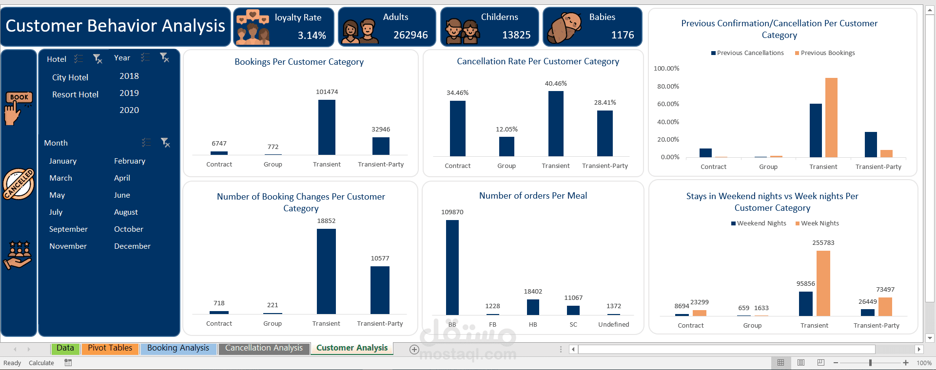 في هذا المشروع قمتُ بتصميم لوحة تفاعلية شاملة لتحليل بيانات حجوزات الفنادق على مدار 3 سنوات.