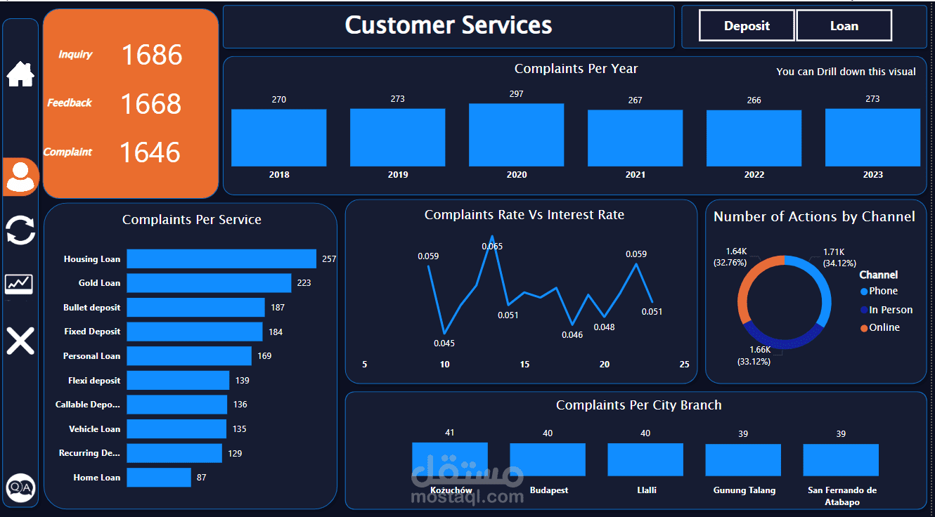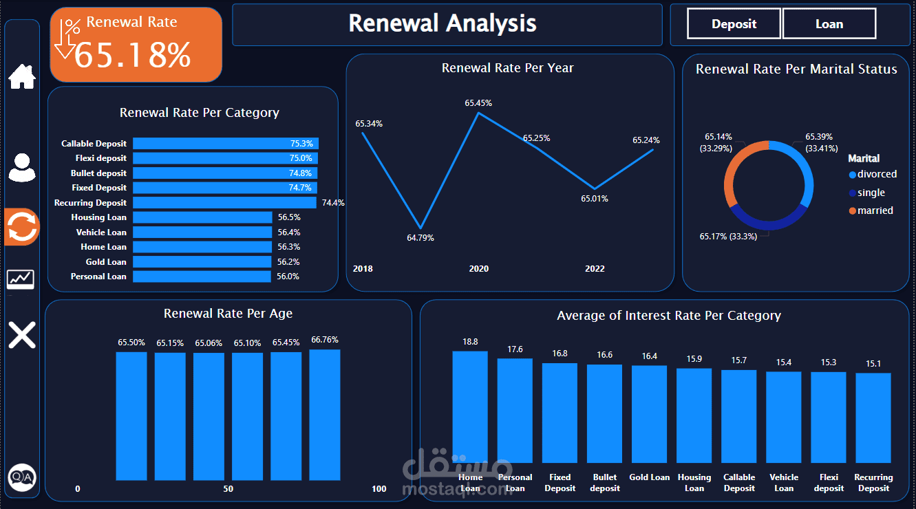 في هذا المشروع قمتُ بتصميم لوحة معلومات ديناميكية تفاعلية باستخدام Power BI لتحليل بيانات العملاء والبنك من حيث: