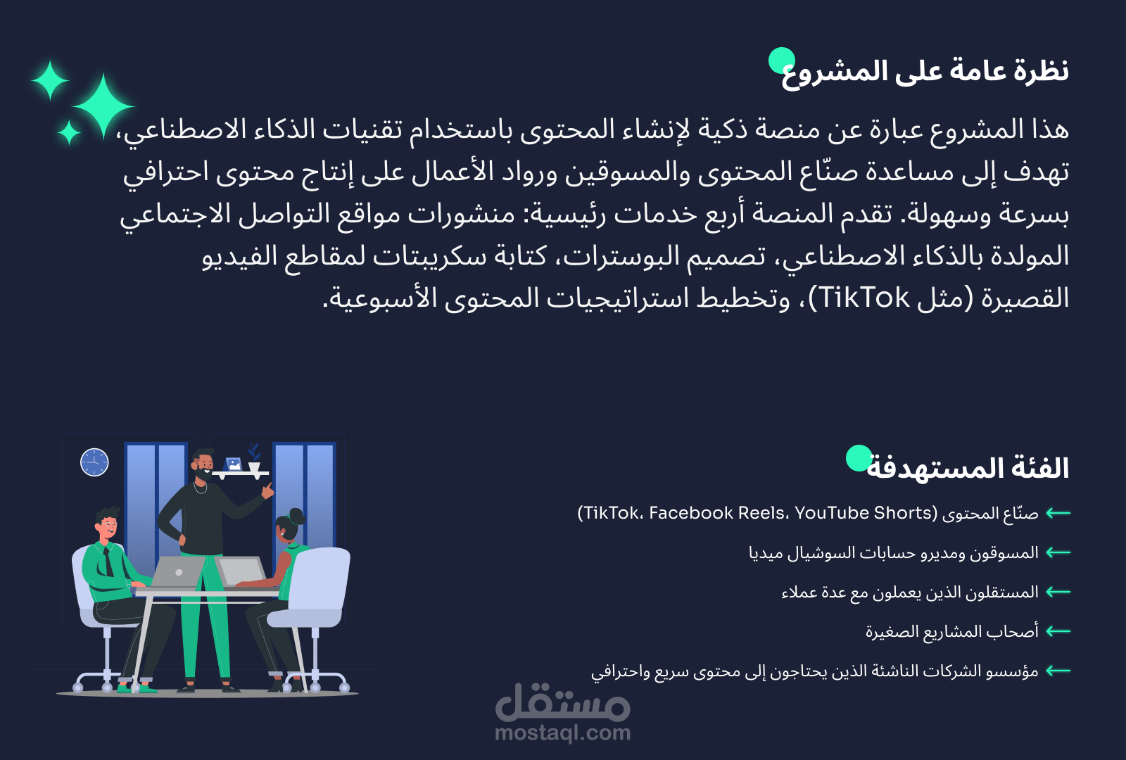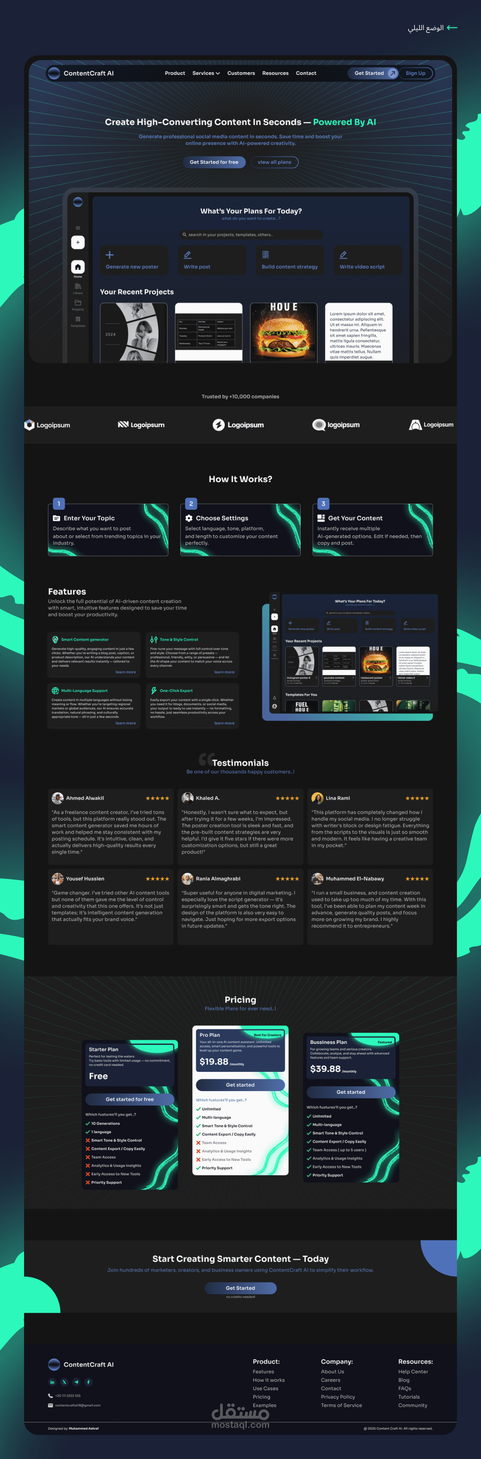 "Content Craft Ai" هي منصة ذكية لإنشاء المحتوى باستخدام تقنيات الذكاء الاصطناعي، تهدف إلى مساعدة صنّاع المحتوى والمسوقين ورواد الأعمال على إنتاج محتوى احترافي بسرعة وسهولة. تقدم المنصة أربع خدمات رئيسية: منشورات مواقع التواصل الاجتماعي المولدة بالذكاء الاصطناعي، تصميم البوسترات، كتابة سكريبتات لمقاطع الفيديو القصيرة (مثل TikTok)، وتخطيط استراتيجيات المحتوى الأسبوعية.