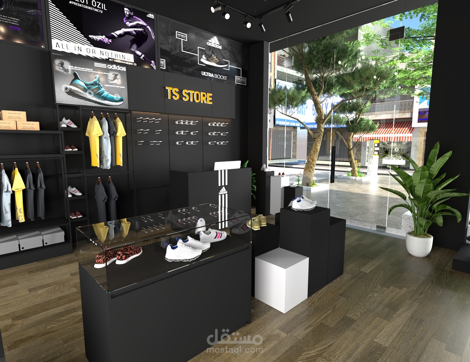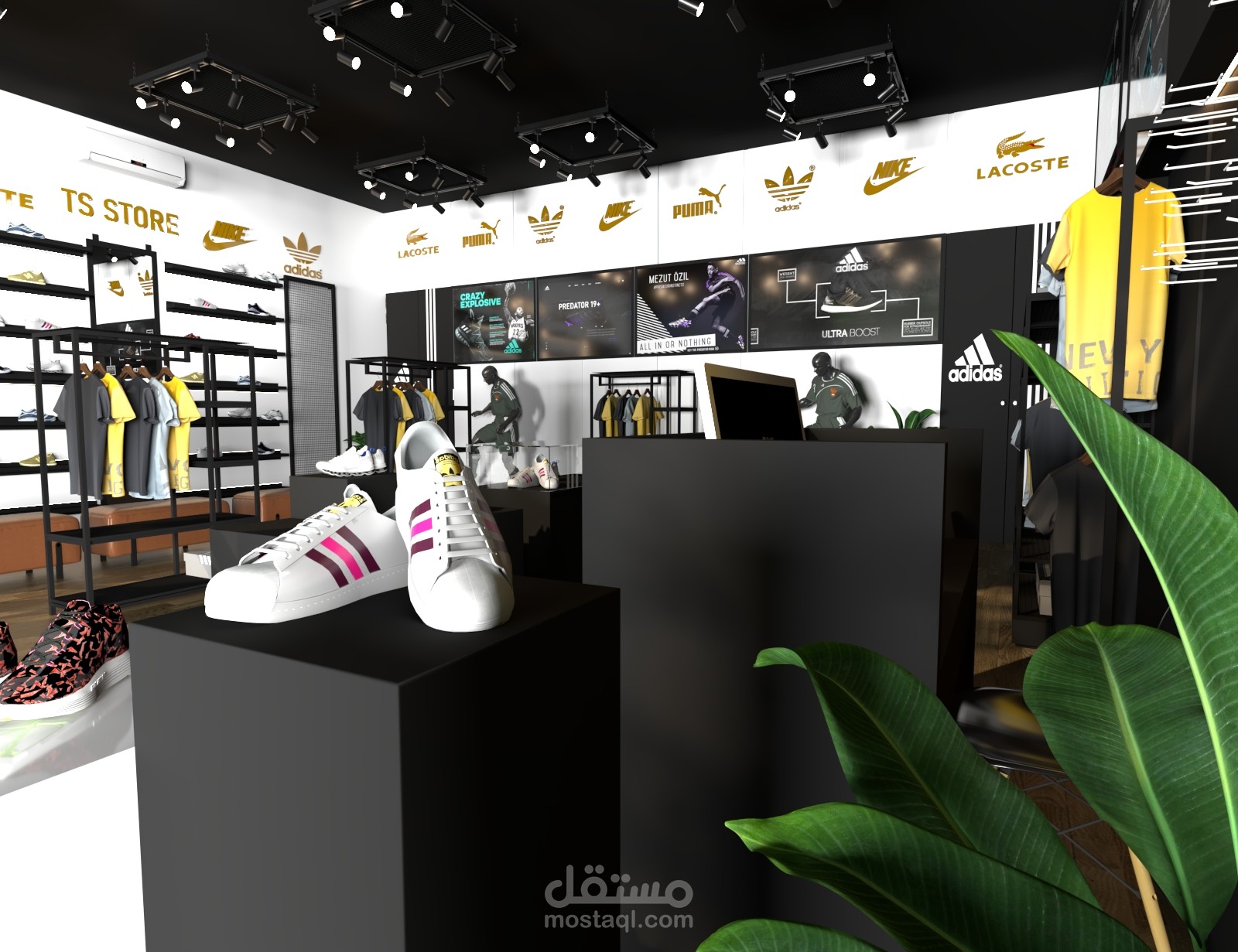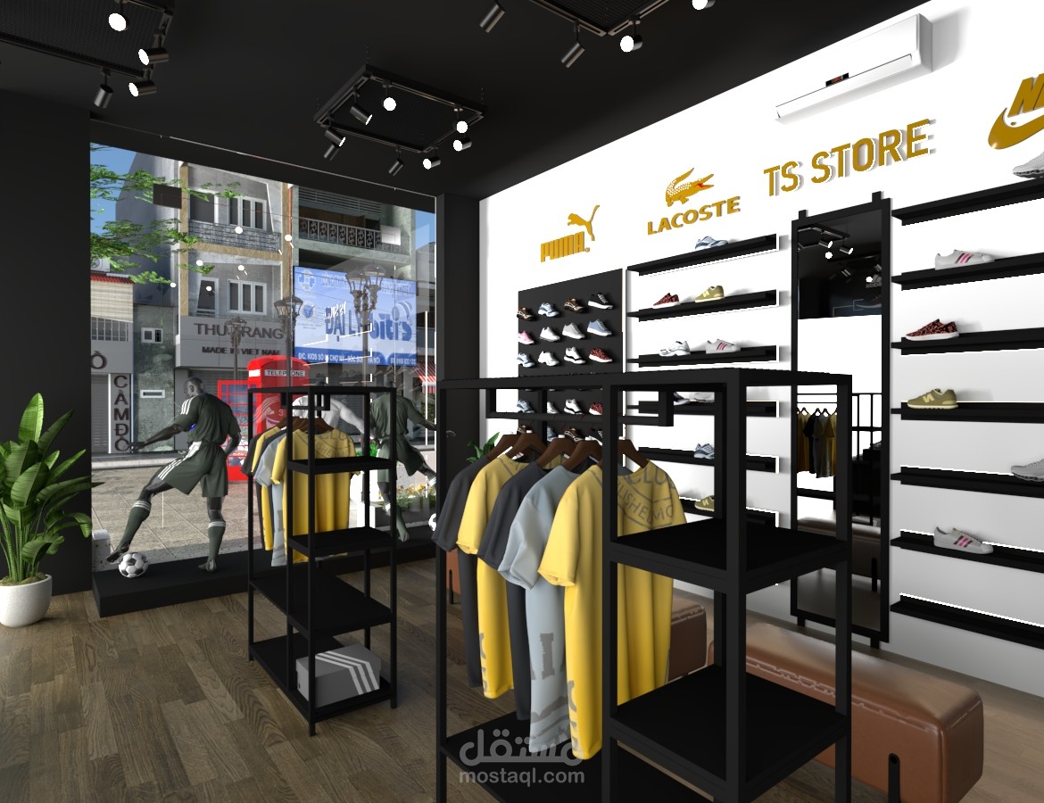 تصميم داخلي عصري لمحل رياضي يعرض أحذية وملابس من أشهر الماركات مثل Nike وAdidas، باستخدام ألوان داكنة ولمسات ذهبية تعكس الفخامة. تم توزيع الإضاءة بشكل مدروس لتسليط الضوء على المنتجات، مع استخدام وحدات عرض بسيطة وأنيقة تُبرز كل قطعة.