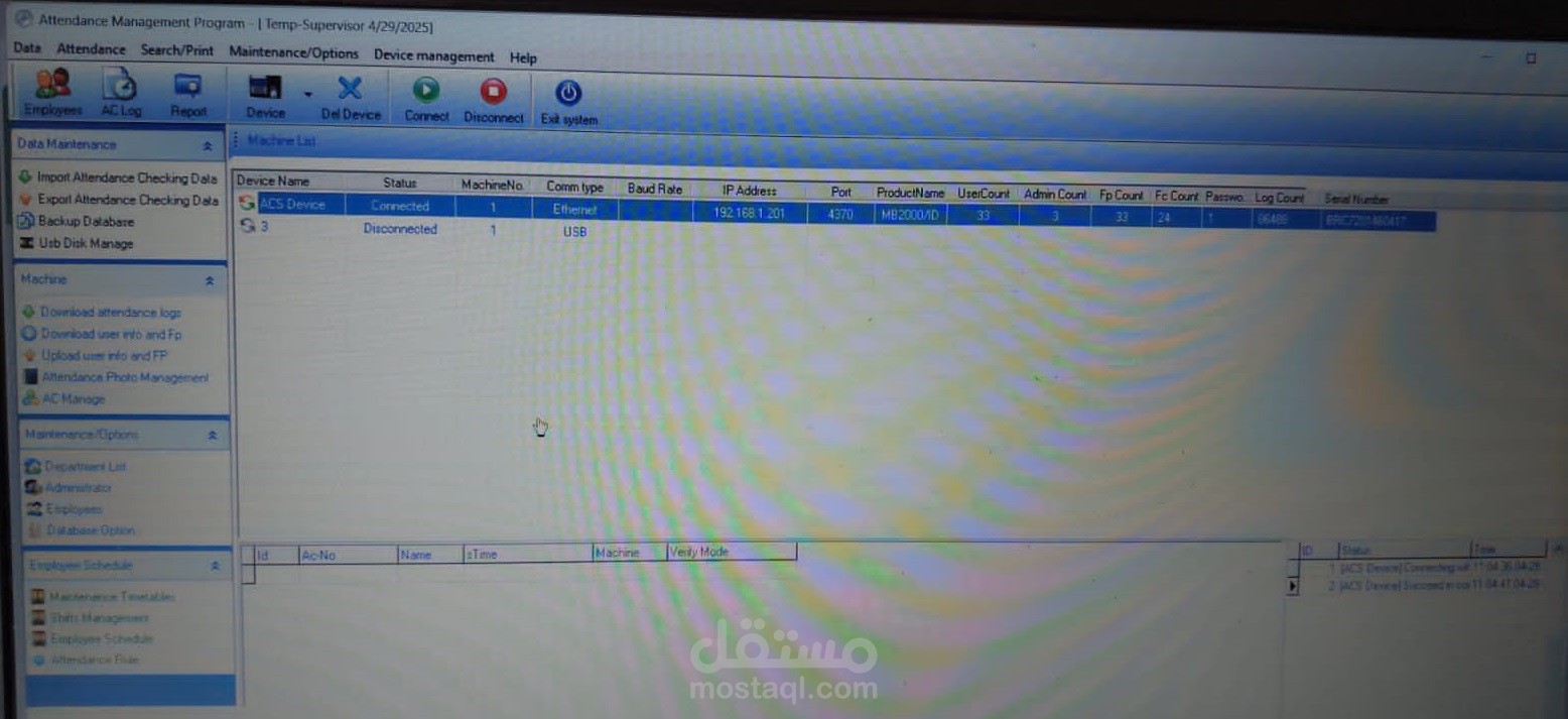 العمل : تشغيل جهازين بصمه الحضور والانصراف فى محافظتين مختلفتين على كمبيوتر واحد .